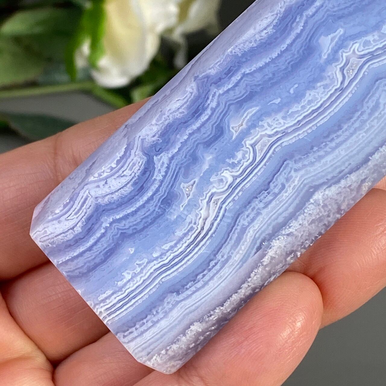 ブルーレースアゲート(和名:空色縞瑪瑙)のポイントになります。その洗練されたレース模様の美しさと、心を穏やかにさせてくれる澄んだ青と水色が非常に優しく、このため息が出てしまう程麗しく、美しい姿をしています。アゲートの中でも算出量が少なく、世界中に愛好家がいるため、高値で取引されています。
