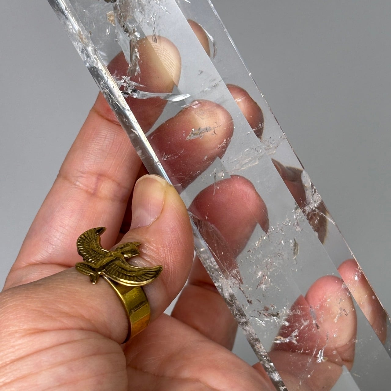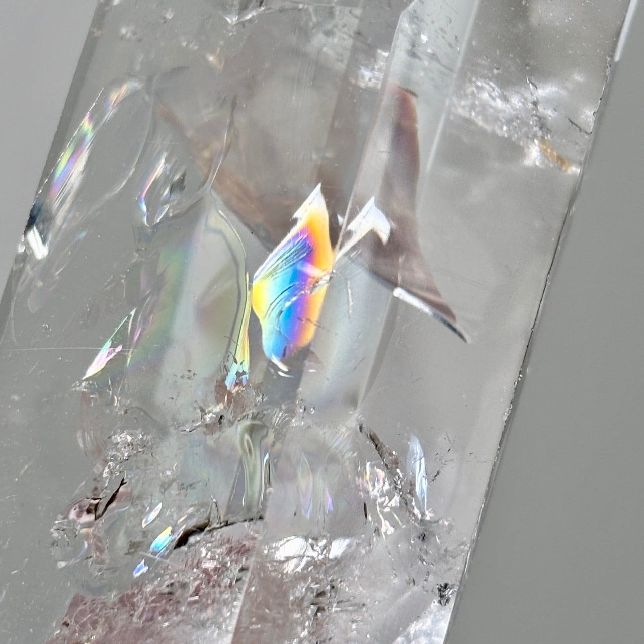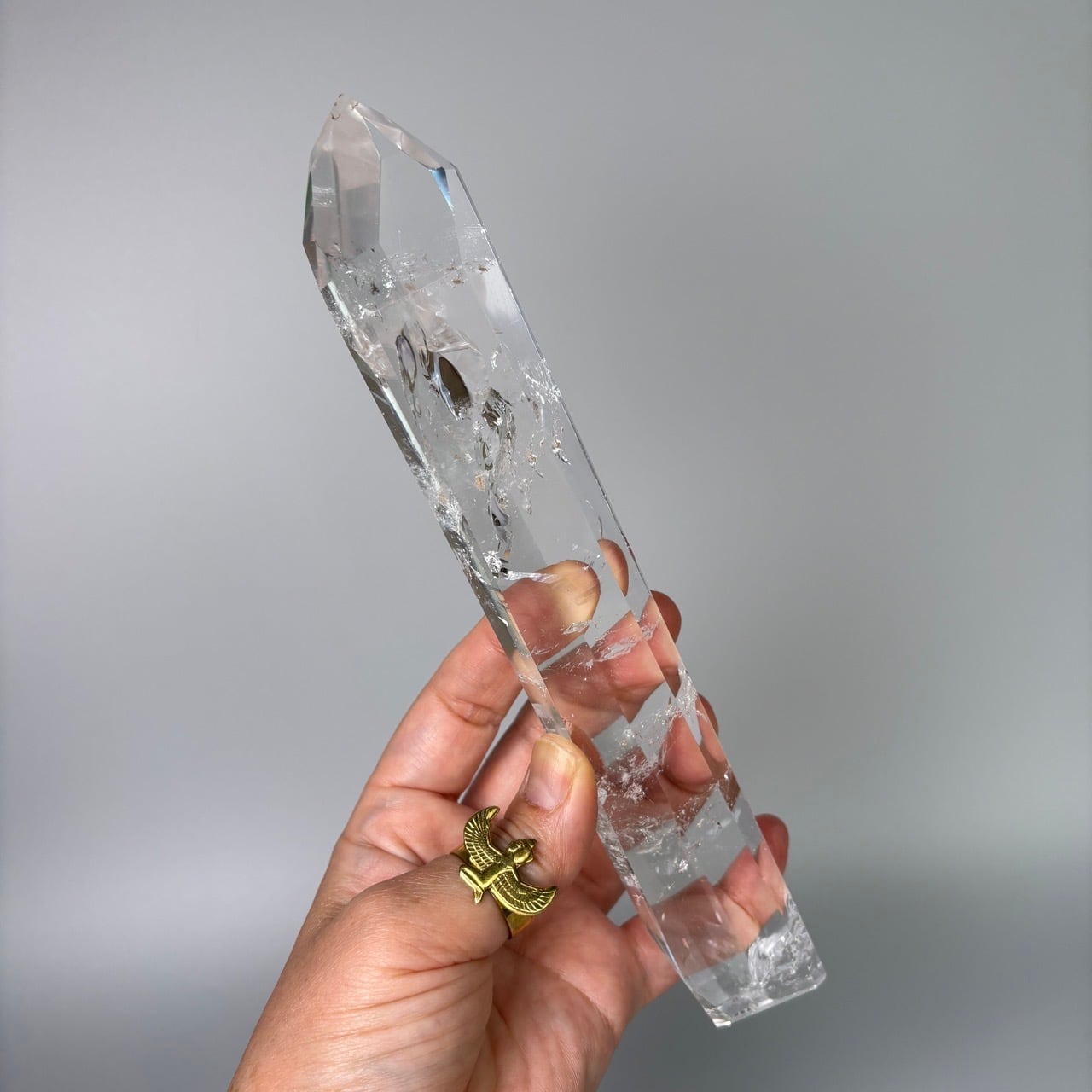 ポリッシュされている(磨かれている)ためリッジ(条線)は無いものの、手に握るとワンドとしてヒーリングやコードカッティングなどにも使用できる実用性があり、タビュラーな(フラットな)形状により握りやすさも兼ね備えています。圧倒的な透明度の高さ、そして幅の広い柱面からメタリックな虹も楽しめます♡