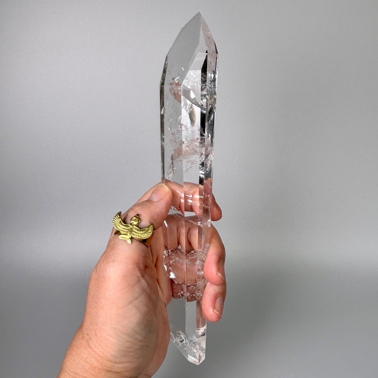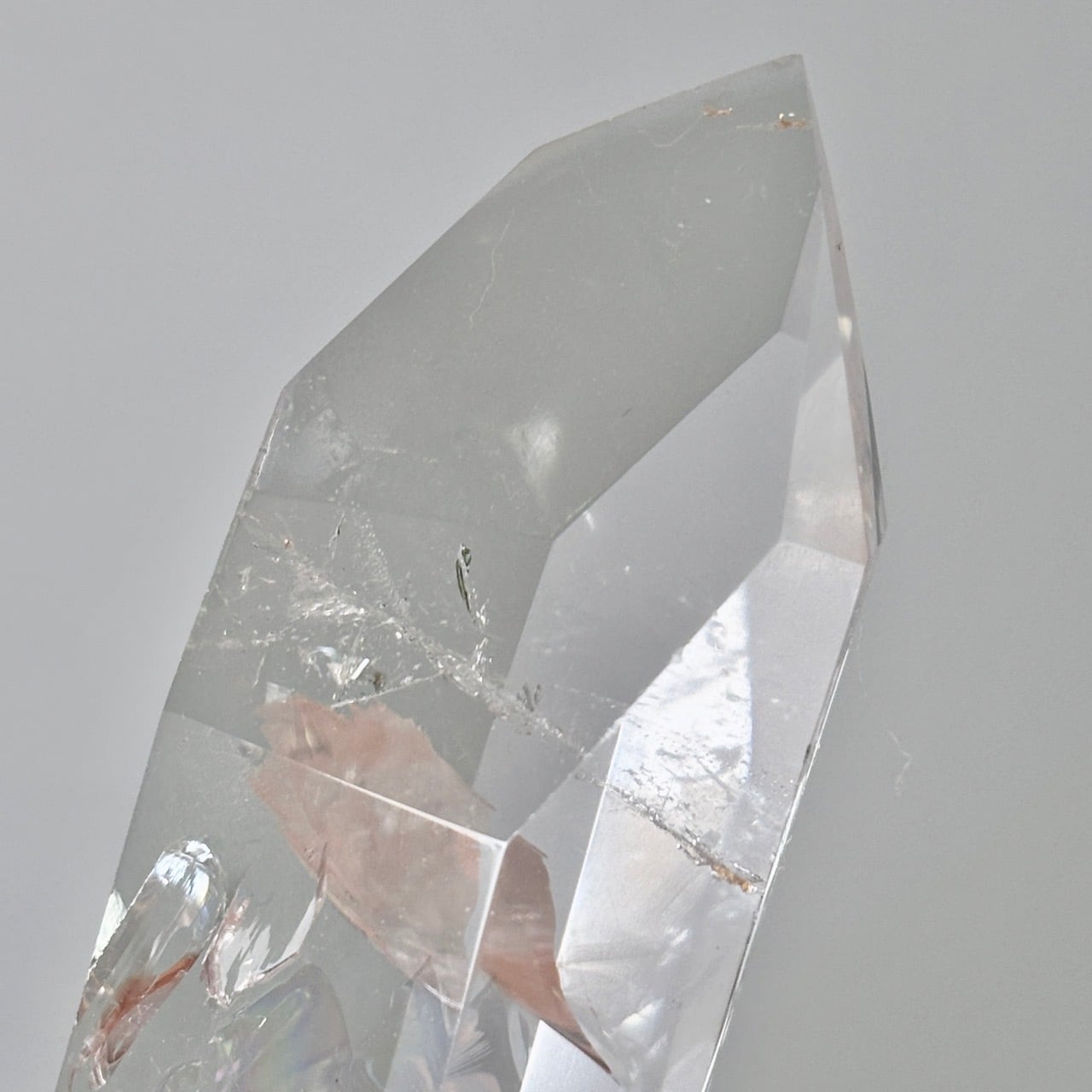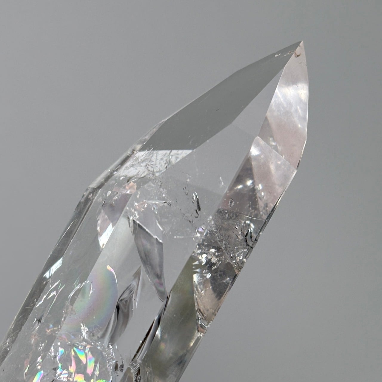 ポリッシュされている(磨かれている)ためリッジ(条線)は無いものの、手に握るとワンドとしてヒーリングやコードカッティングなどにも使用できる実用性があり、タビュラーな(フラットな)形状により握りやすさも兼ね備えています。圧倒的な透明度の高さ、そして幅の広い柱面からメタリックな虹も楽しめます♡