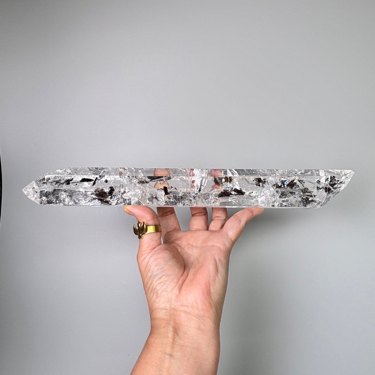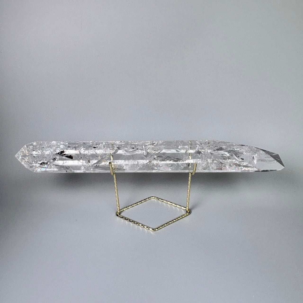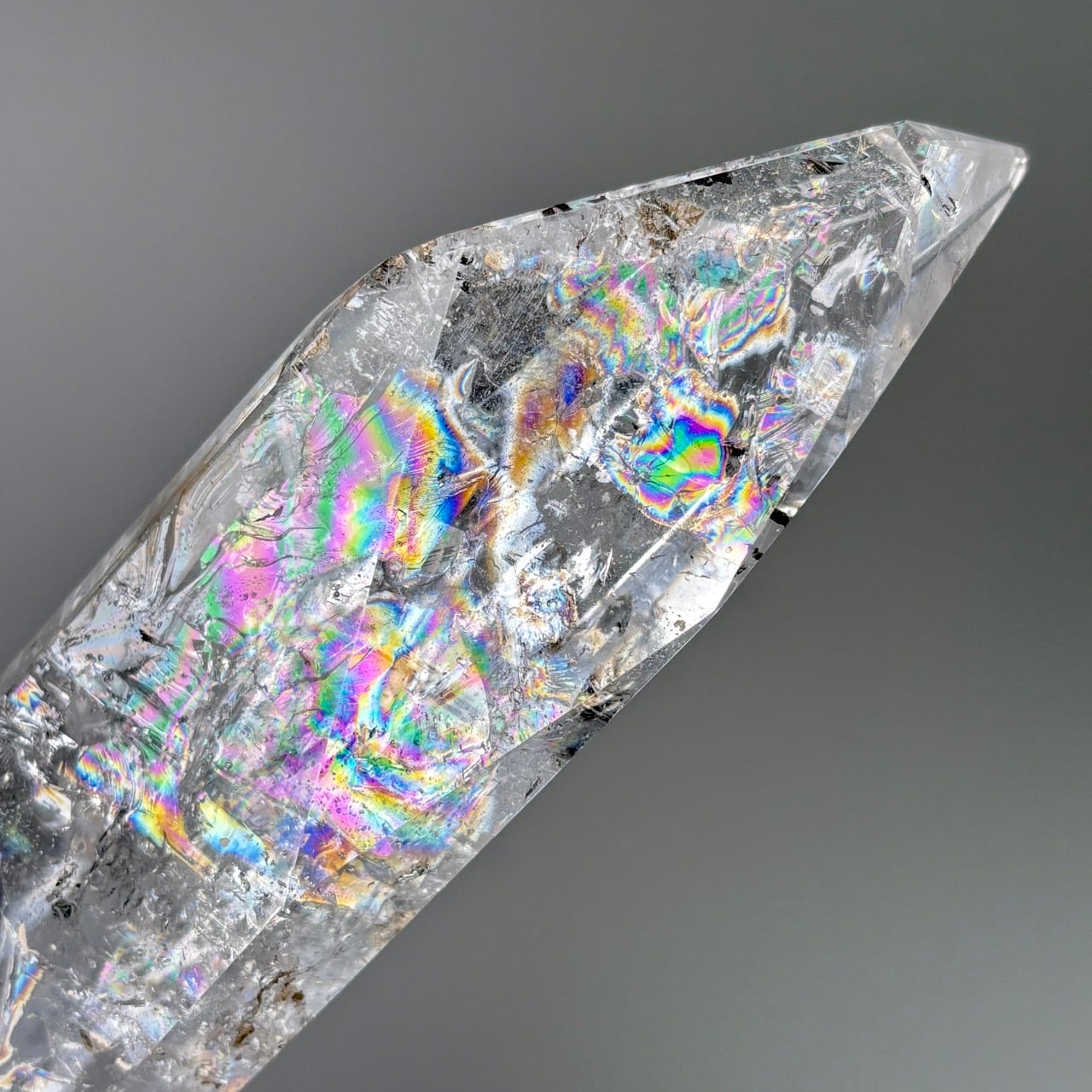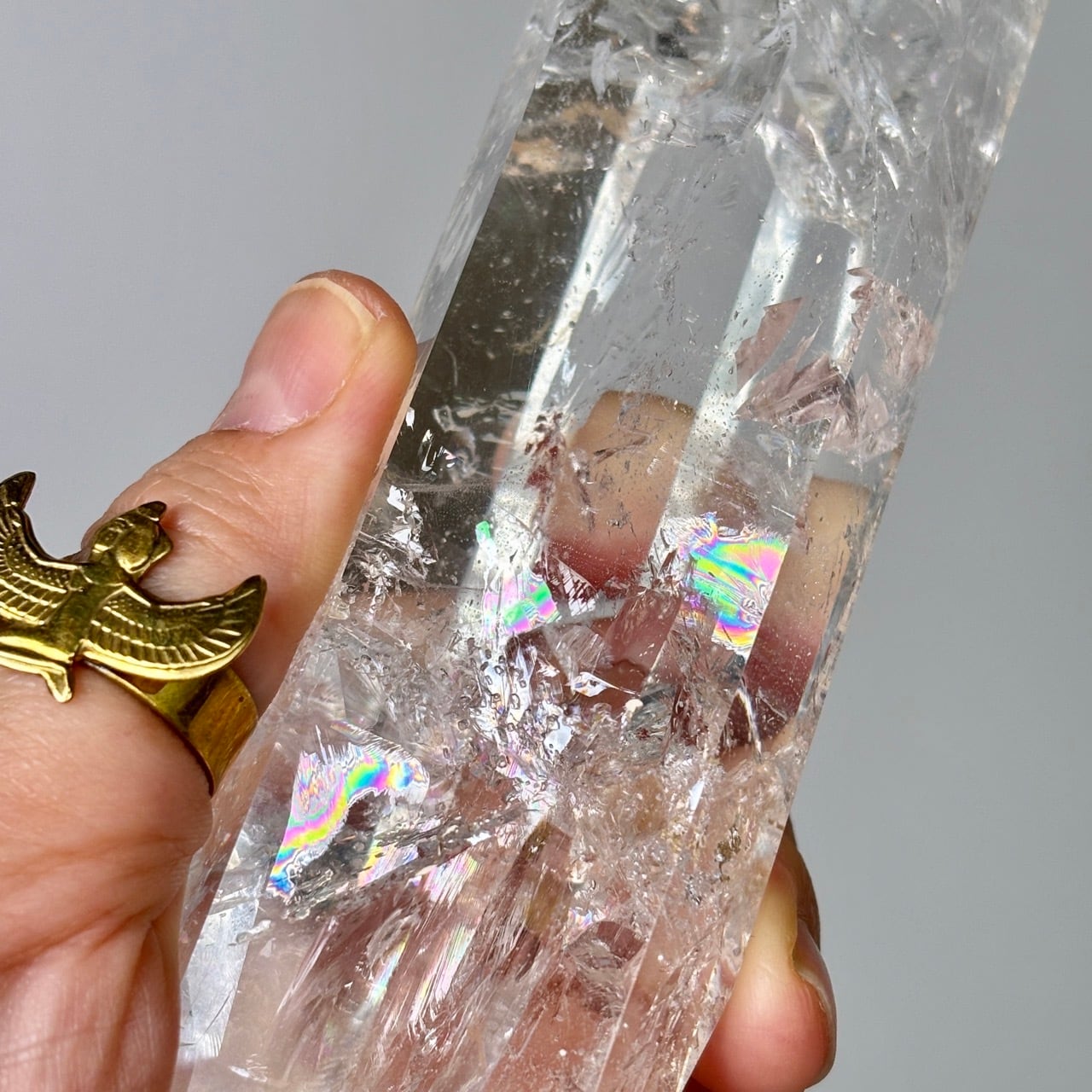 ポリッシュされている(磨かれている)ためリッジ(条線)は無いものの、透過性が高い水晶でキラキラを超えてギランギラン♡とした虹が多数みられ、その場をボルテックスに変えてしまうような存在感のある子です。手で握ってその長さと重量を感じながら、虹をお楽しみ下さい。