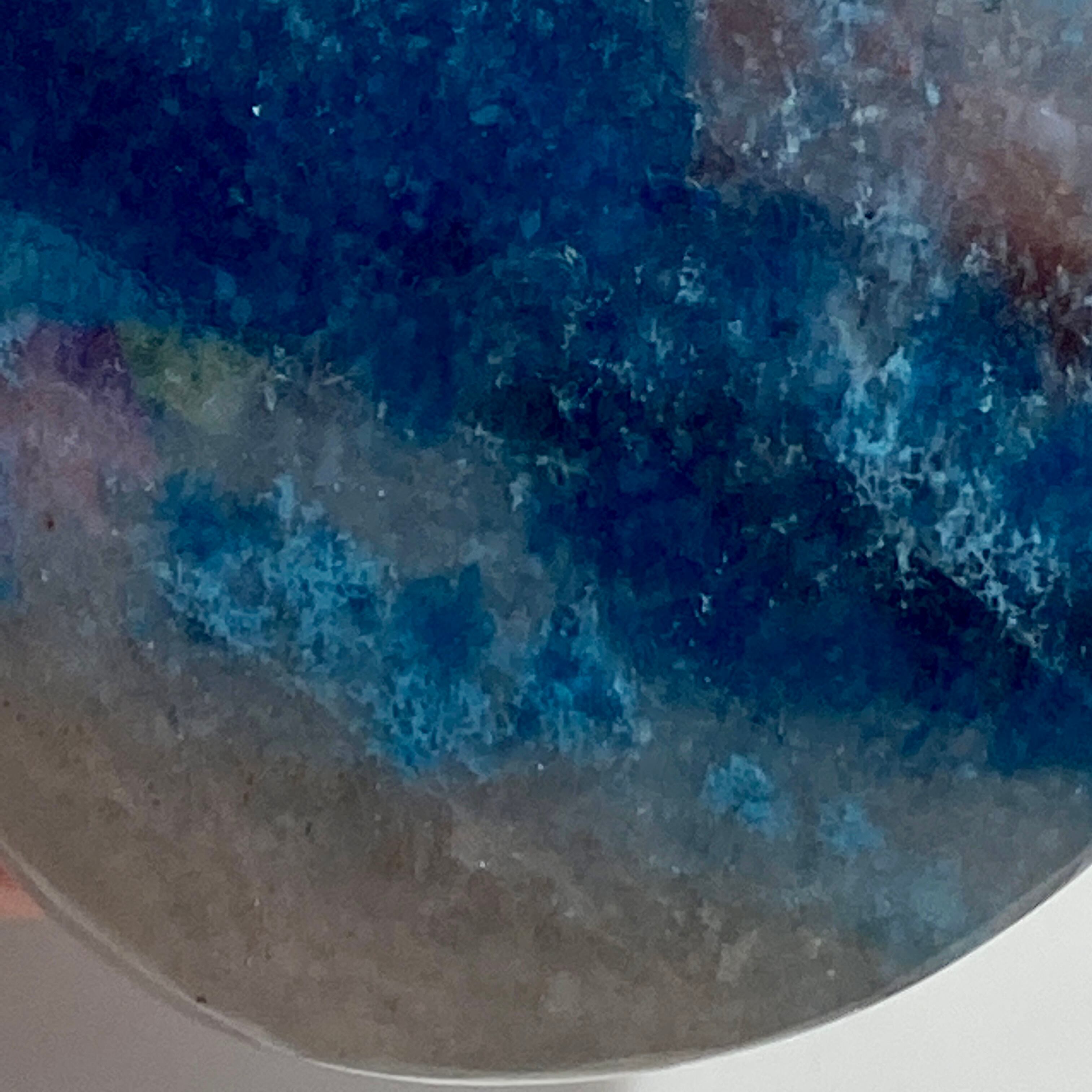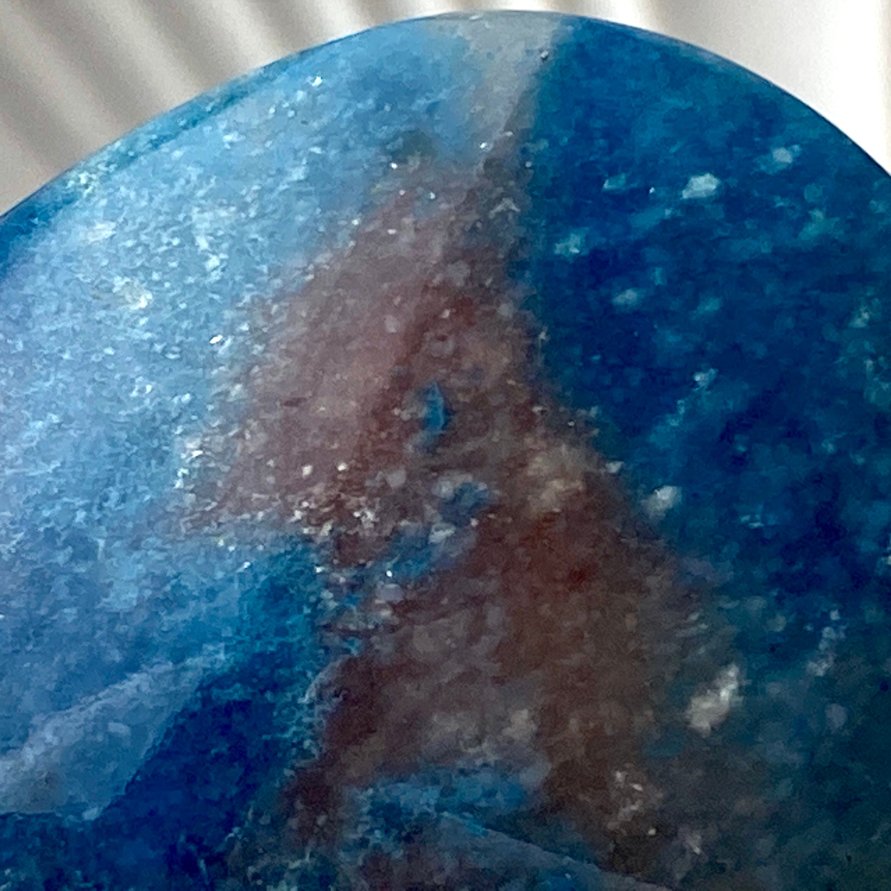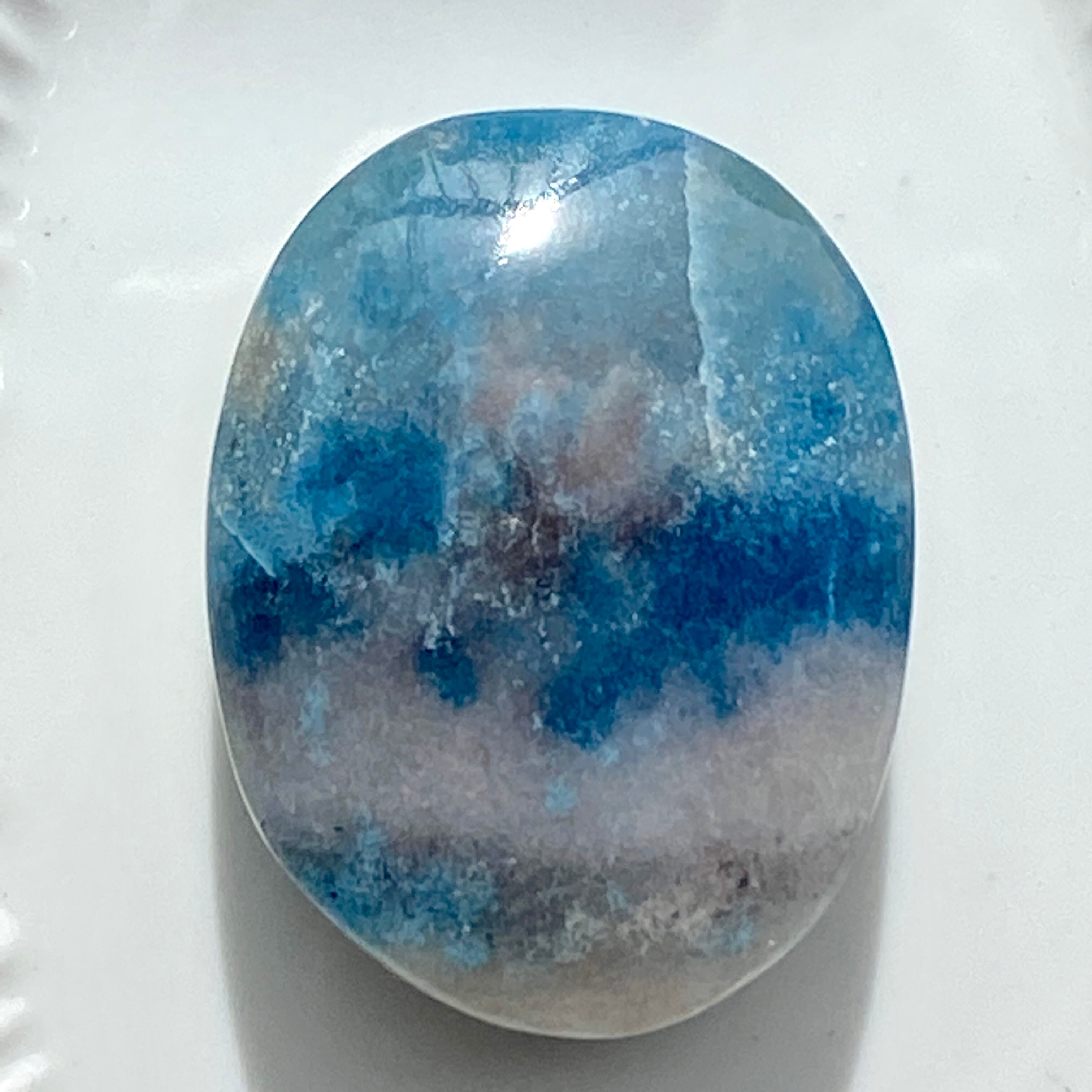 ぷっくりして丸みを帯びた、グレーがかった白っぽいクォーツをベースに青の濃淡の模様入りのパームストーン。半透明の部分に赤みがかった色が見えている部分があります。清涼感のあるカラーコンビネーションと模様が絶妙なハーモニーを奏でていて可愛い♡です。
