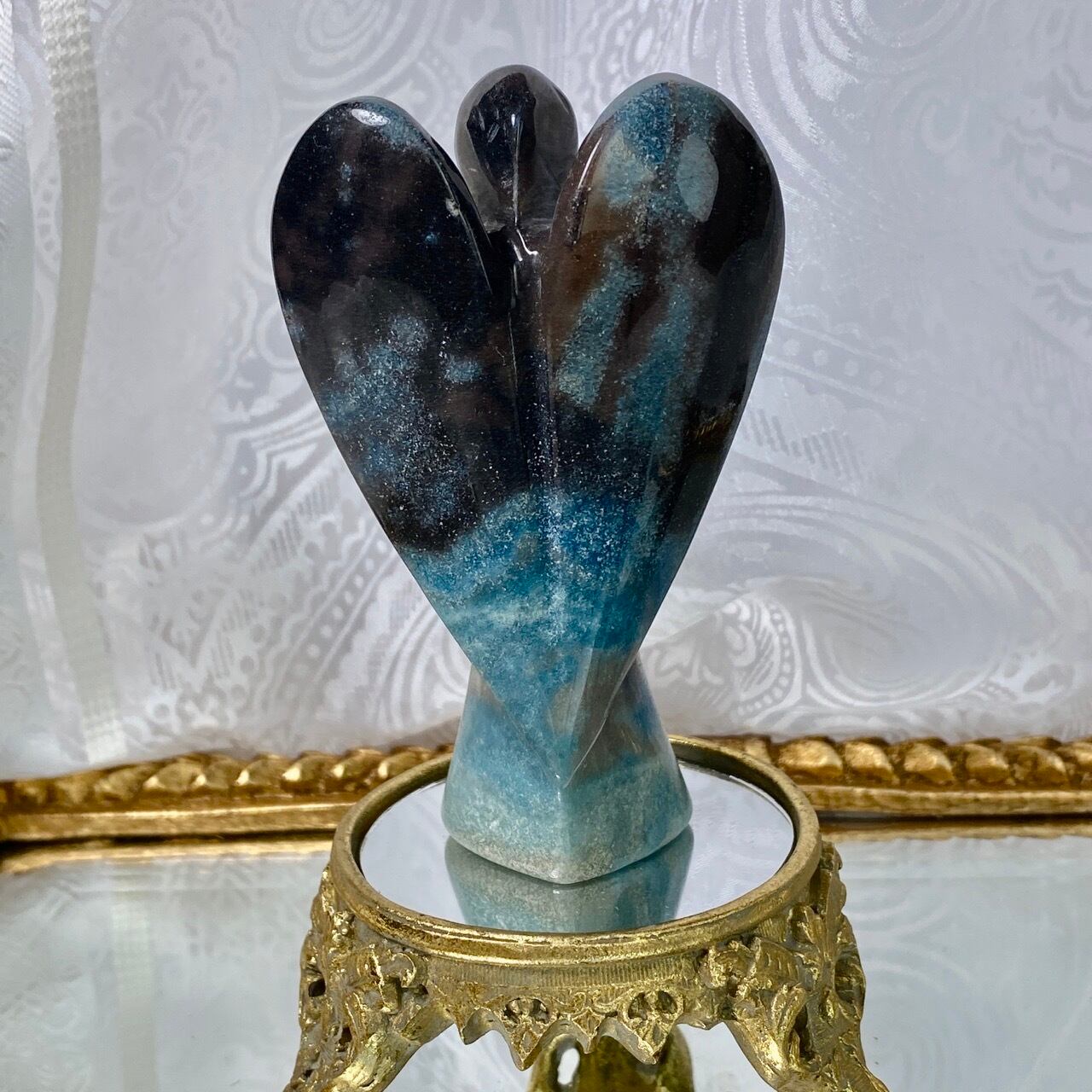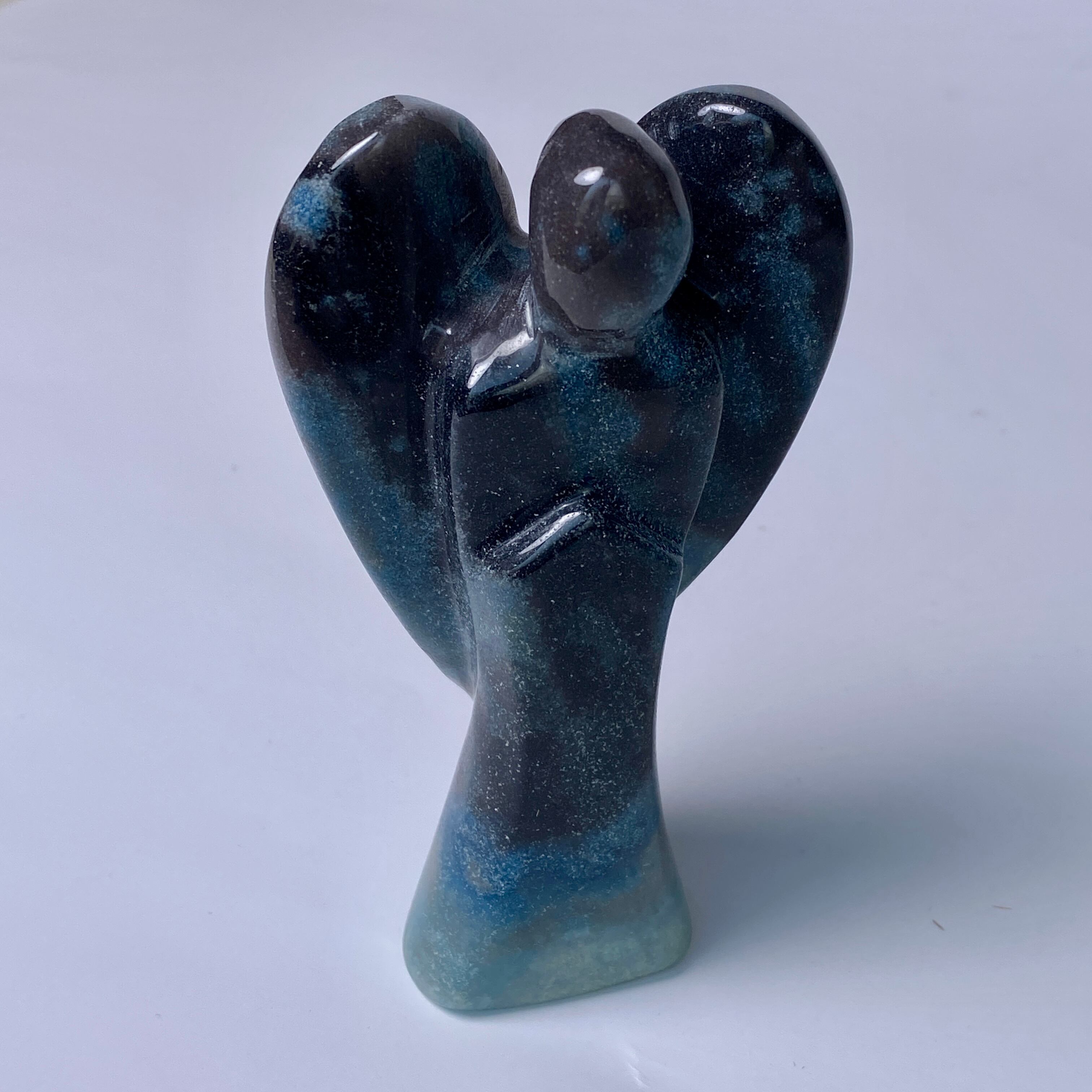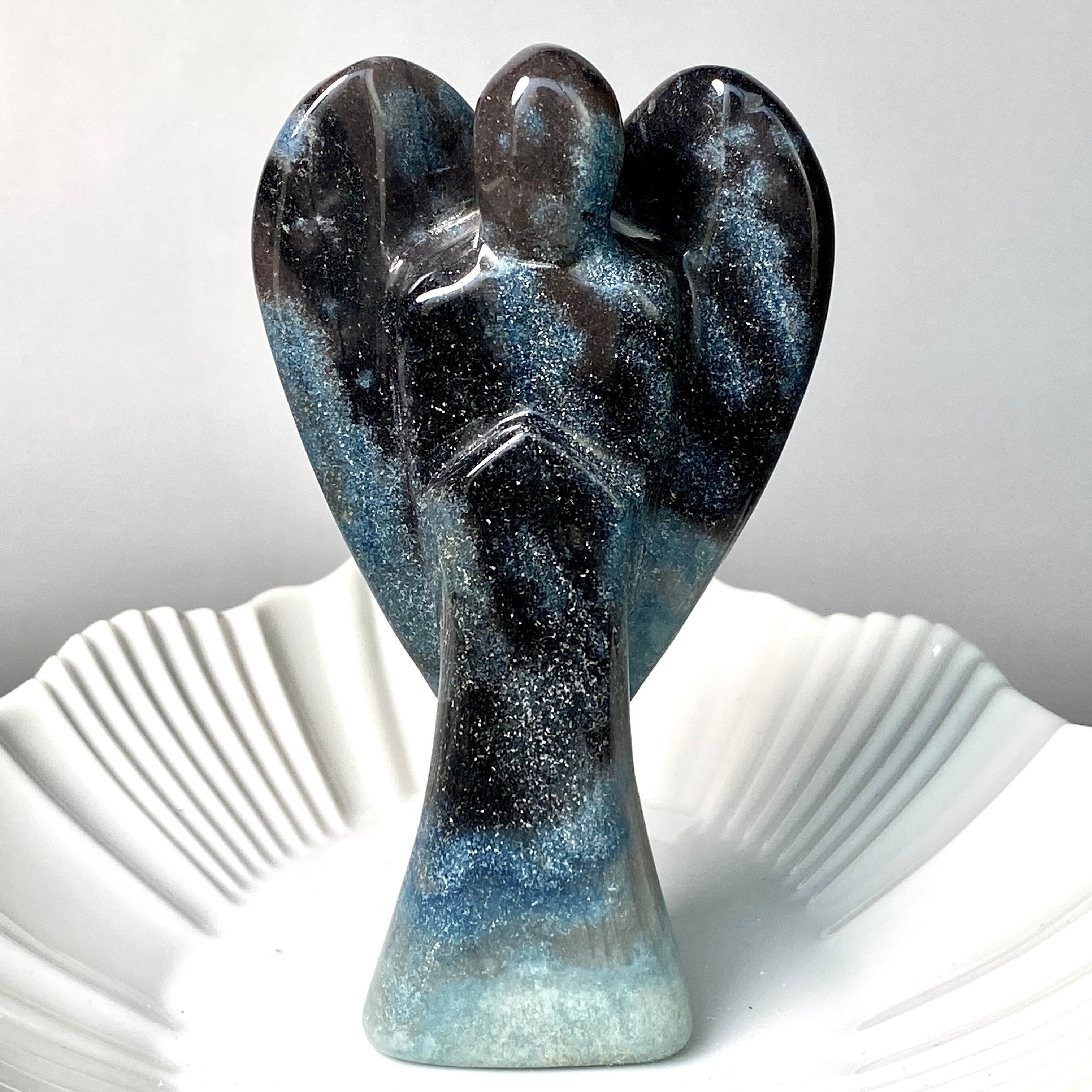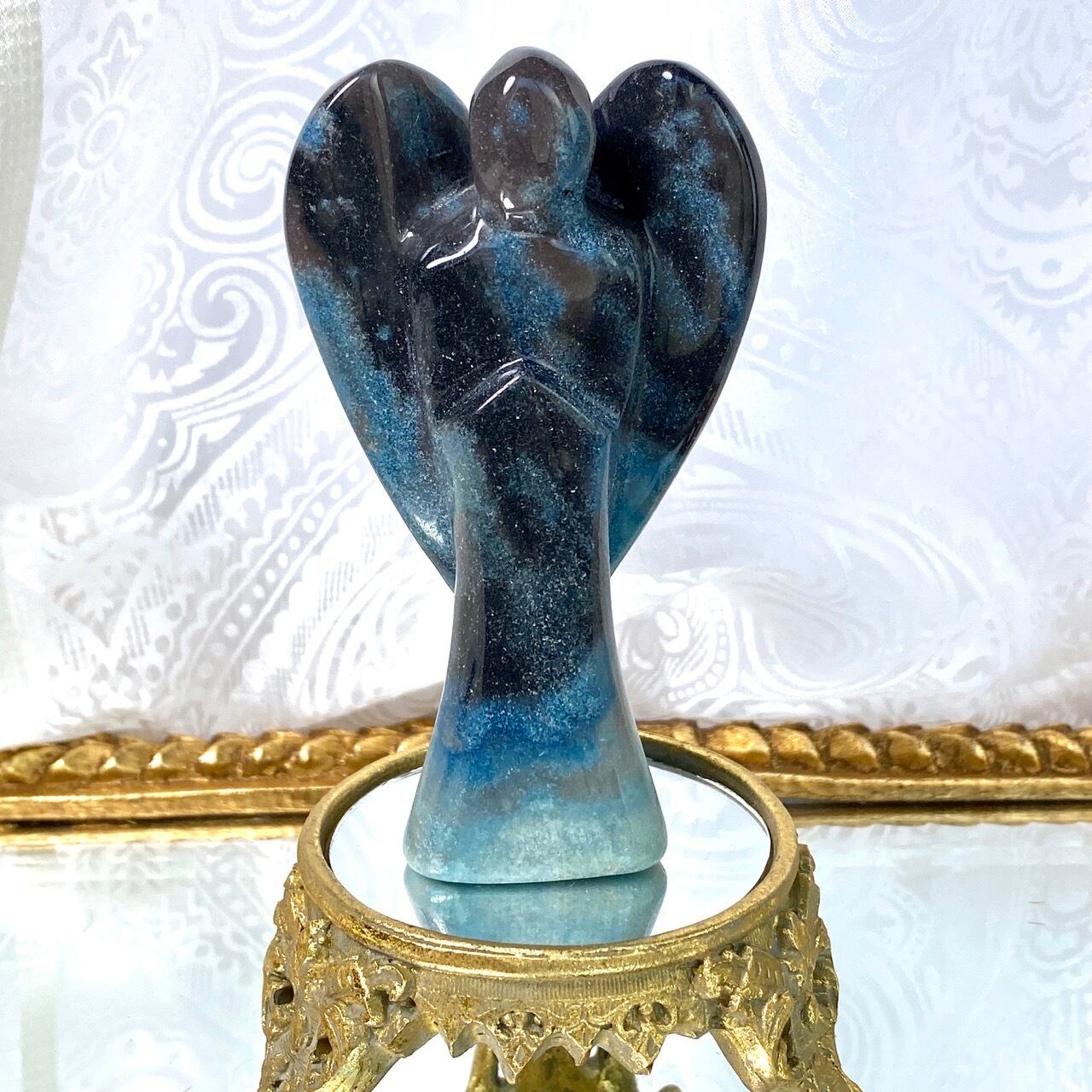 天使にはソフトな色味のイメージがつきものですが、敢えてダーク系の色味がメインのものを選びました。何故なら青の濃淡の模様が断然映えるからです。濃紺にブラウン系グレーの差し色も入っていて、ところどころに青の濃淡の模様があり格好良い感じです。
