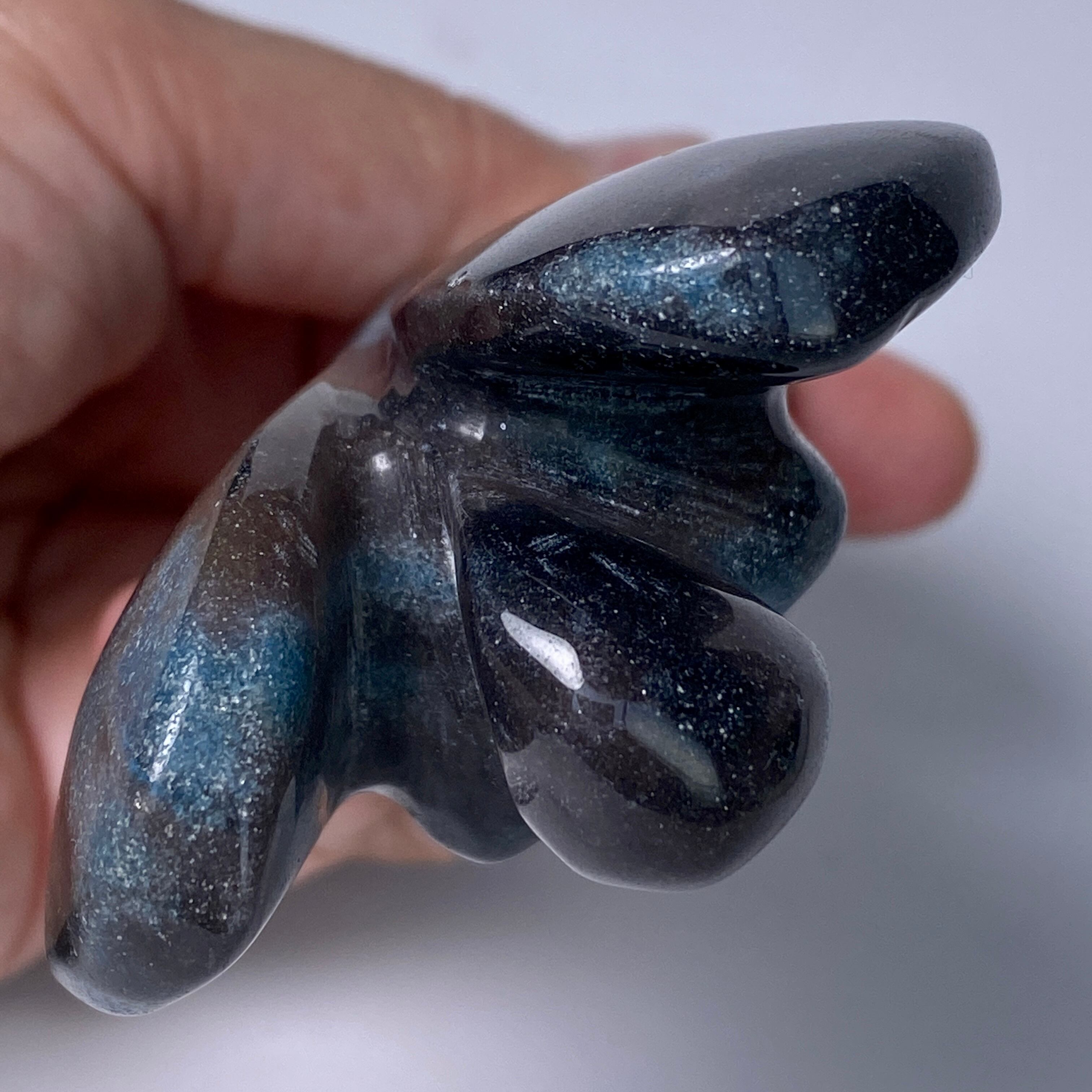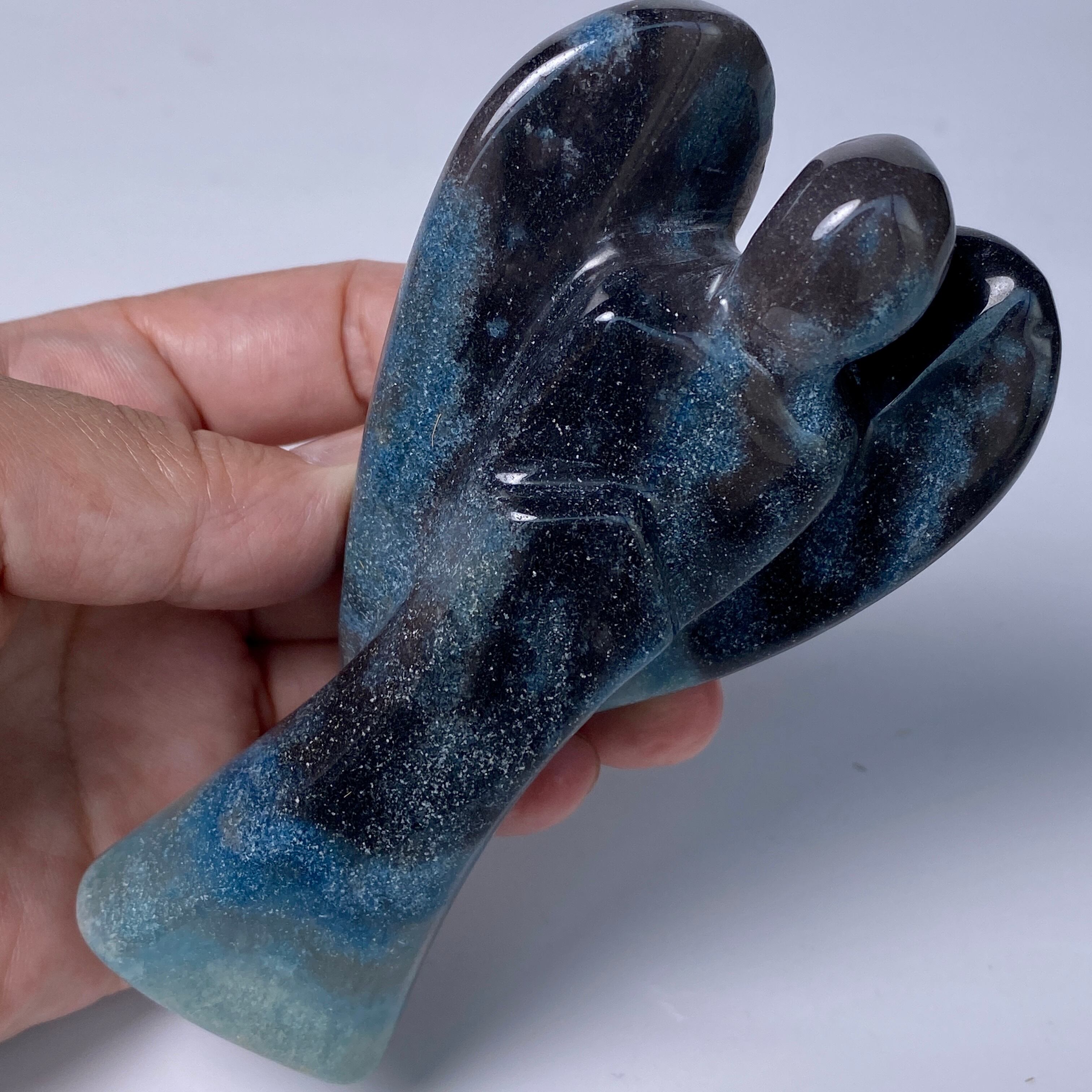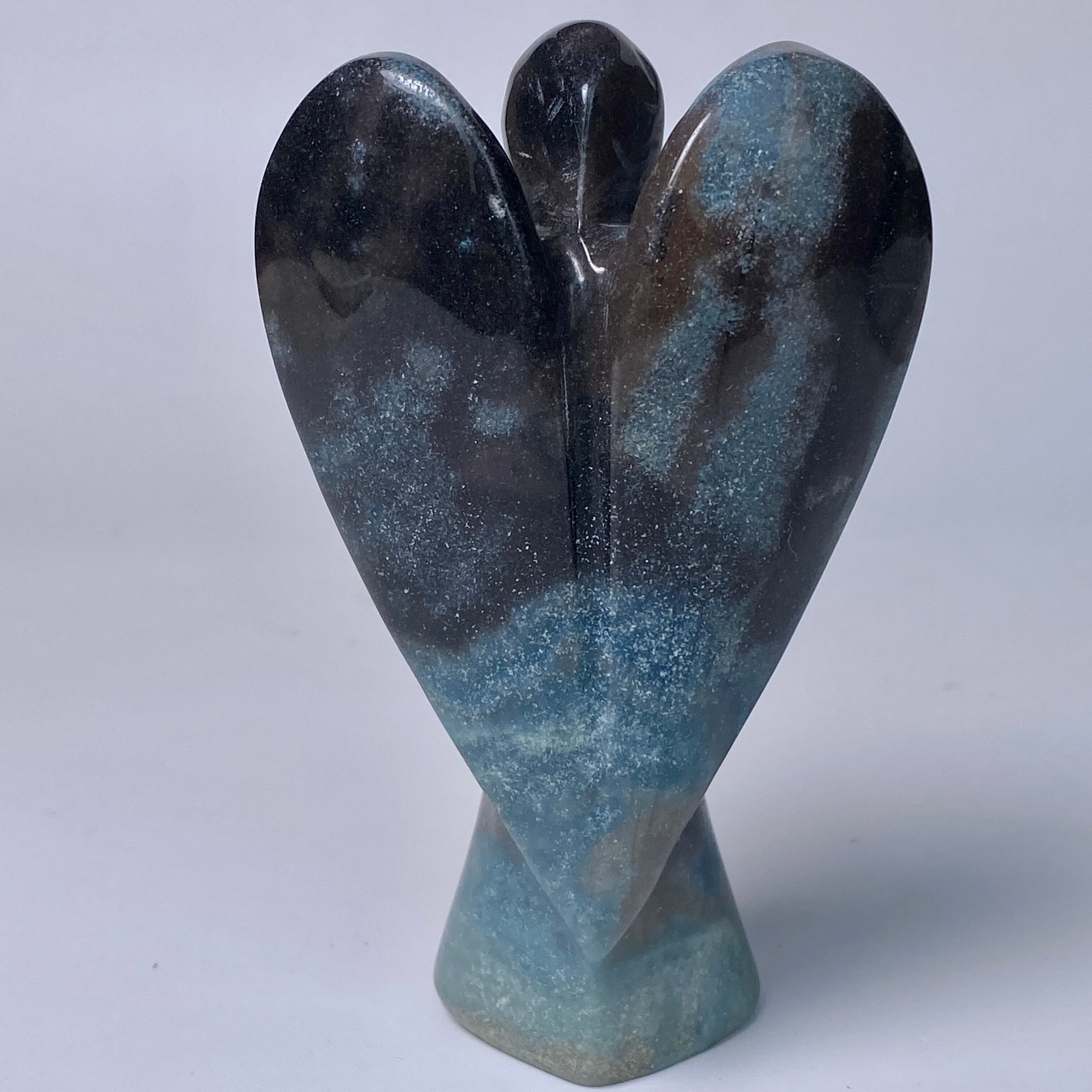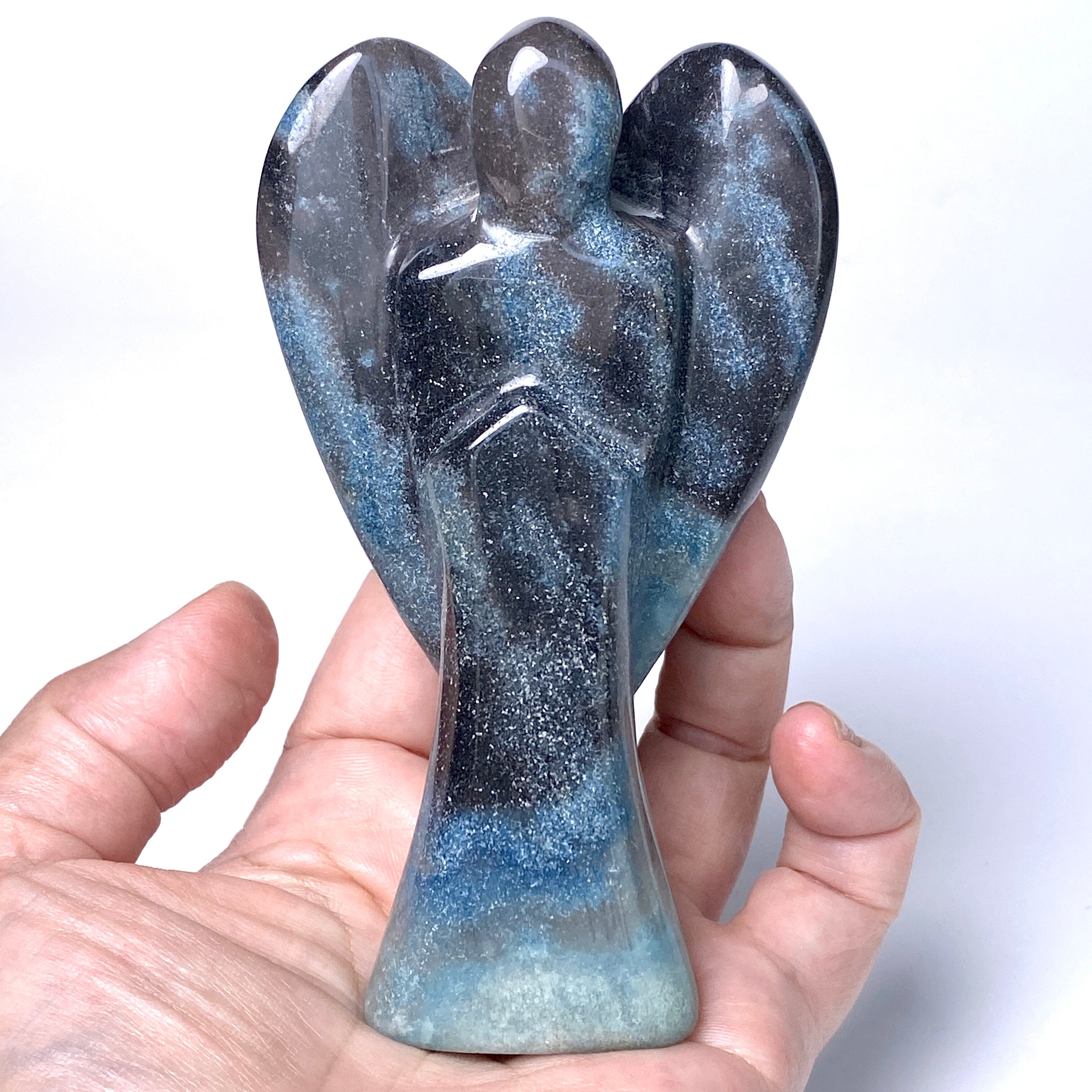 天使にはソフトな色味のイメージがつきものですが、敢えてダーク系の色味がメインのものを選びました。何故なら青の濃淡の模様が断然映えるからです。濃紺にブラウン系グレーの差し色も入っていて、ところどころに青の濃淡の模様があり格好良い感じです。