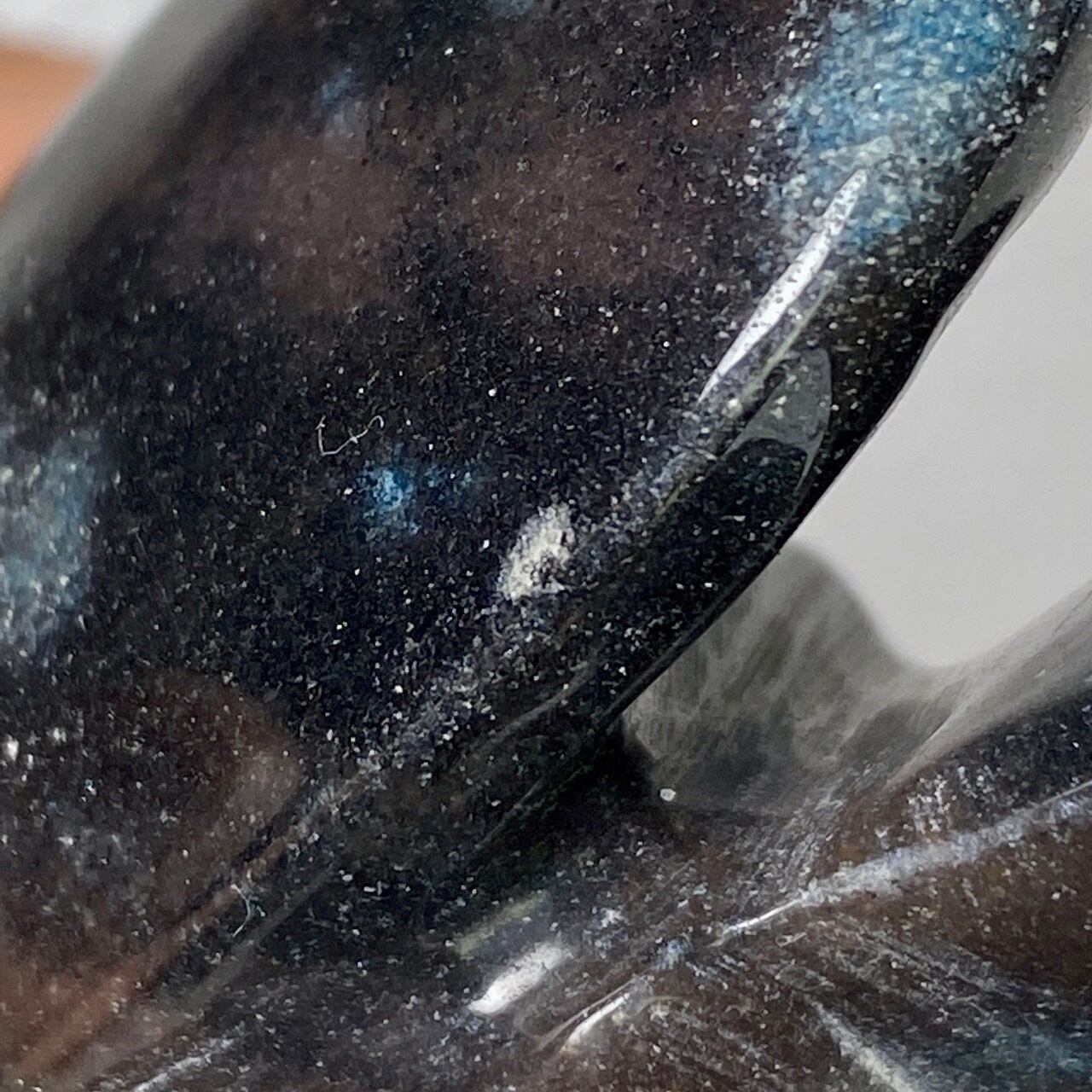 左側の羽(首の裏辺り)に2mm程白っぽくなっており箇所があり、指で触れると僅かに凹んでいおりますので、最後から2番目の画像をご確認下さい。