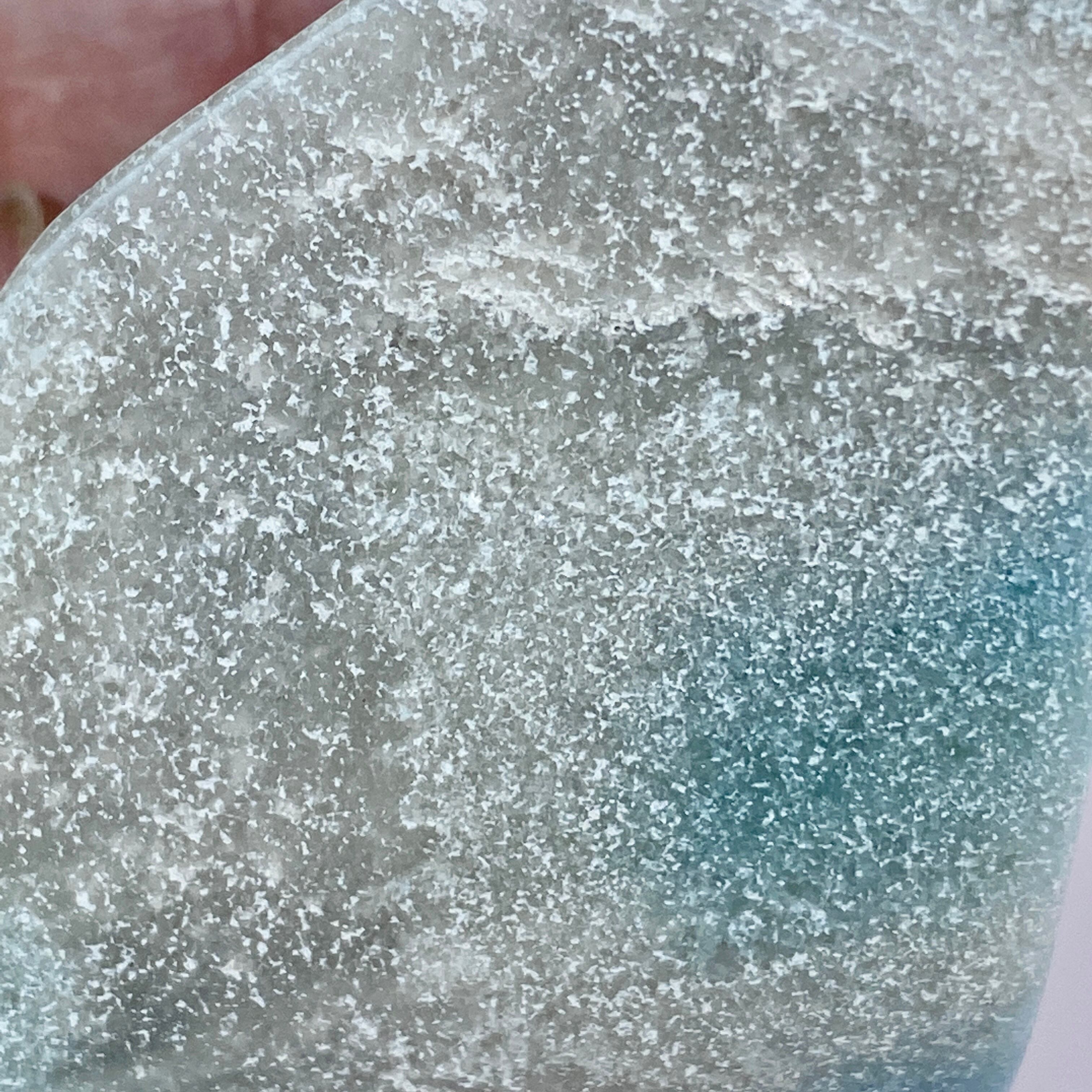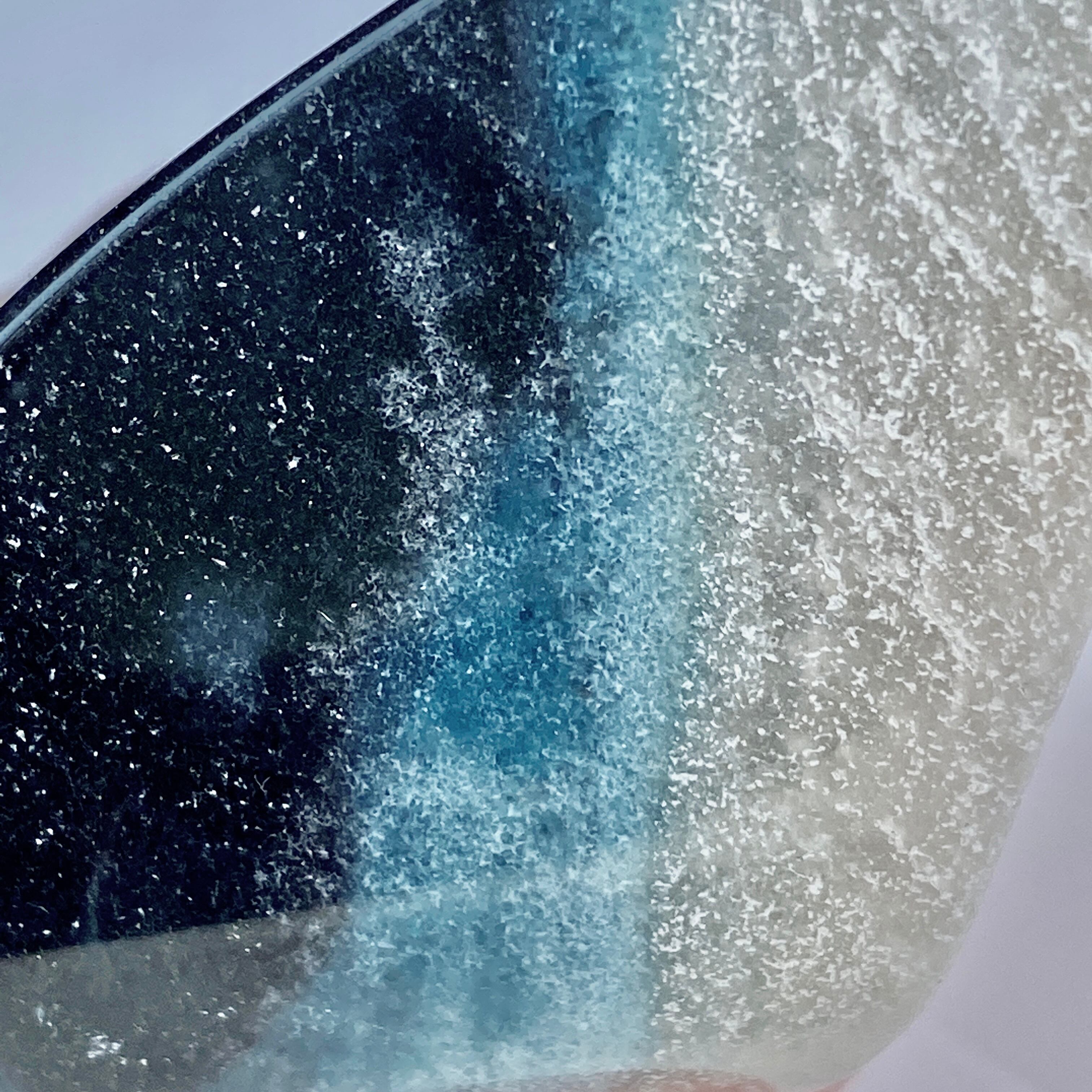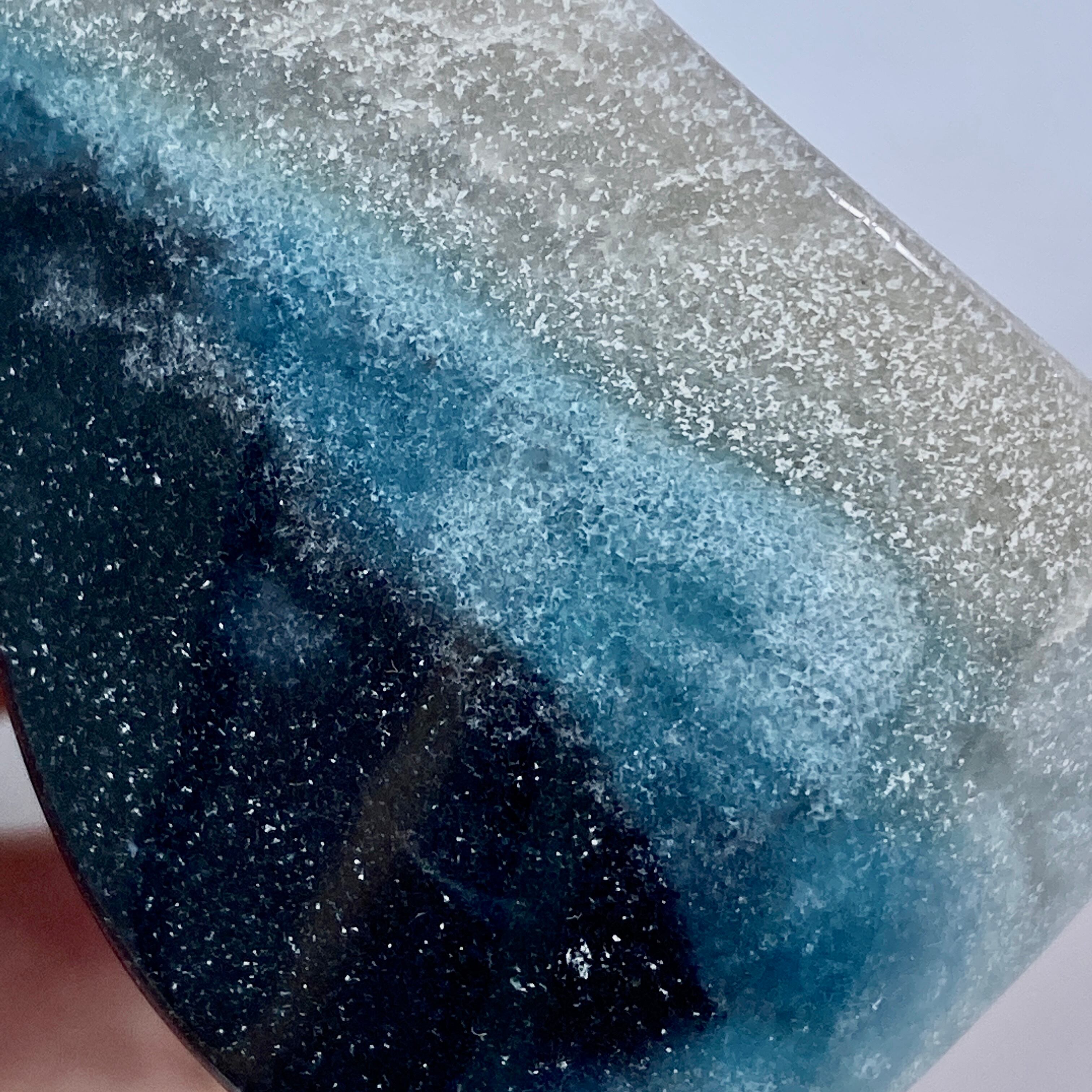 購入する際にモニターを通してその色合いに心高鳴ったアイテムです。到着した品も期待を裏切りませんでした。白いクォーツをベースに3色の青色系の色味が入っていて清涼感が抜群にあります。クォーツ部分も画像の通り吹雪のような模様が形成されていて、不透明な部分と少し透過性がある部分とのコンビネーションも楽しいです。