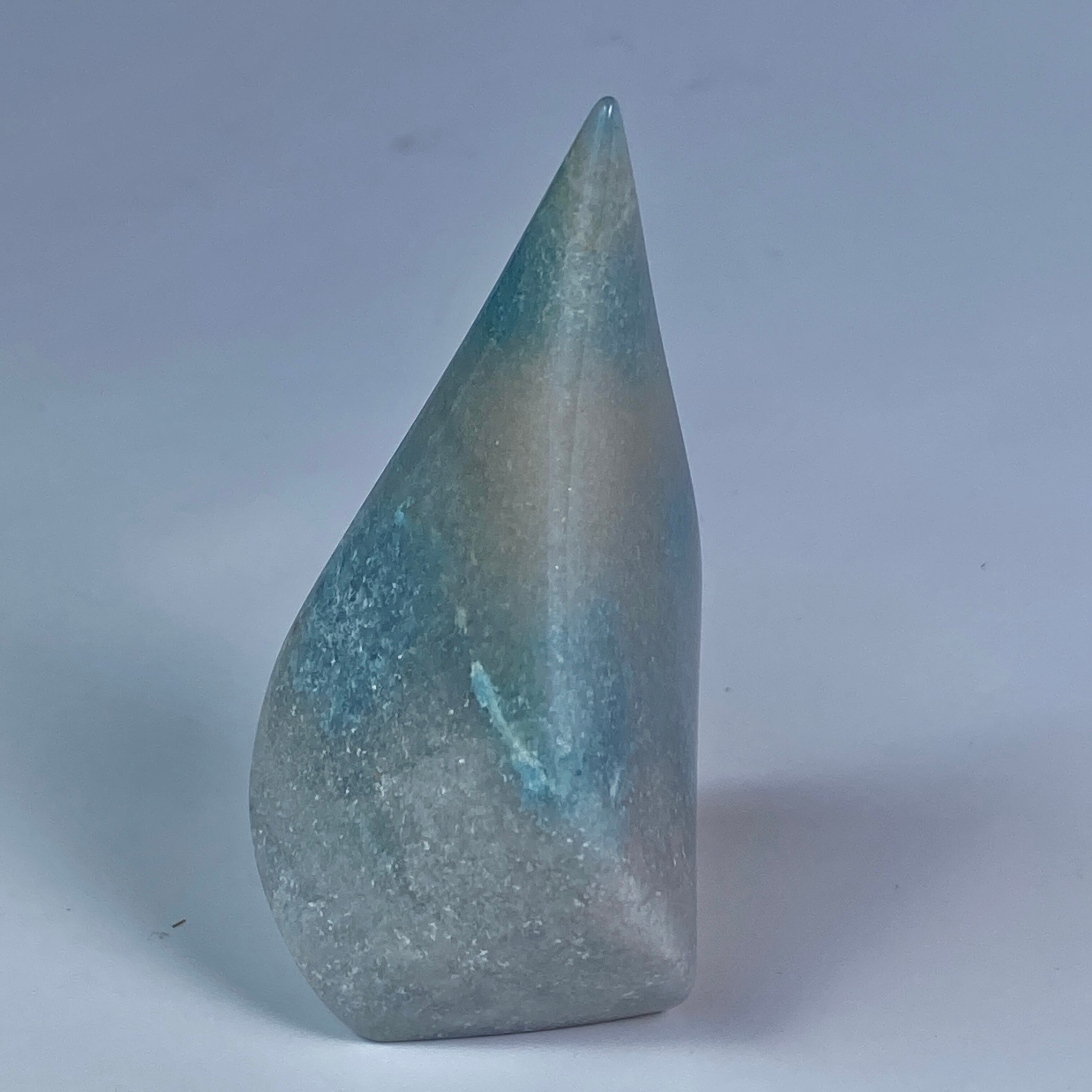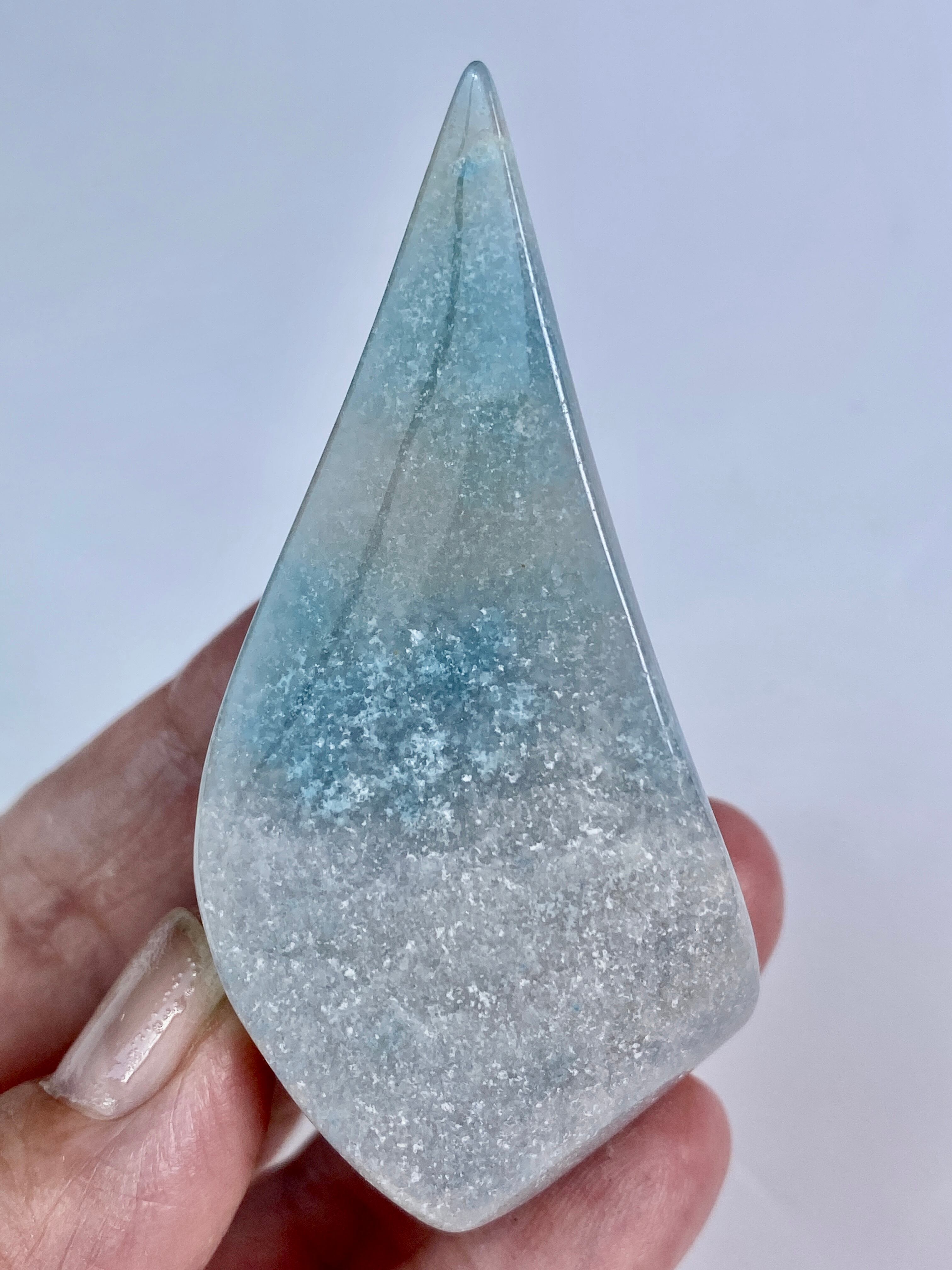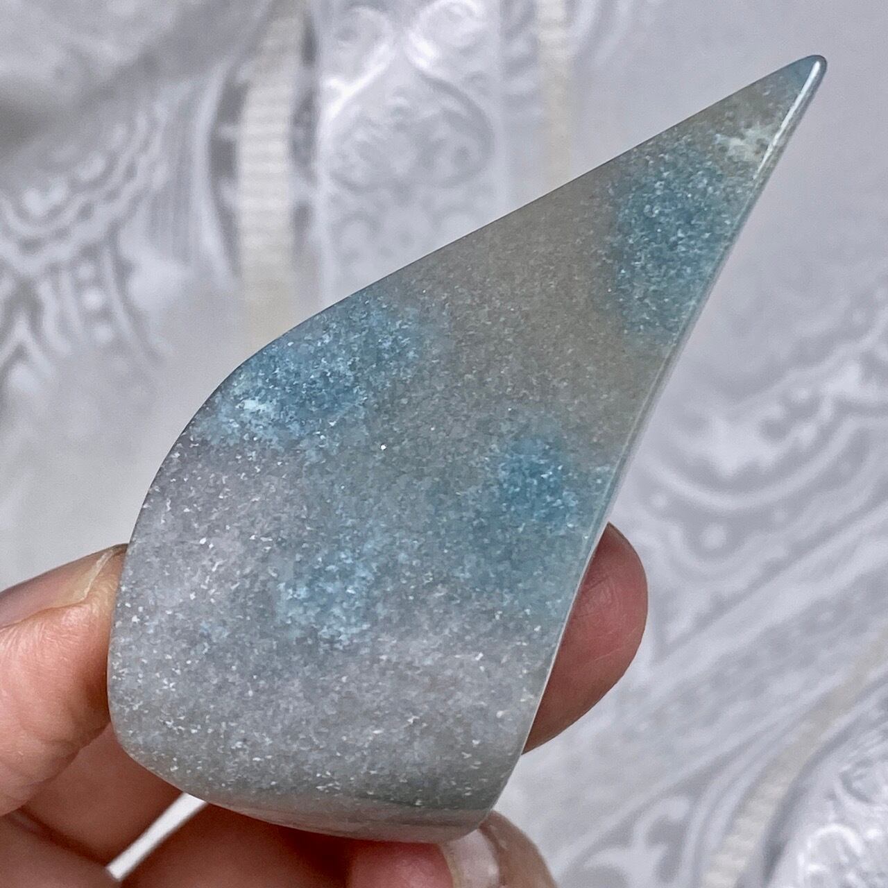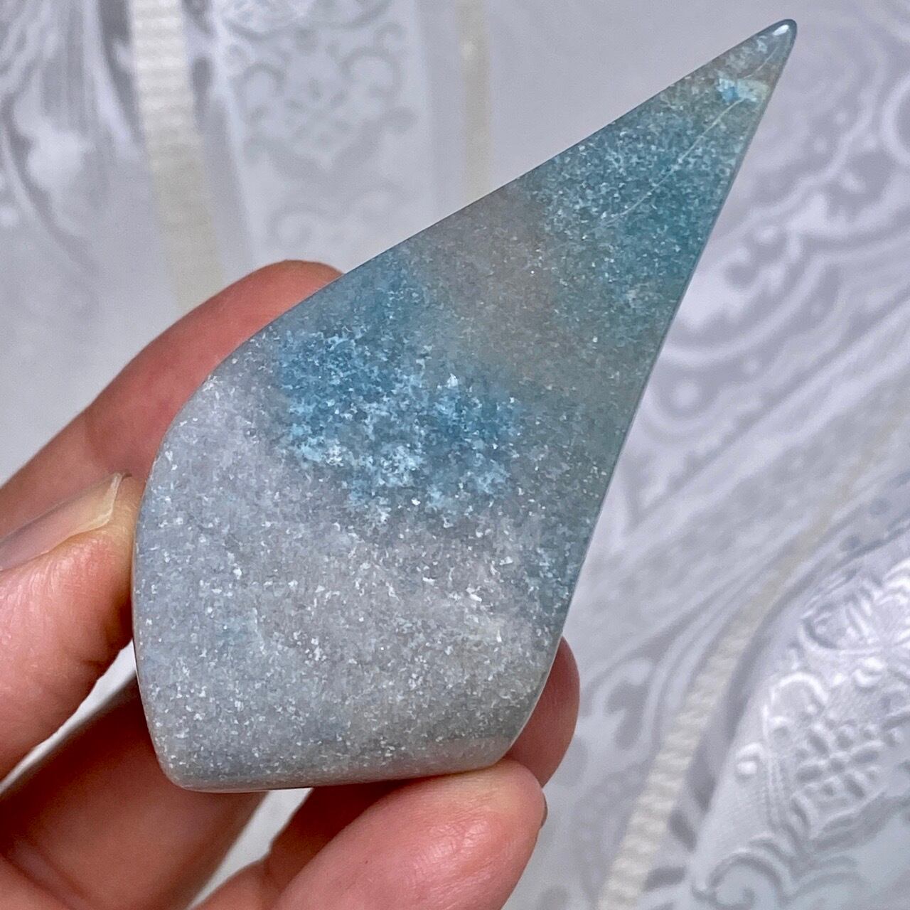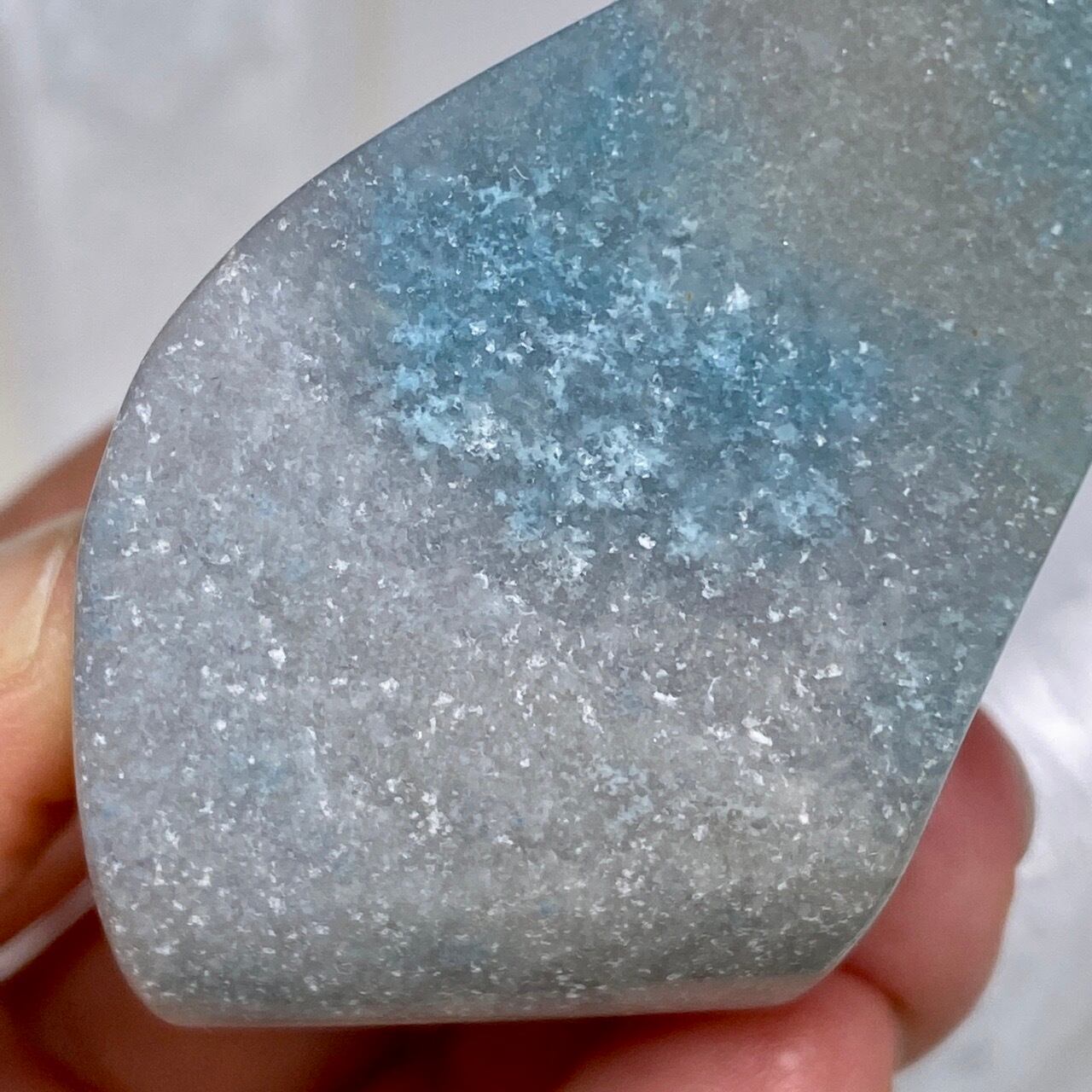 表面に浮き出た淡いグレーが混ざった白っぽい粒子のようなクォーツに淡い水色が所々に配された、癒し系で清涼感がある子です。ミニサイズなので場所を取らず、ちょこっとインテリアに飾ると可愛いです。