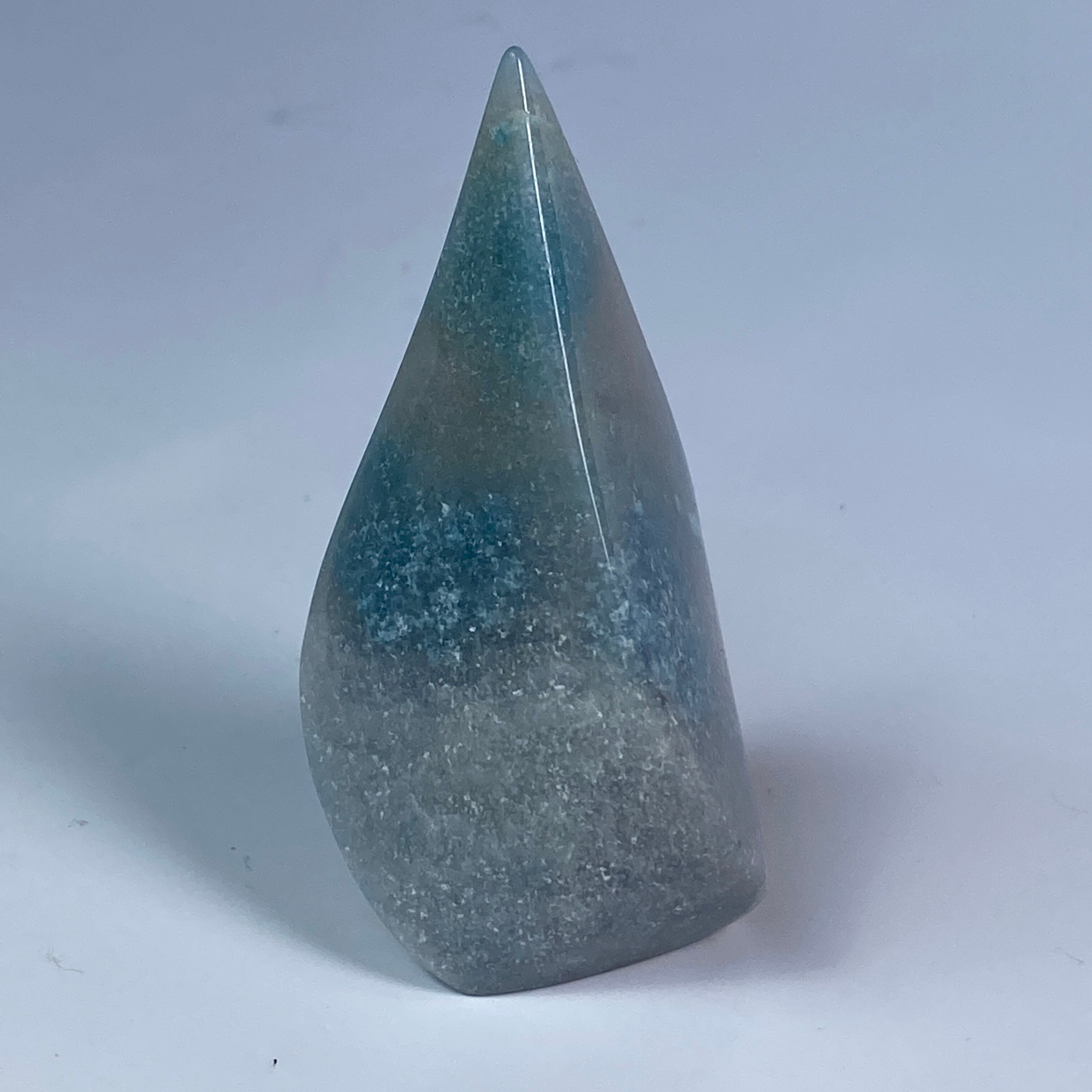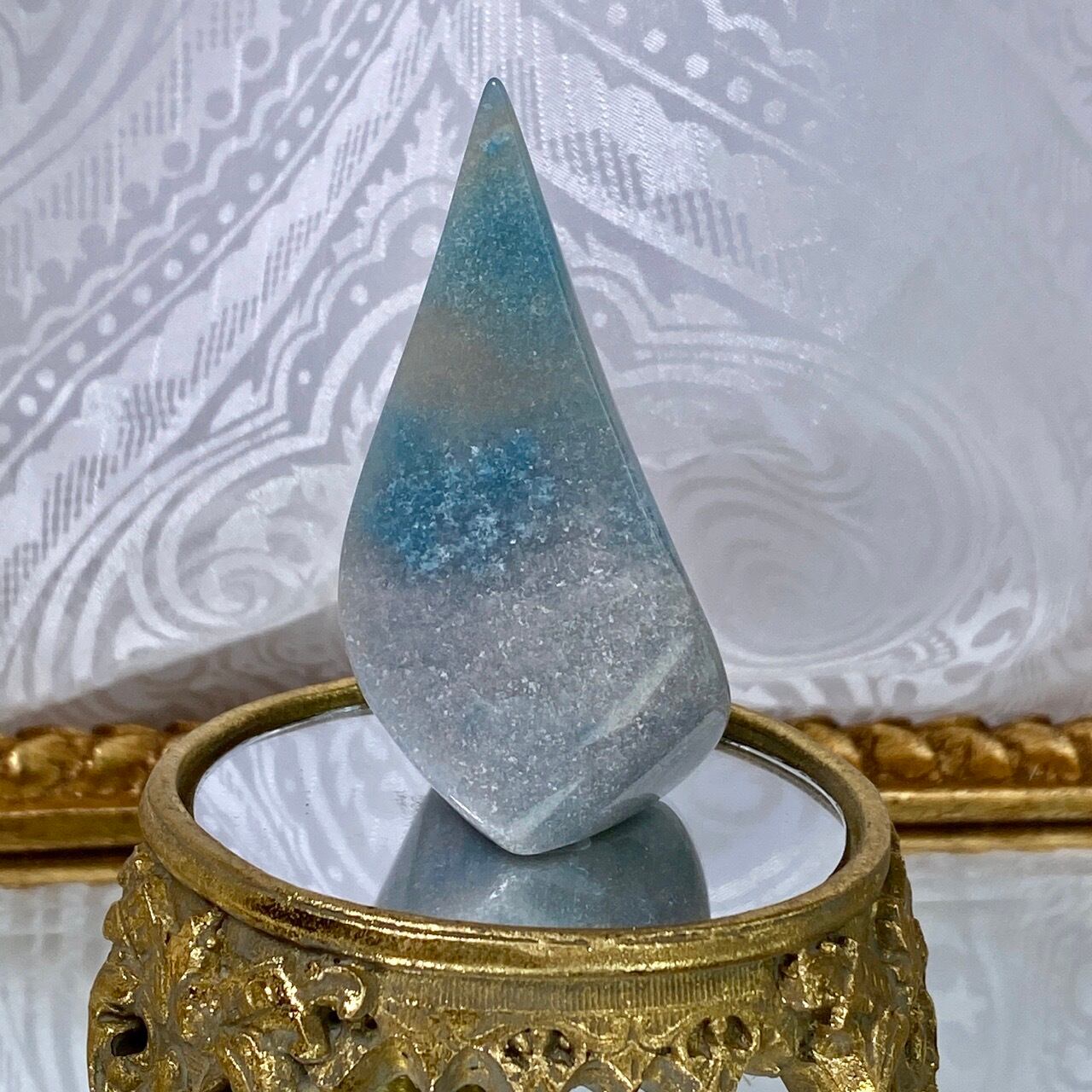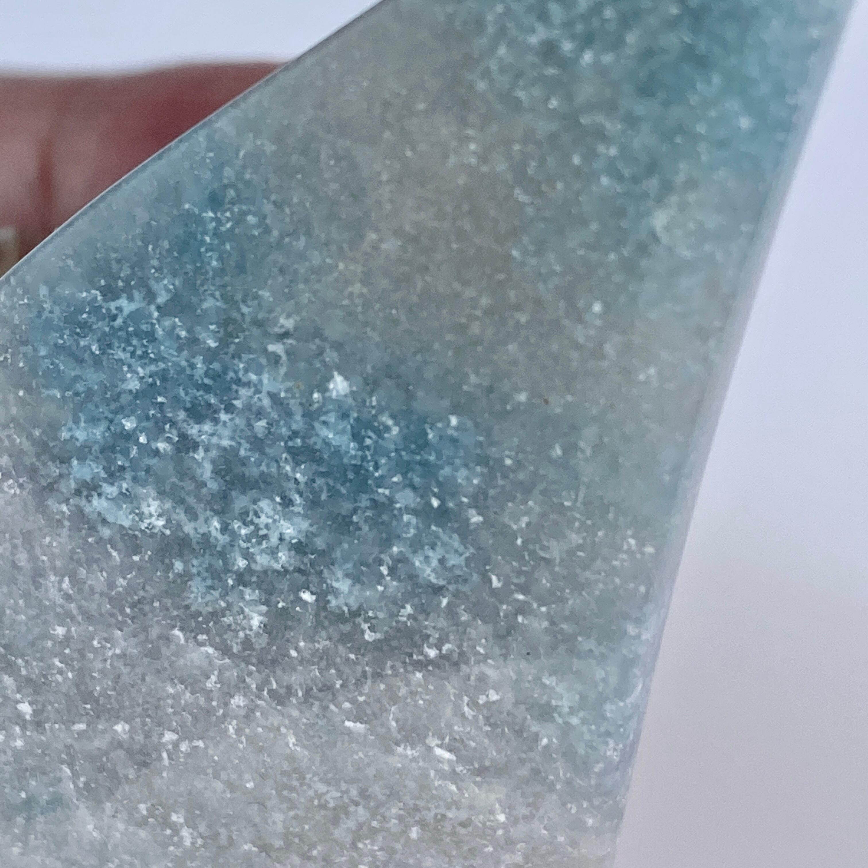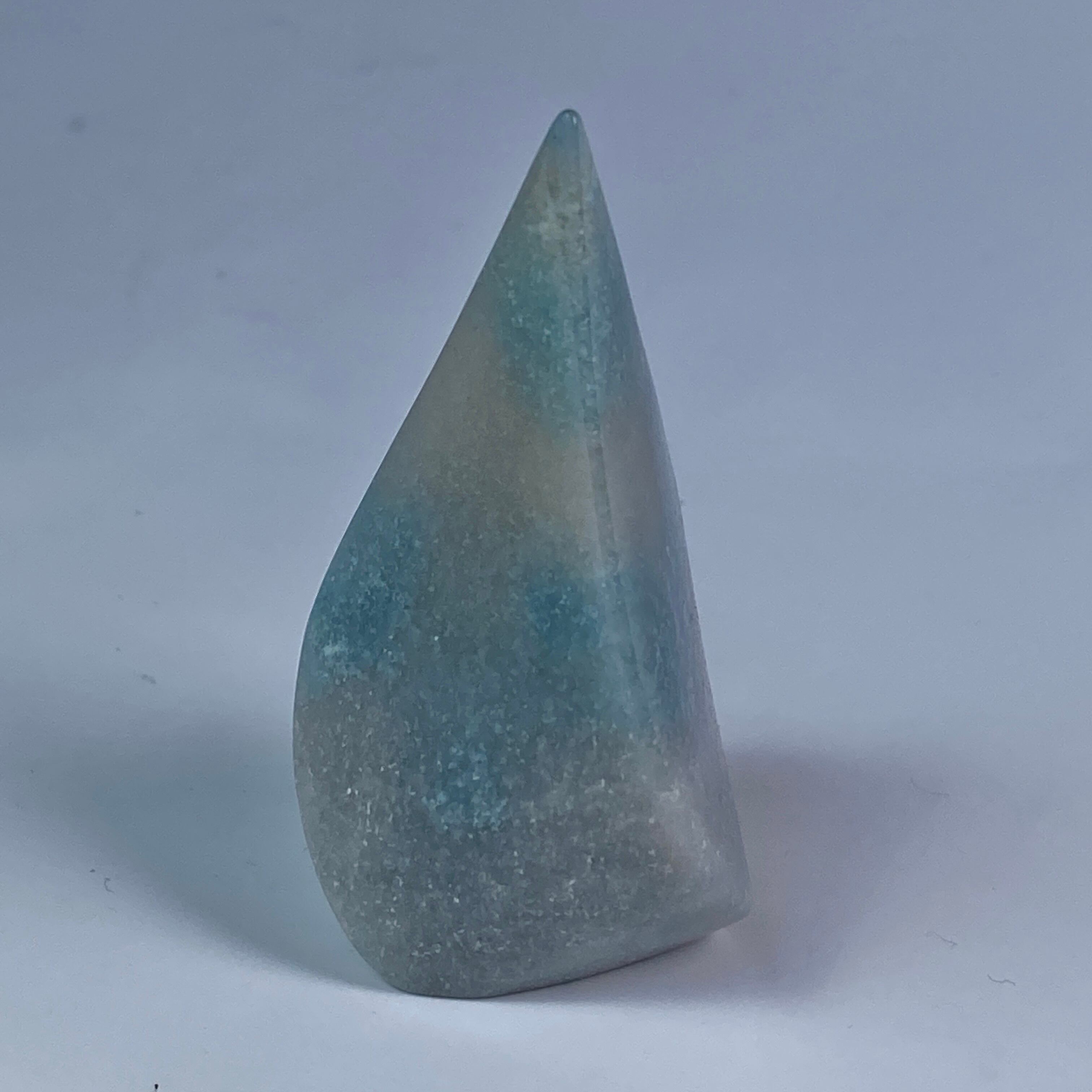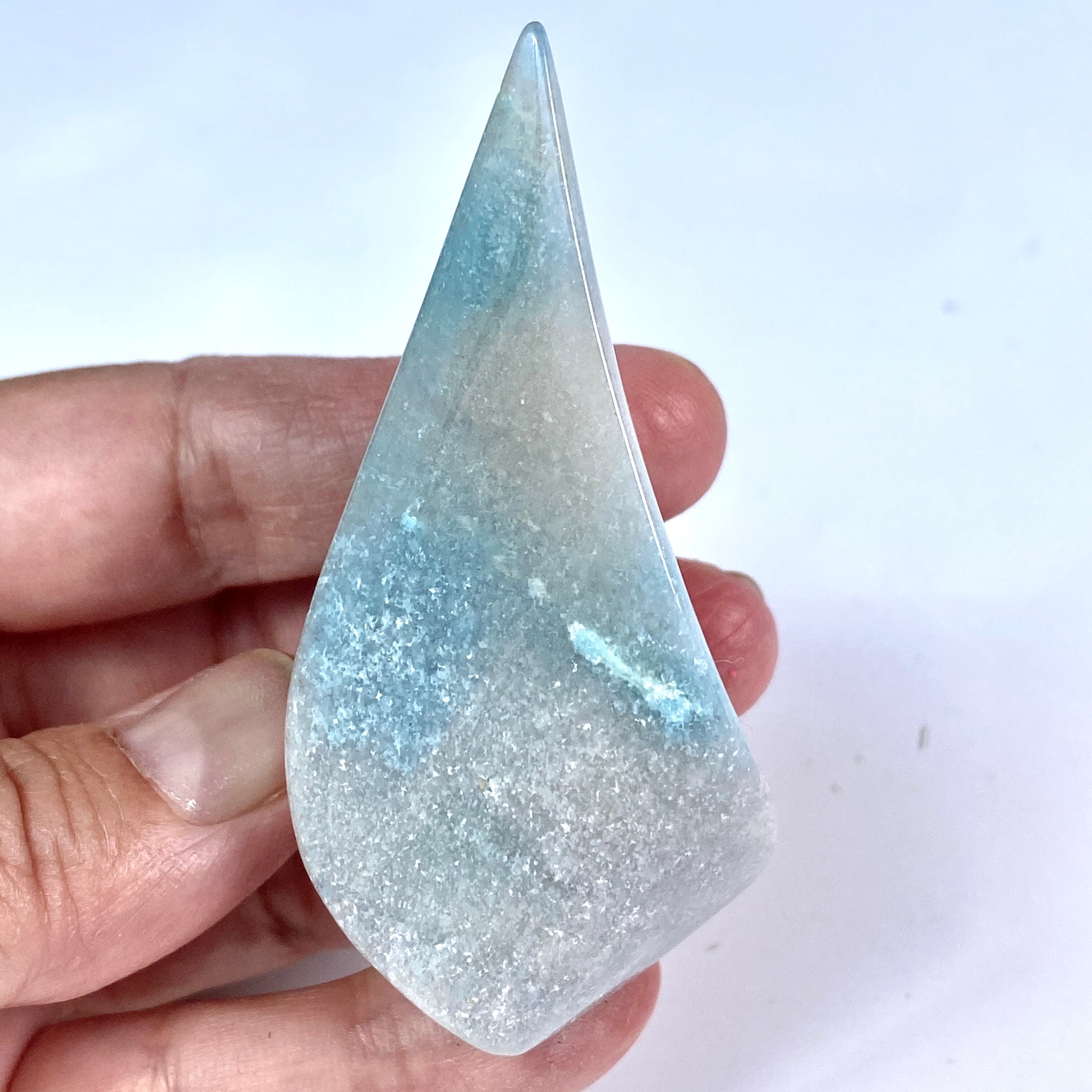 表面に浮き出た淡いグレーが混ざった白っぽい粒子のようなクォーツに淡い水色が所々に配された、癒し系で清涼感がある子です。ミニサイズなので場所を取らず、ちょこっとインテリアに飾ると可愛いです。