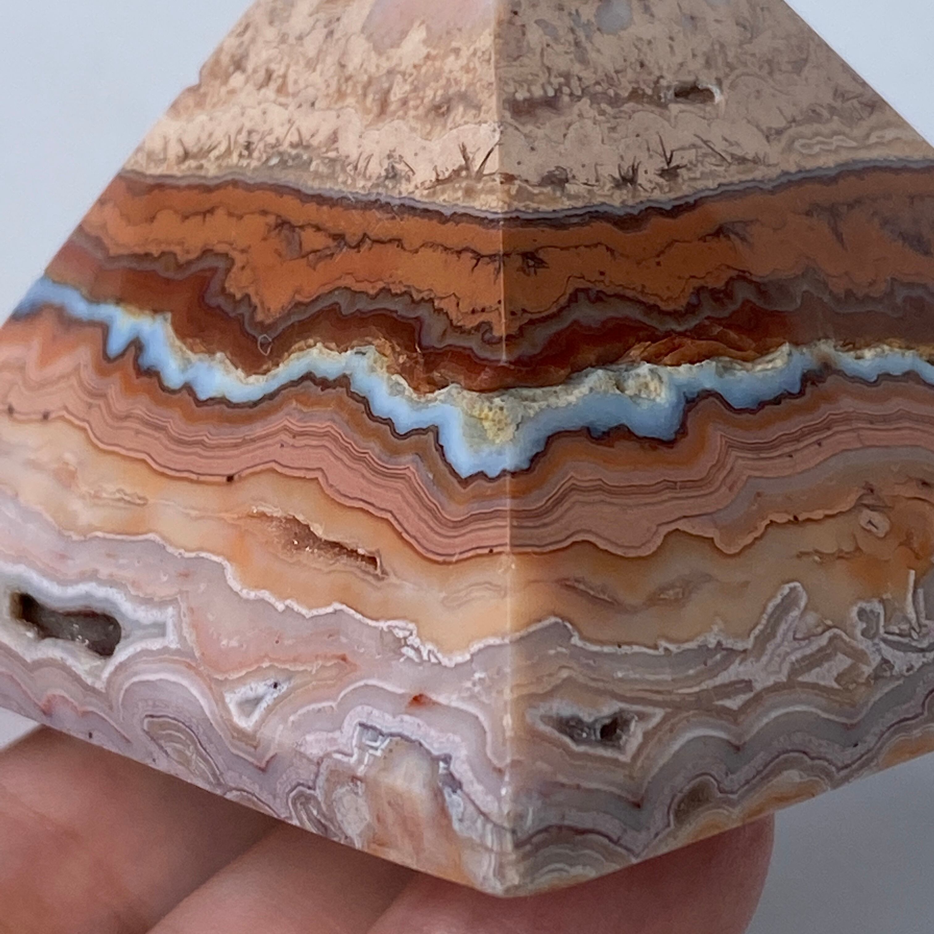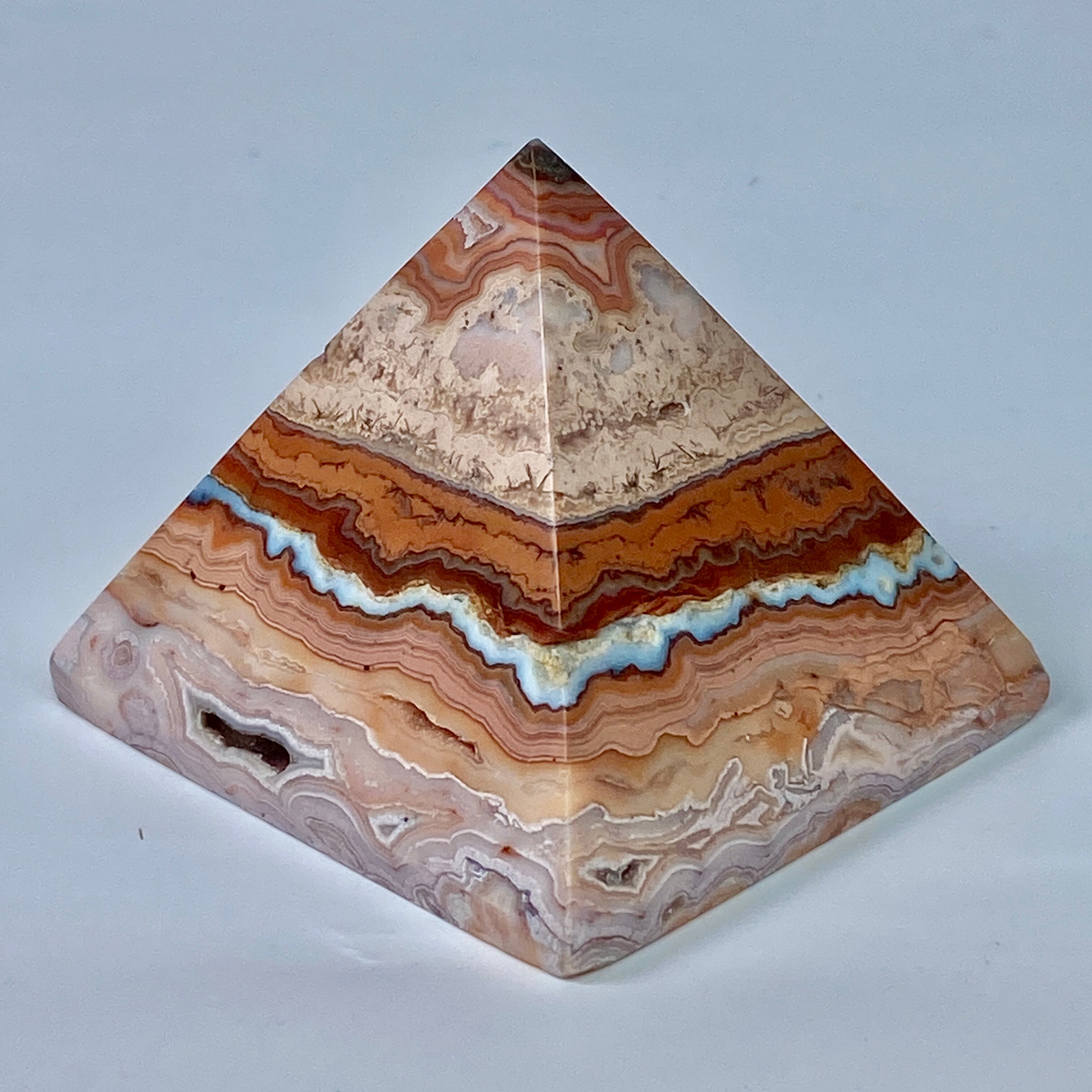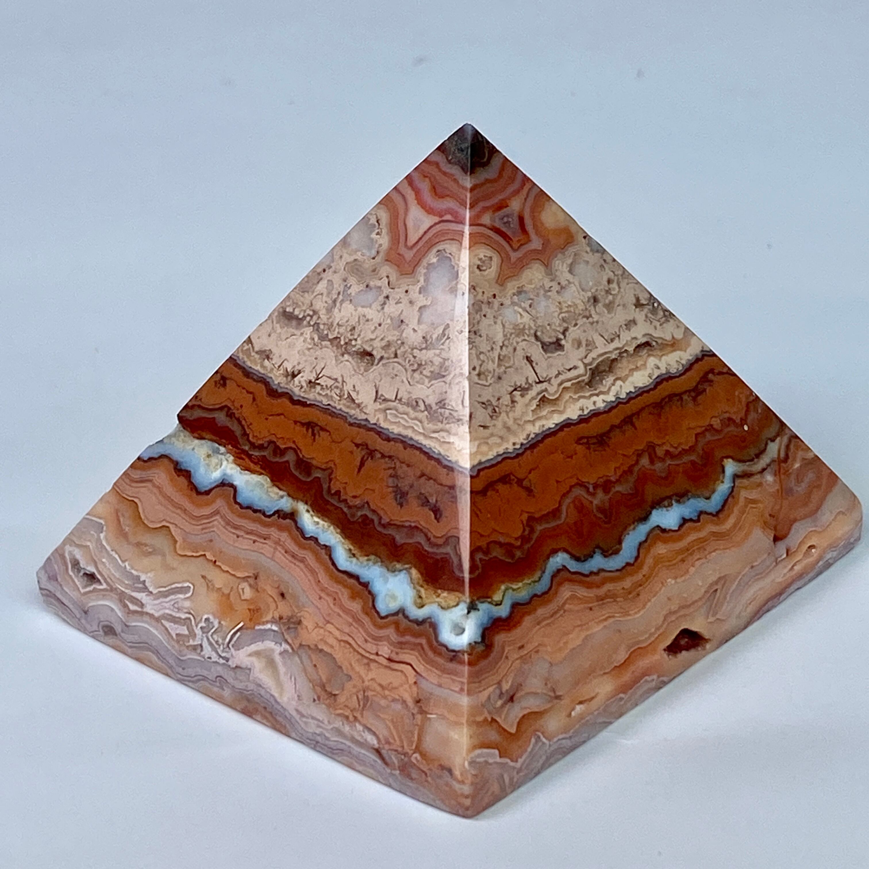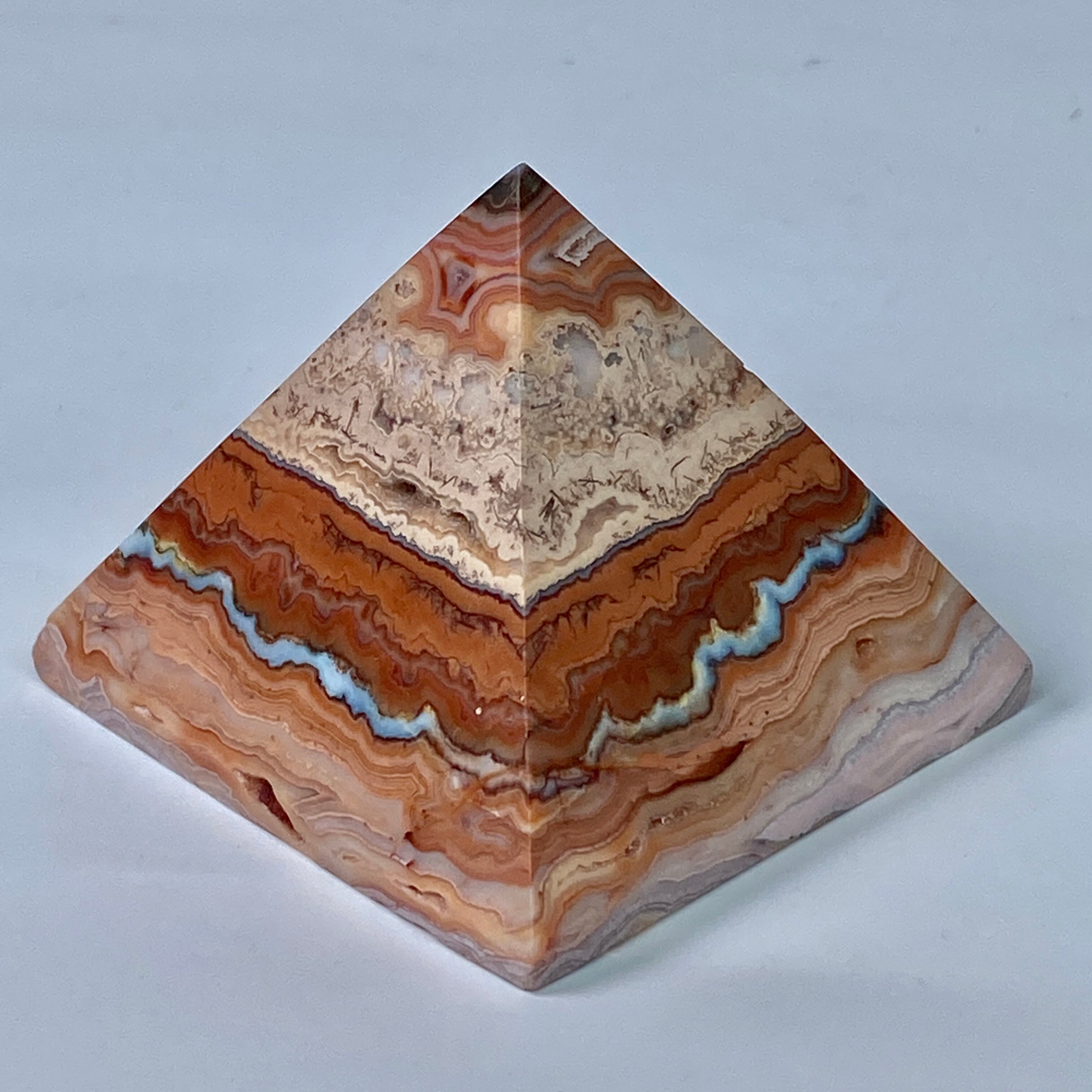 側面にまるで川が流れているような模様の、クレイジーレースアゲートのピラミッドの置物です。肌馴染みの良い色味に、珍しく淡いライトブルーが入っています。