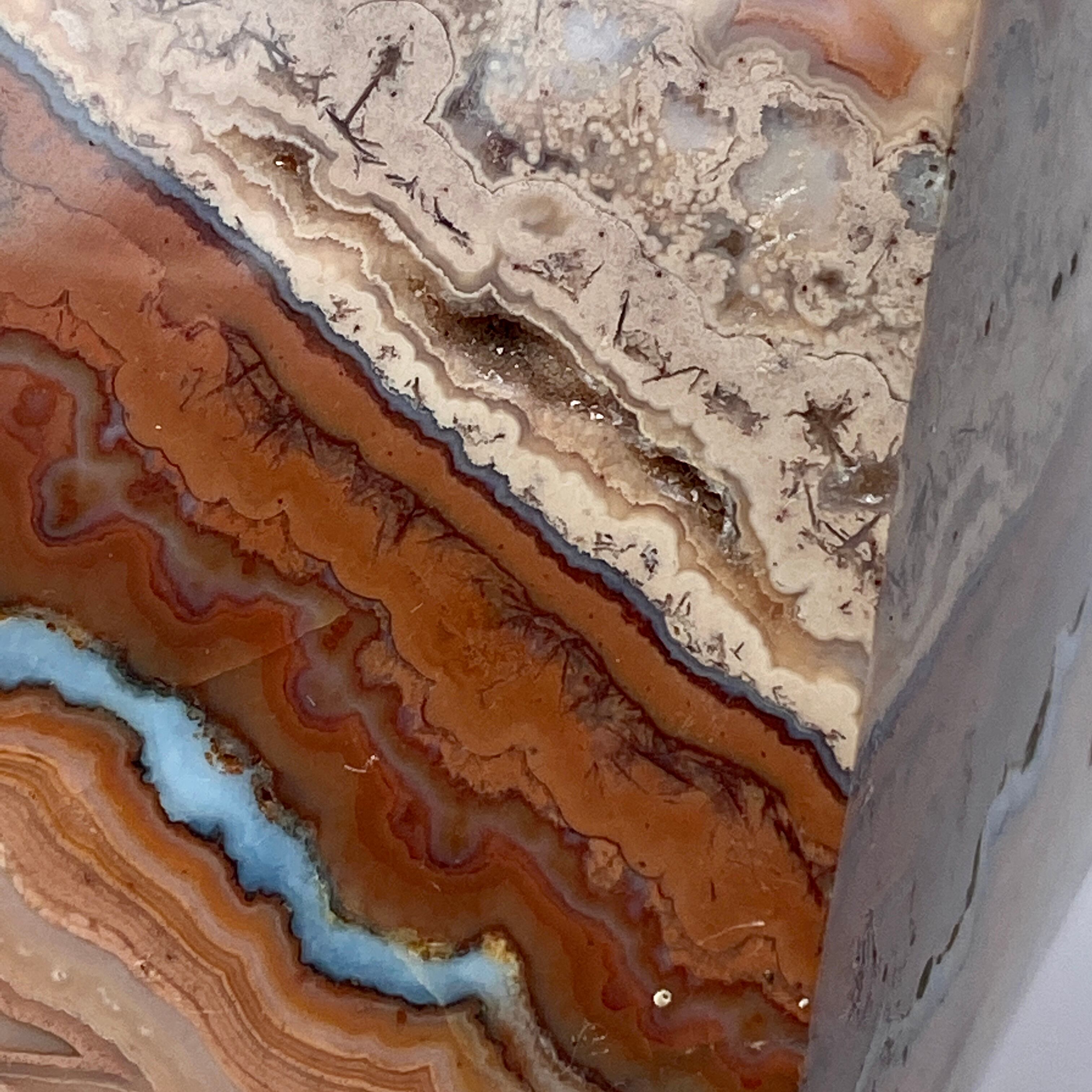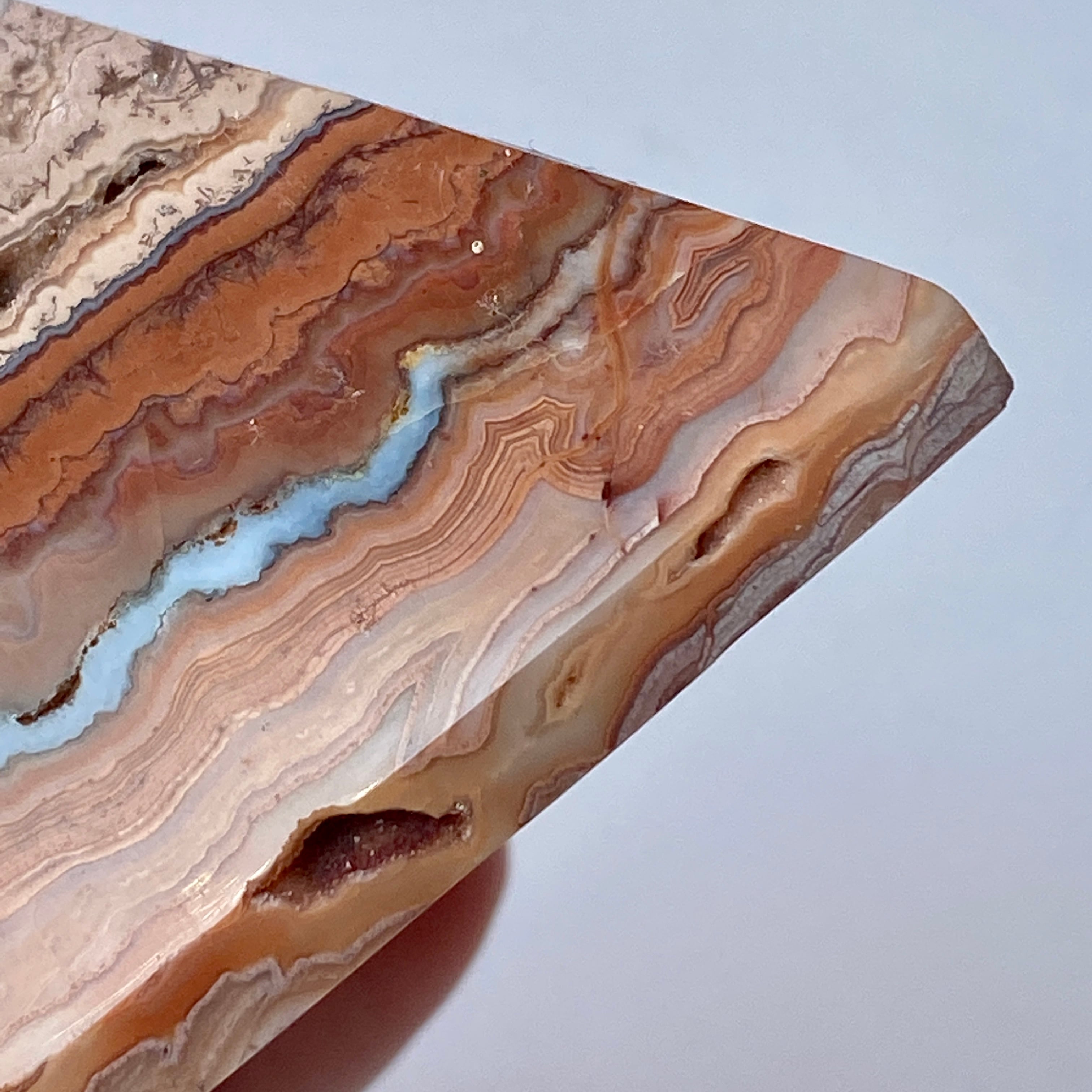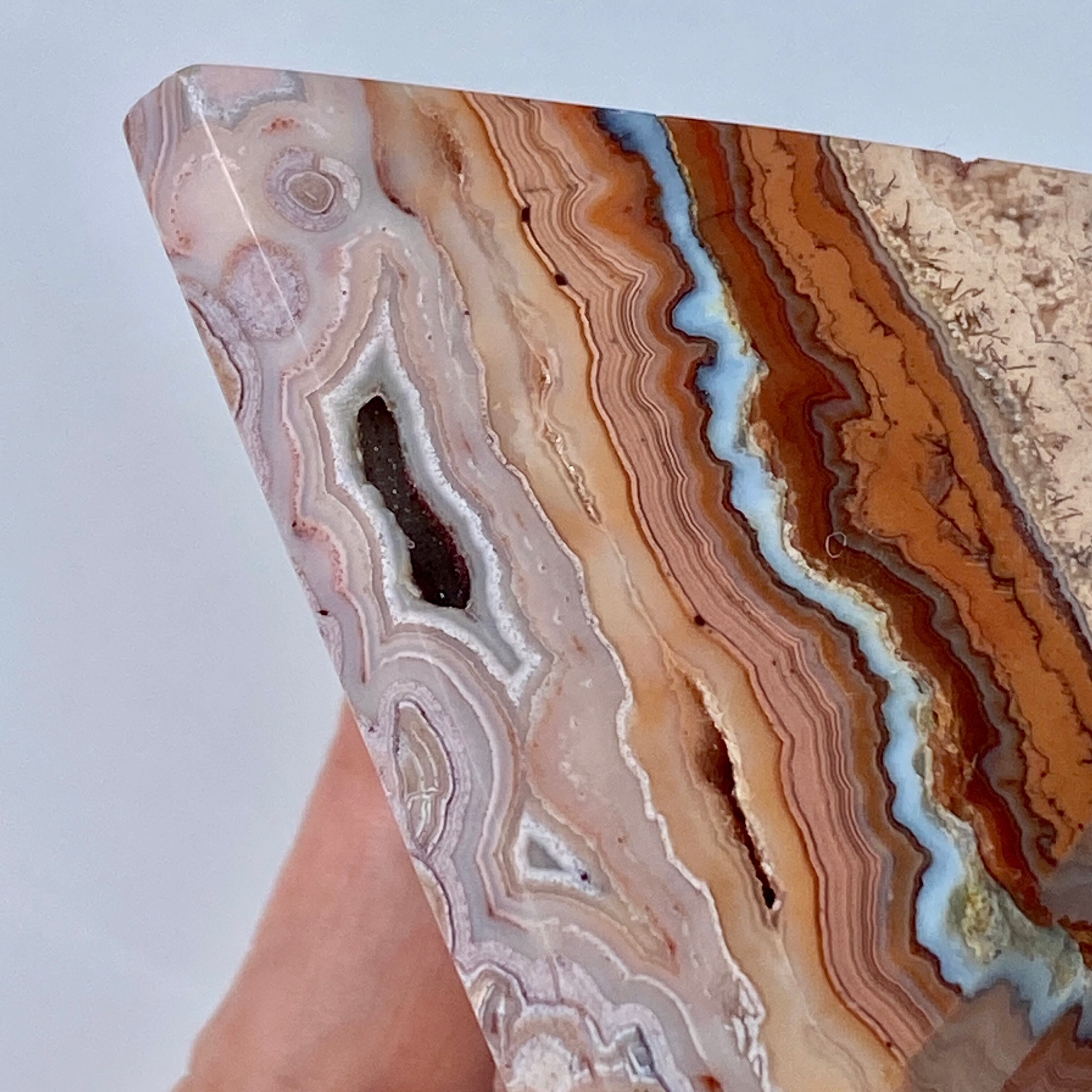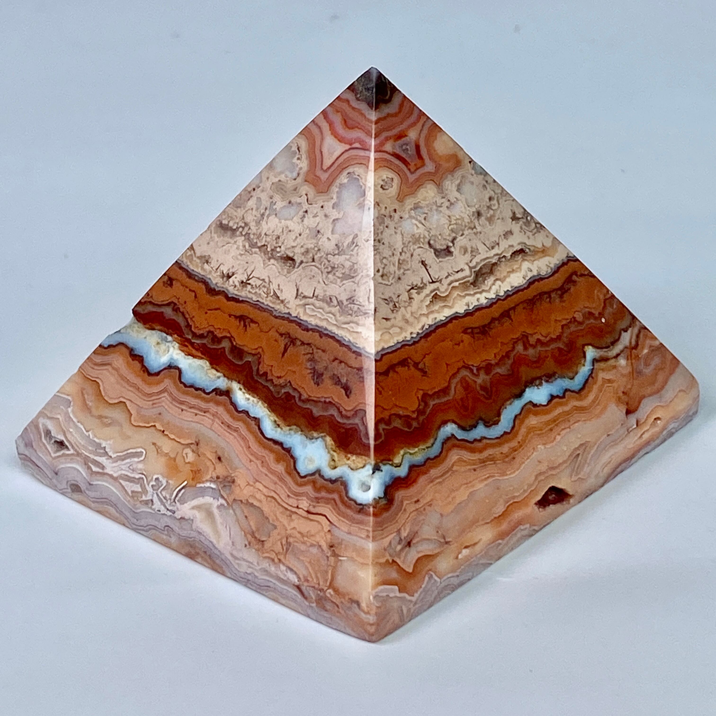 側面にまるで川が流れているような模様の、クレイジーレースアゲートのピラミッドの置物です。肌馴染みの良い色味に、珍しく淡いライトブルーが入っています。