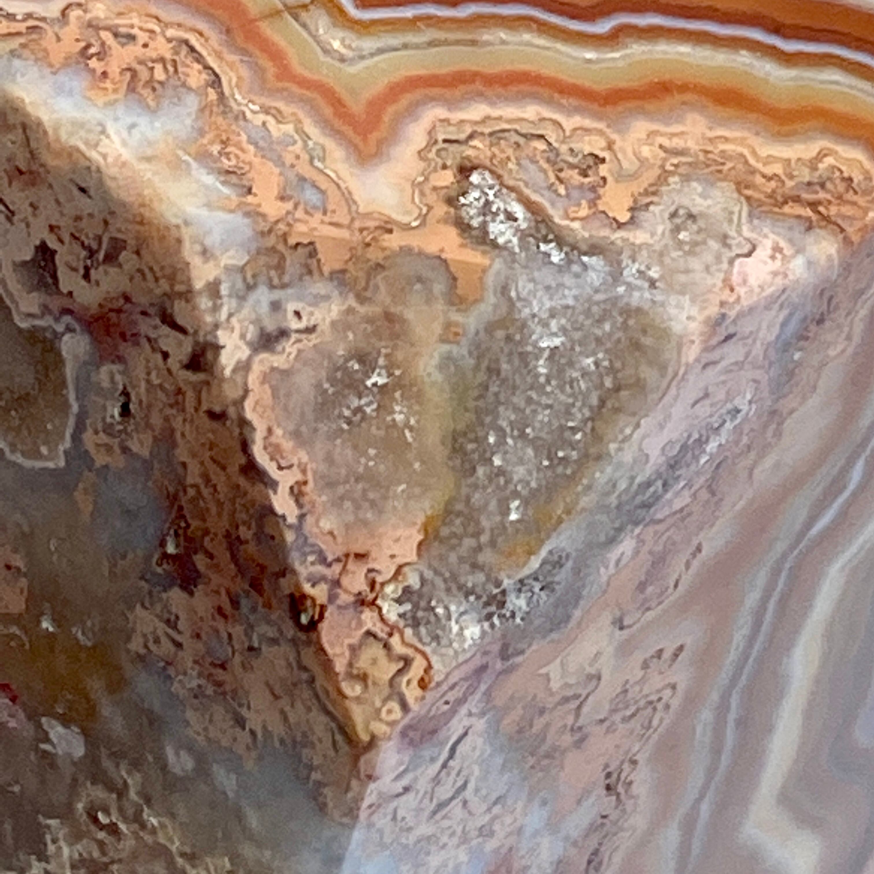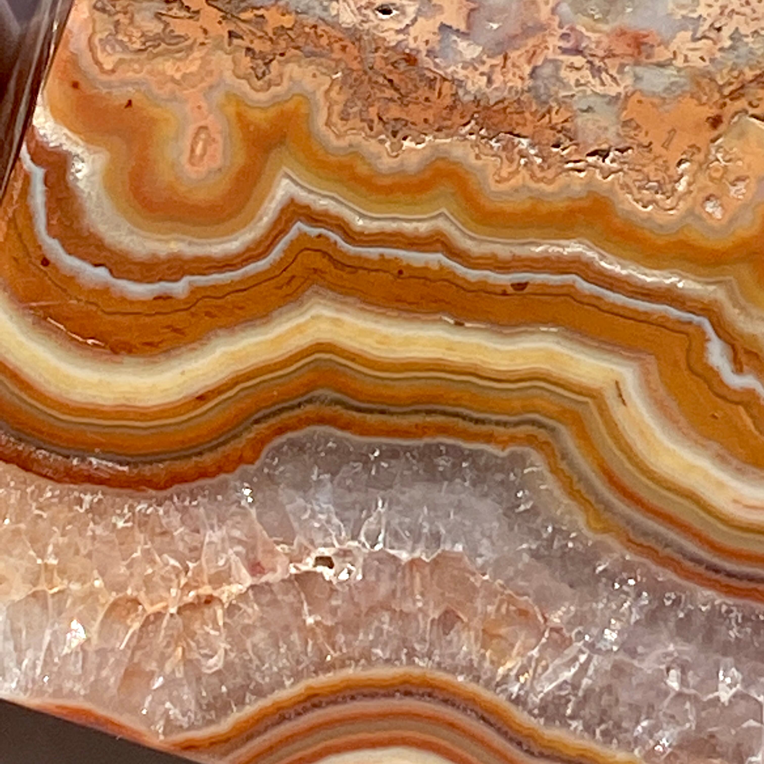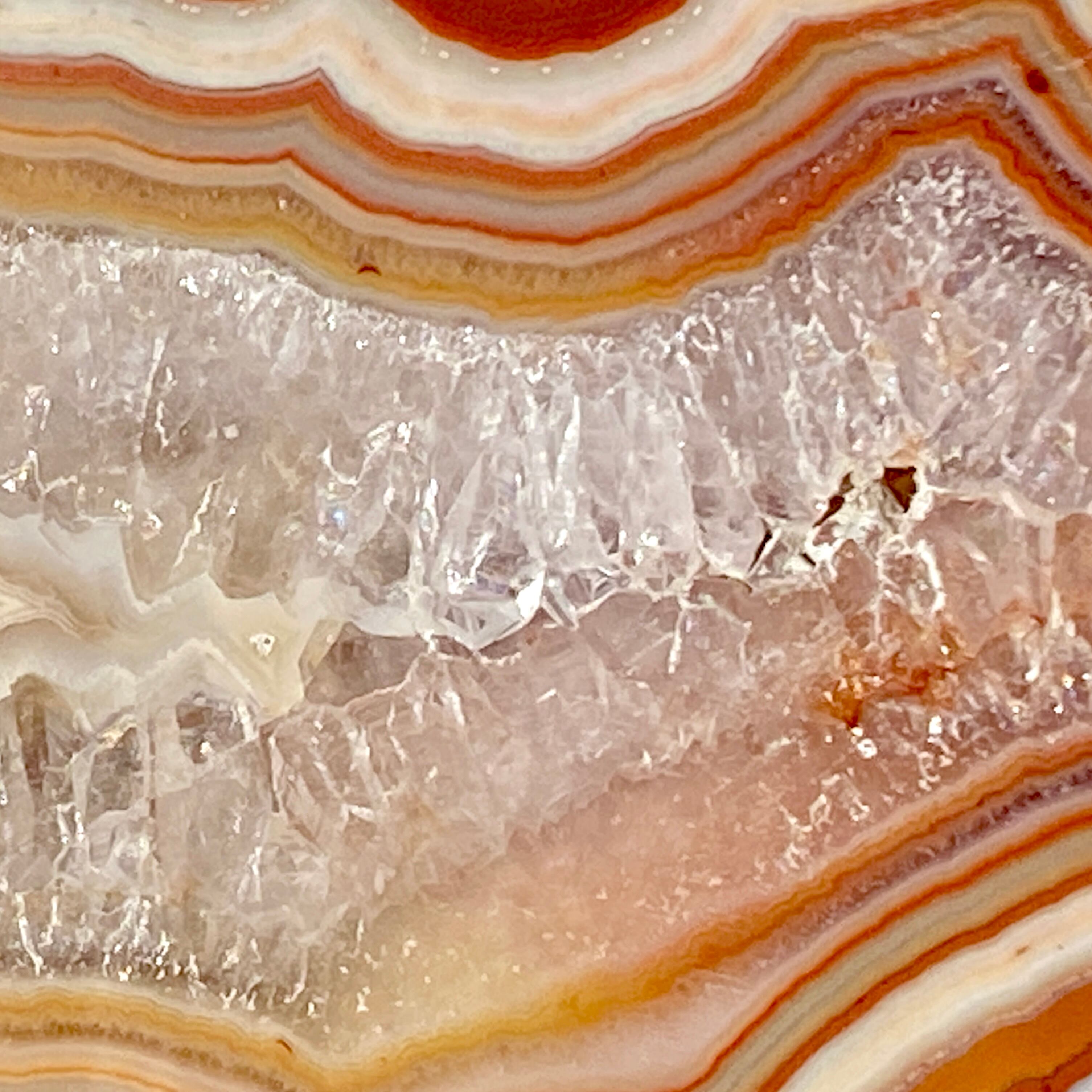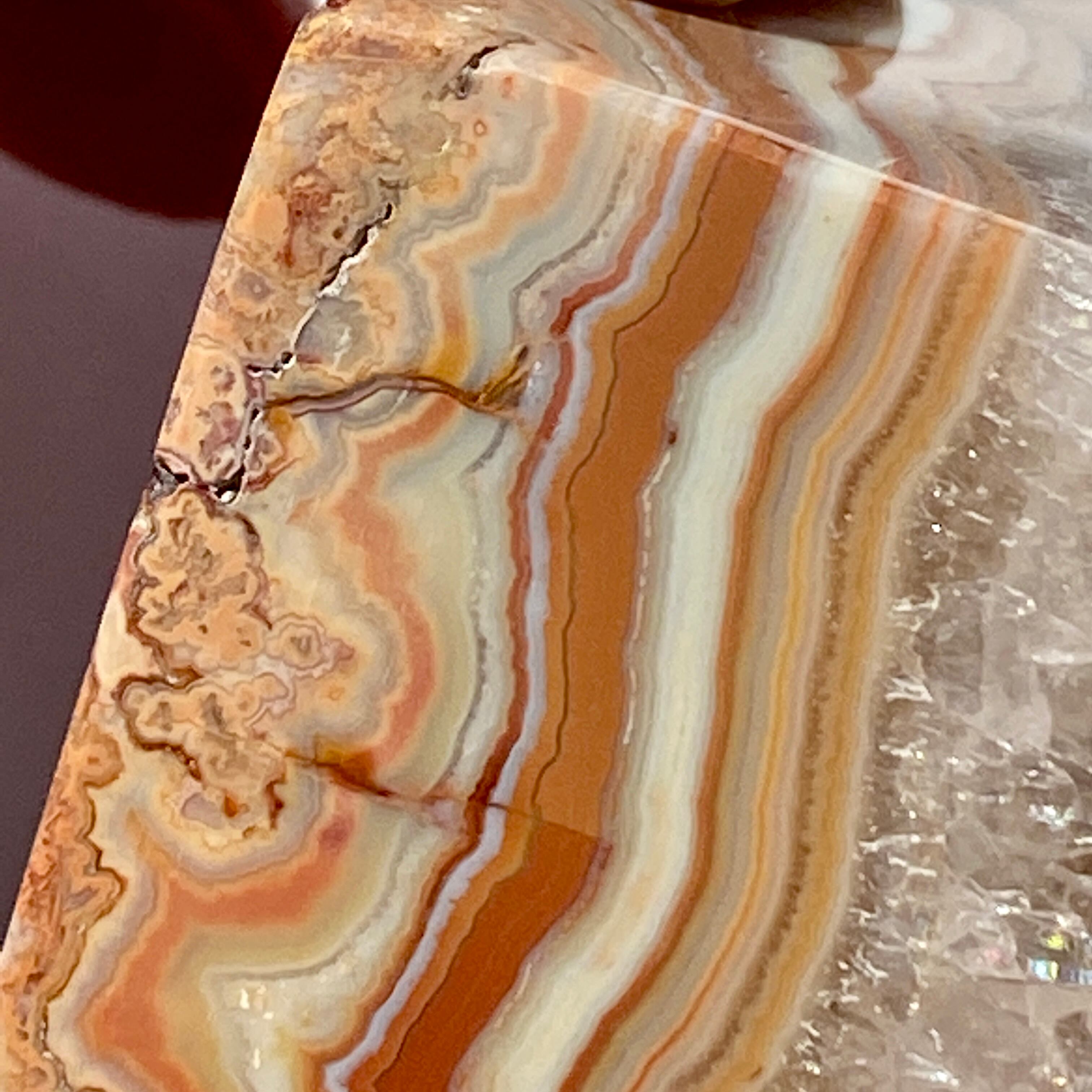 ざくざく入ったクォーツとそれを取り囲むバンディング(帯状の模様)が素敵で、クレイジーレースの入り組んだ模様のディテールと絶妙な良い色味が魅力的です。