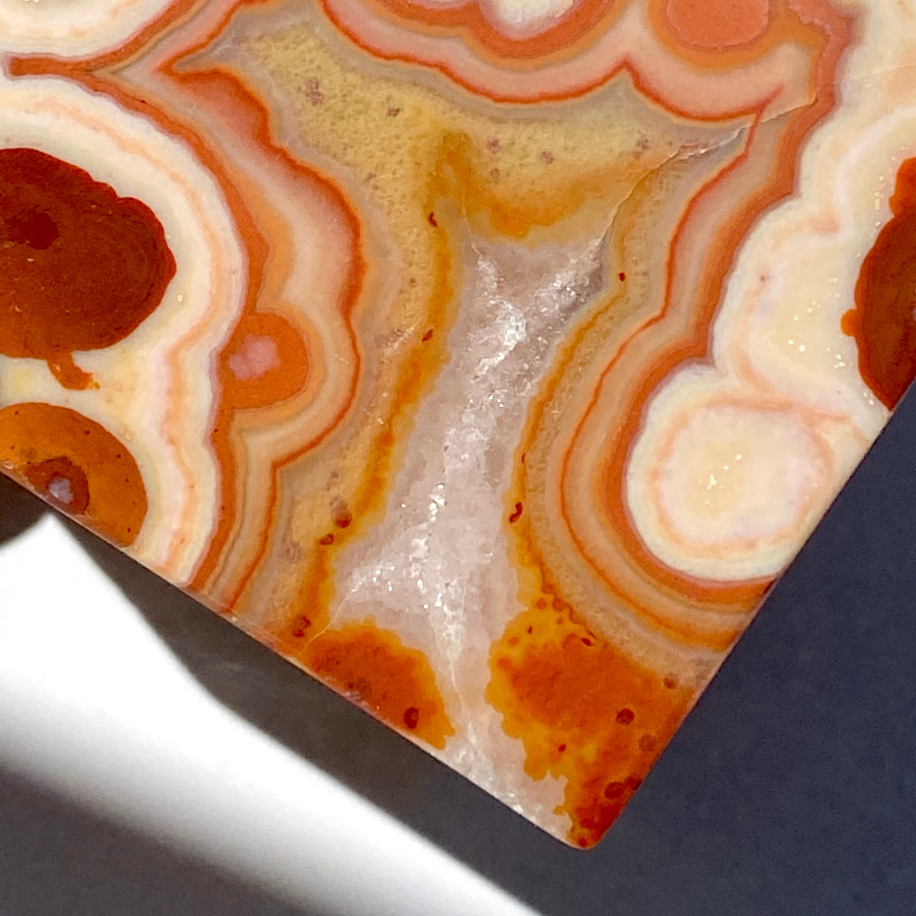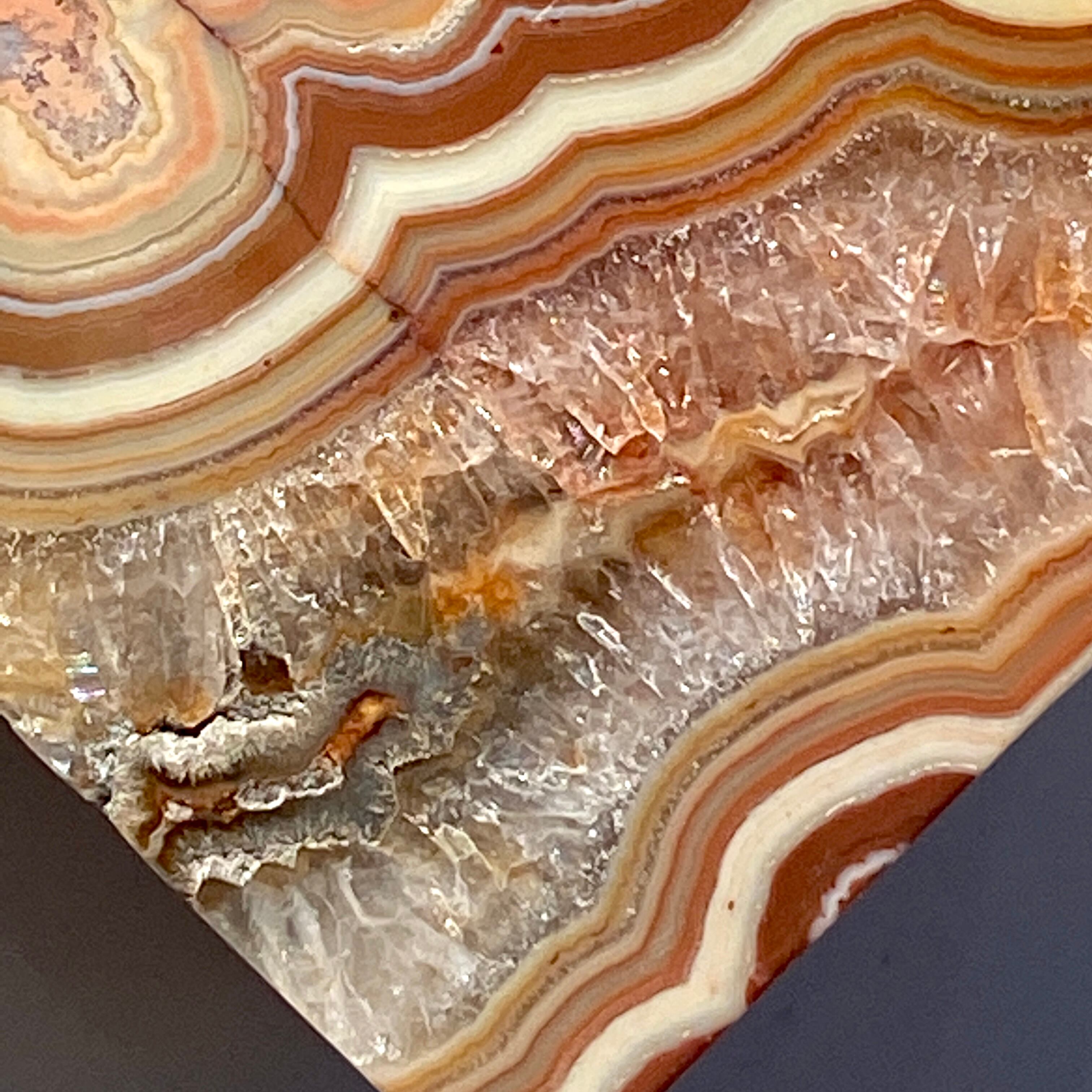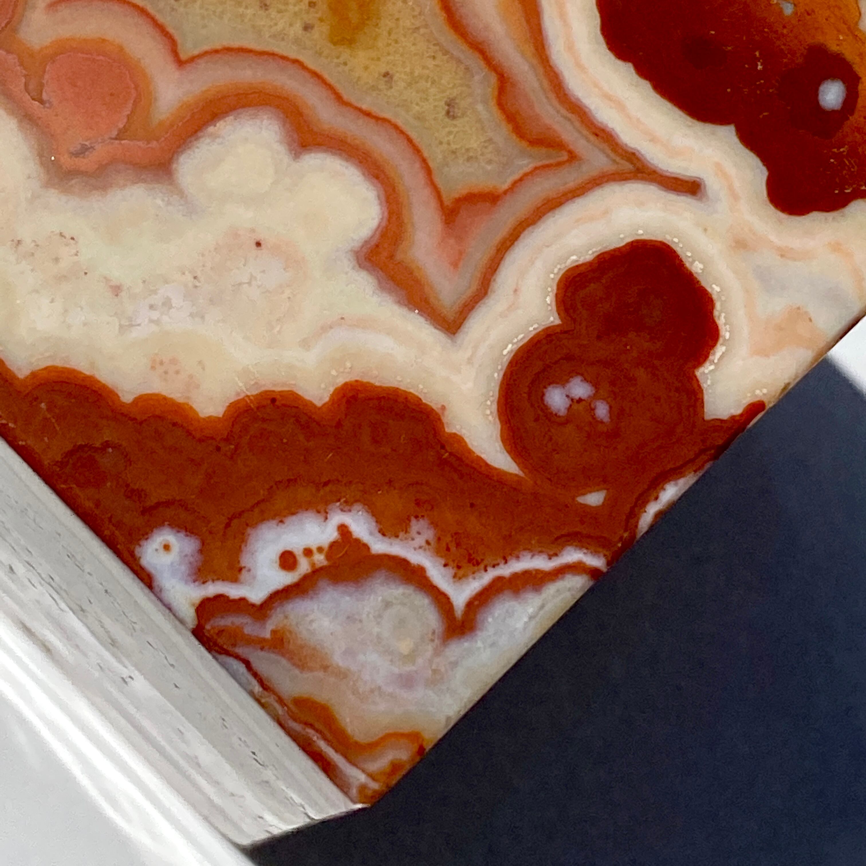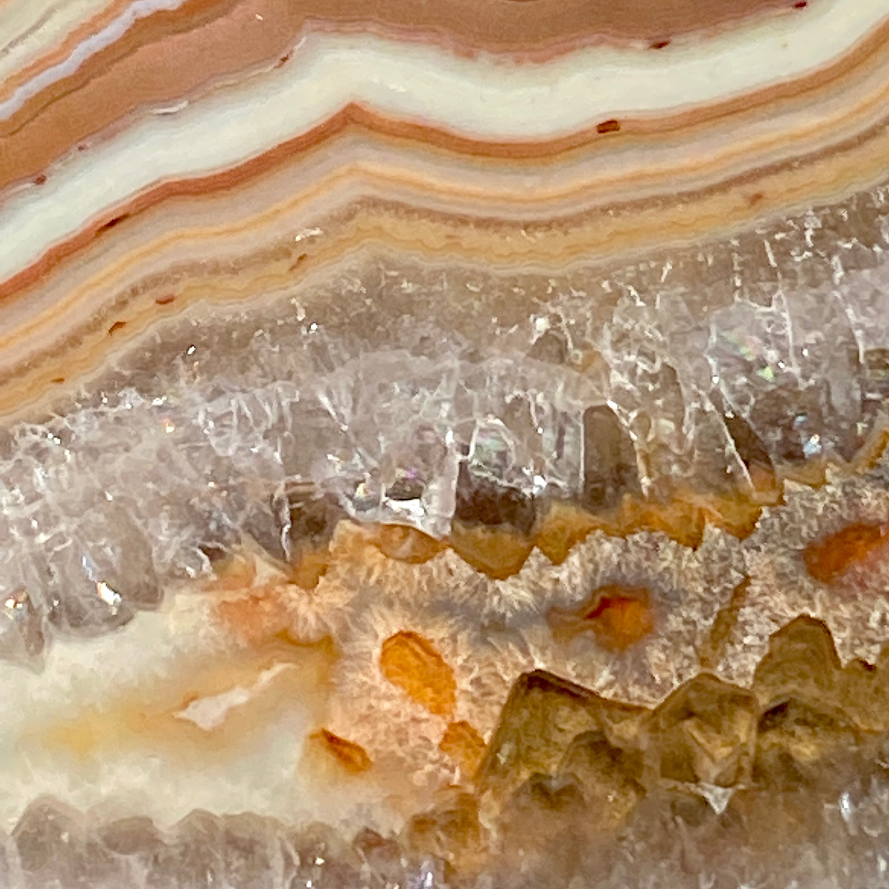 ざくざく入ったクォーツとそれを取り囲むバンディング(帯状の模様)が素敵で、クレイジーレースの入り組んだ模様のディテールと絶妙な良い色味が魅力的です。