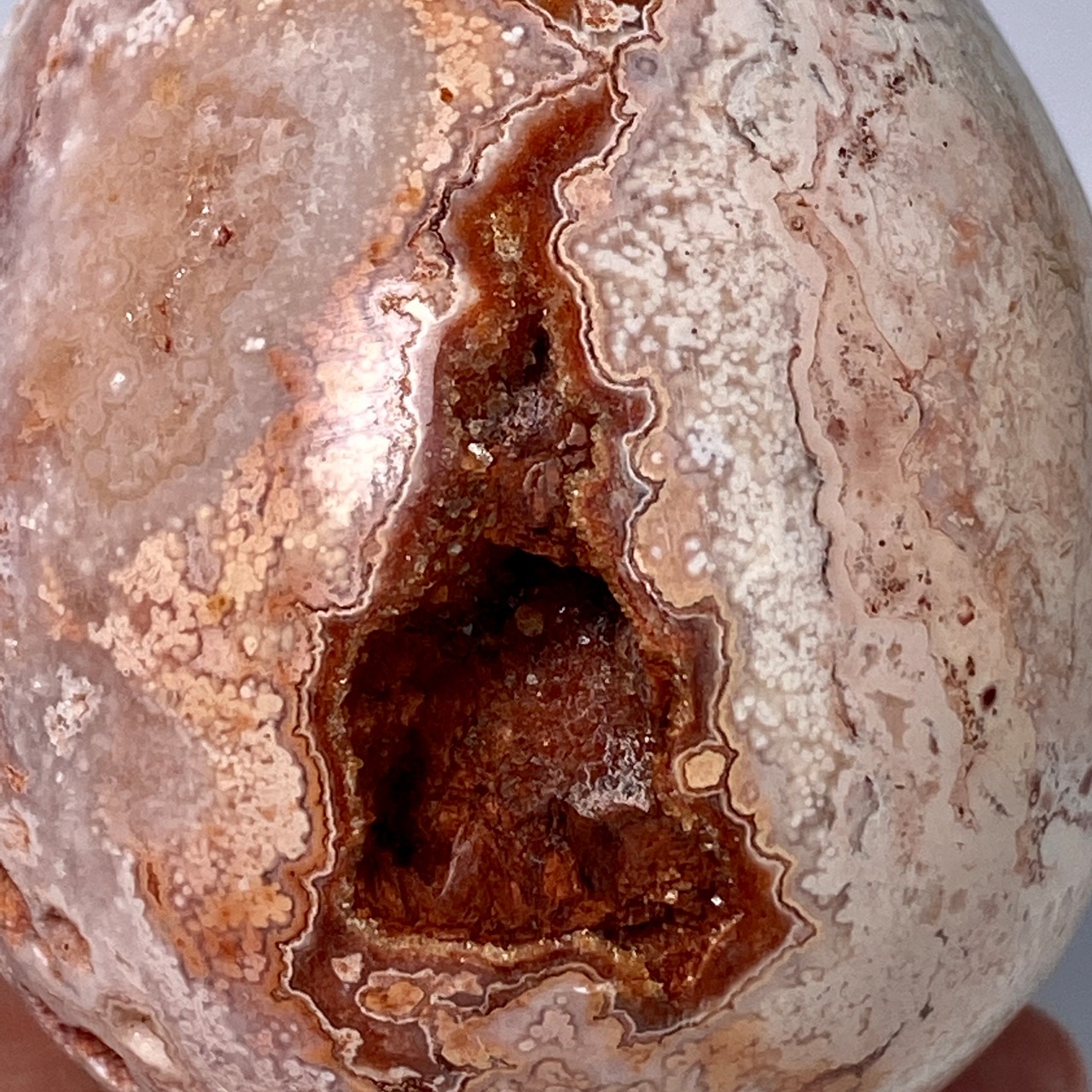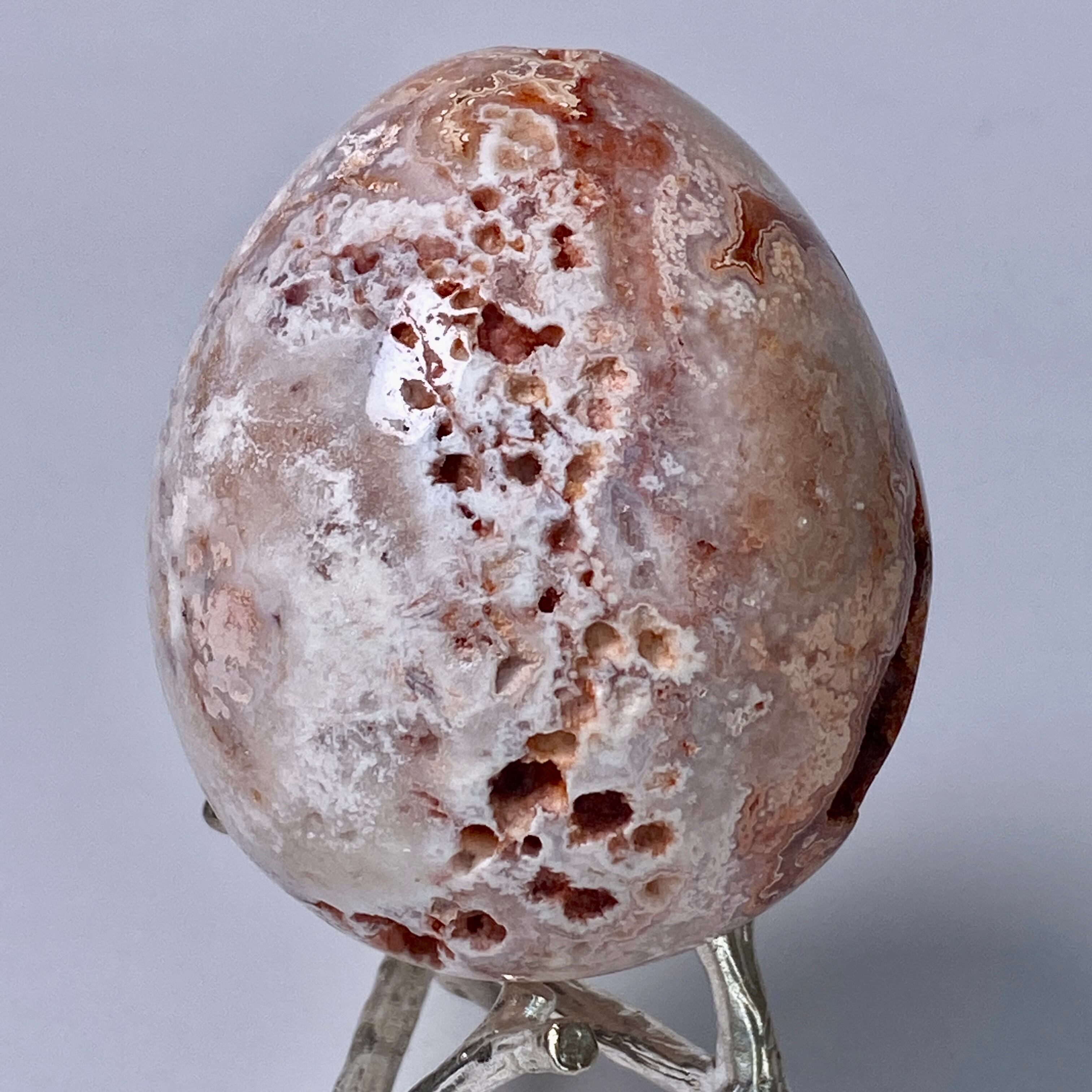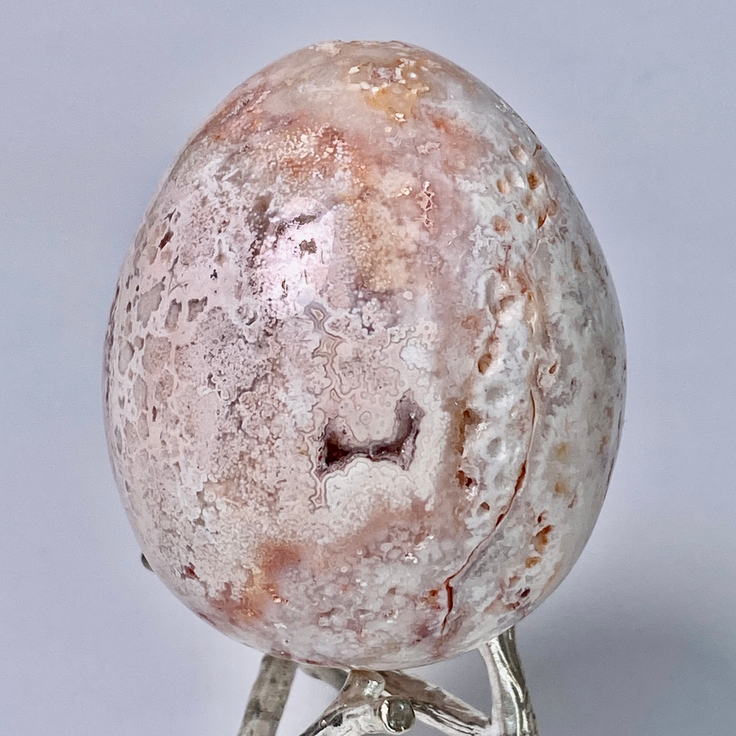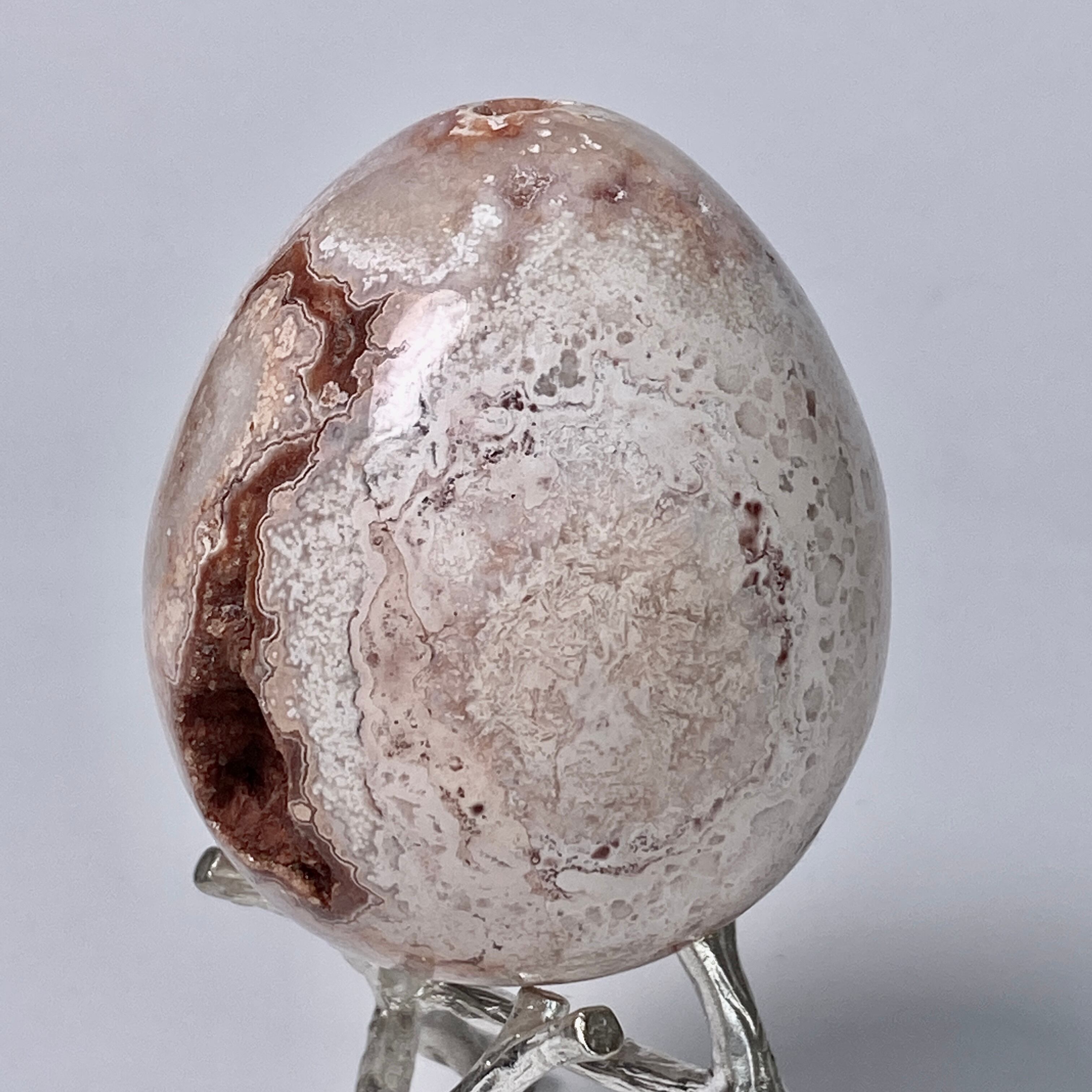 この石の特徴である入り組んだレース模様とバンディング(帯状の模様)が愛らしく、天然のポケット(穴)が幾つもあってこのエッグのナチュラル感を更に演出しています。特に頭からはもこもこのドゥルージー覗いてています。