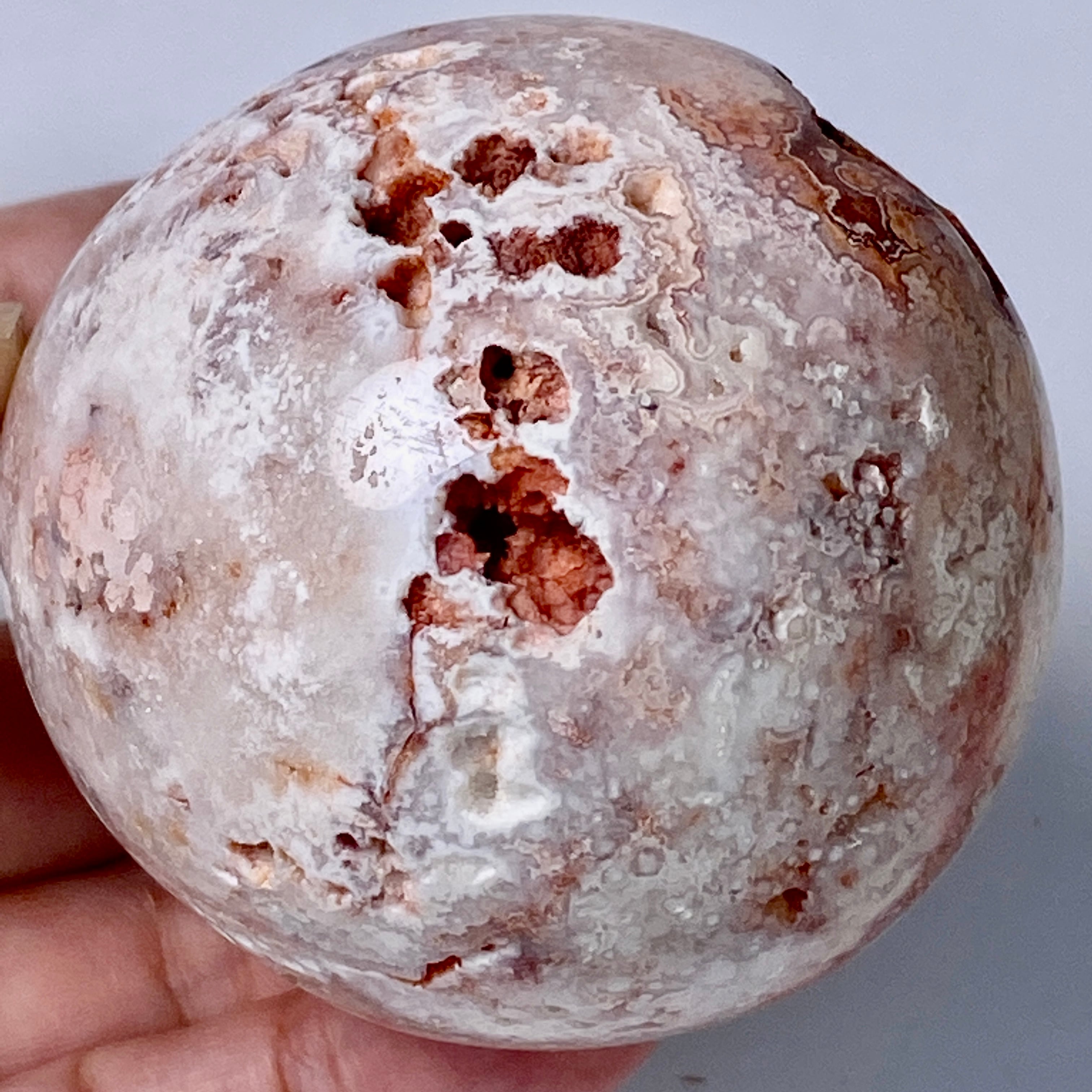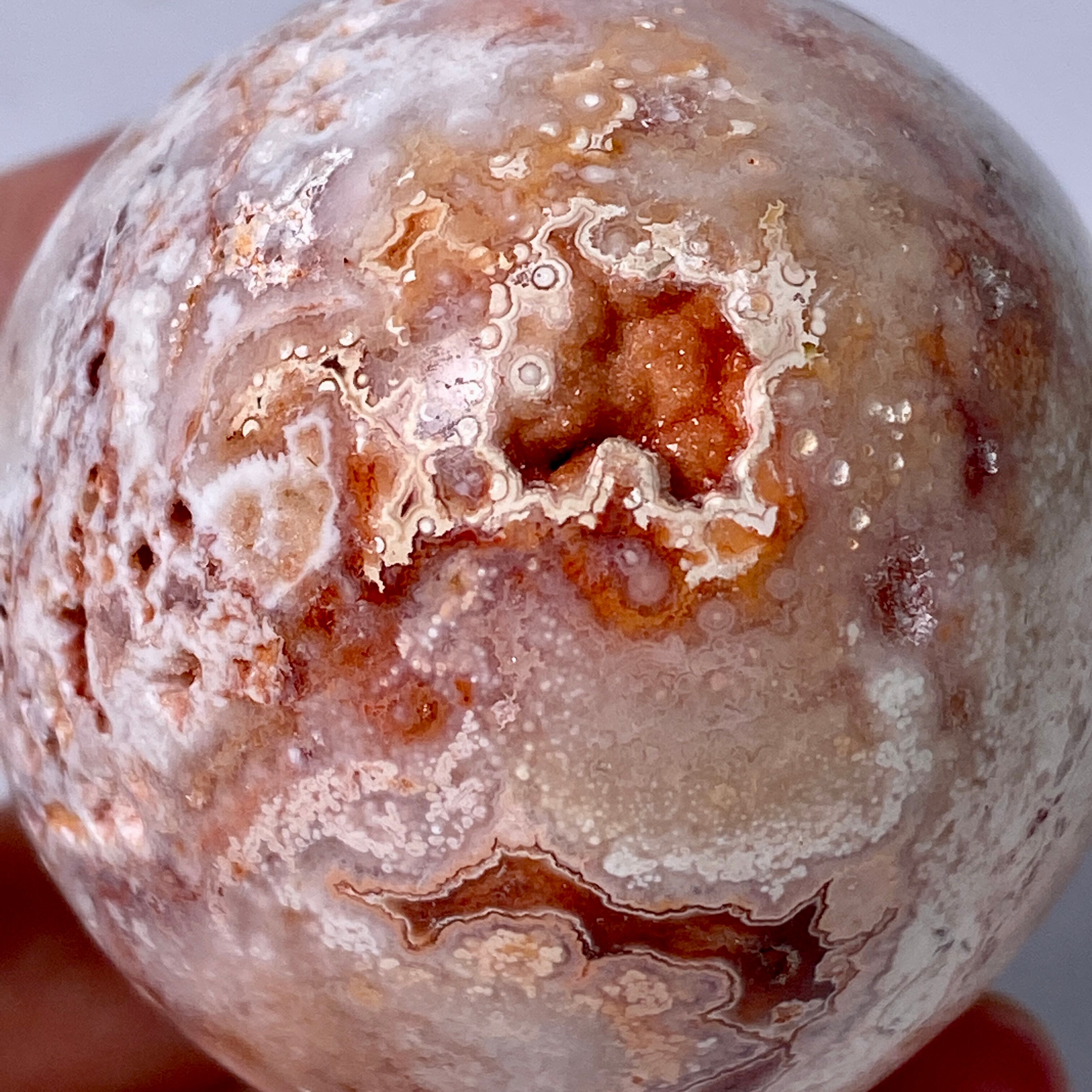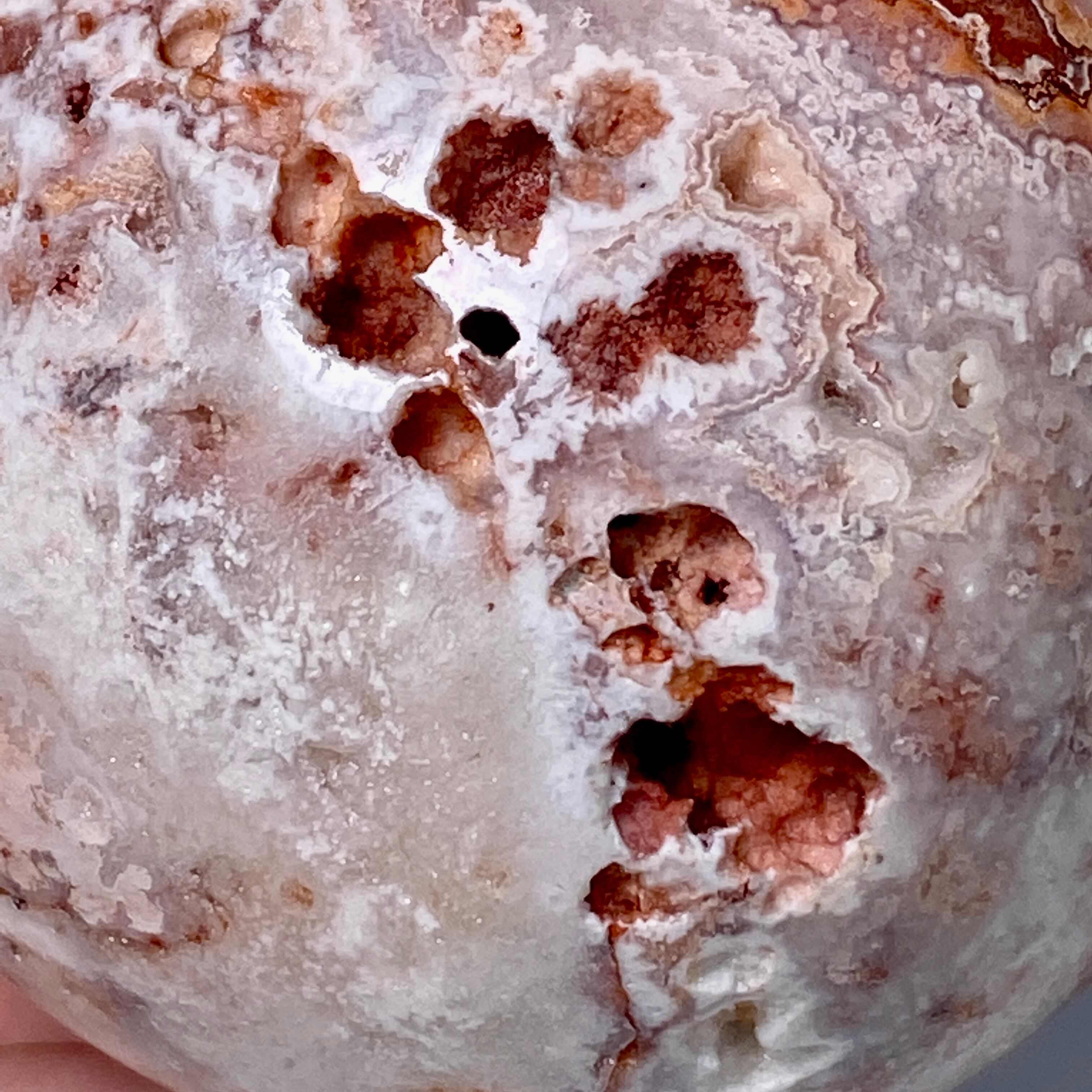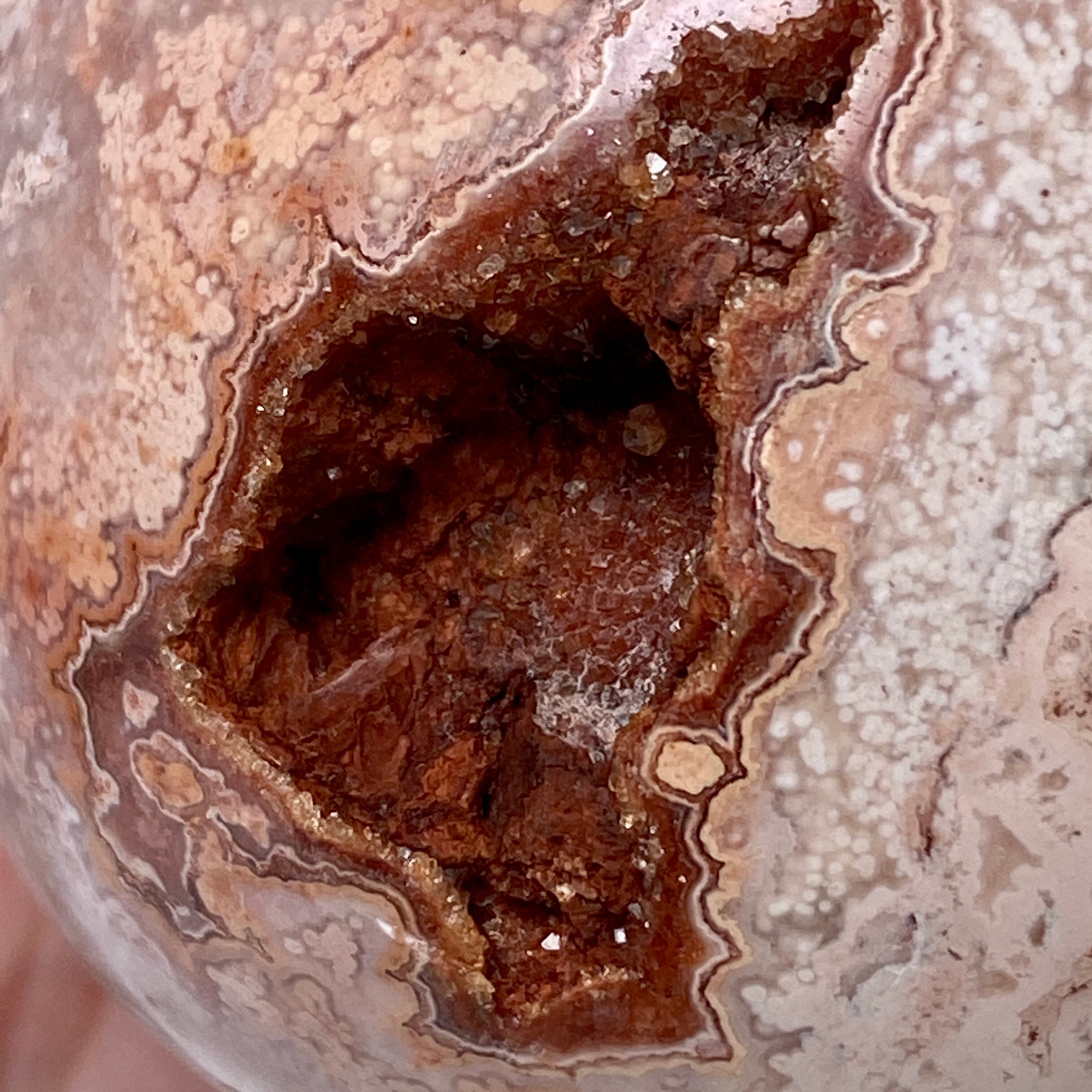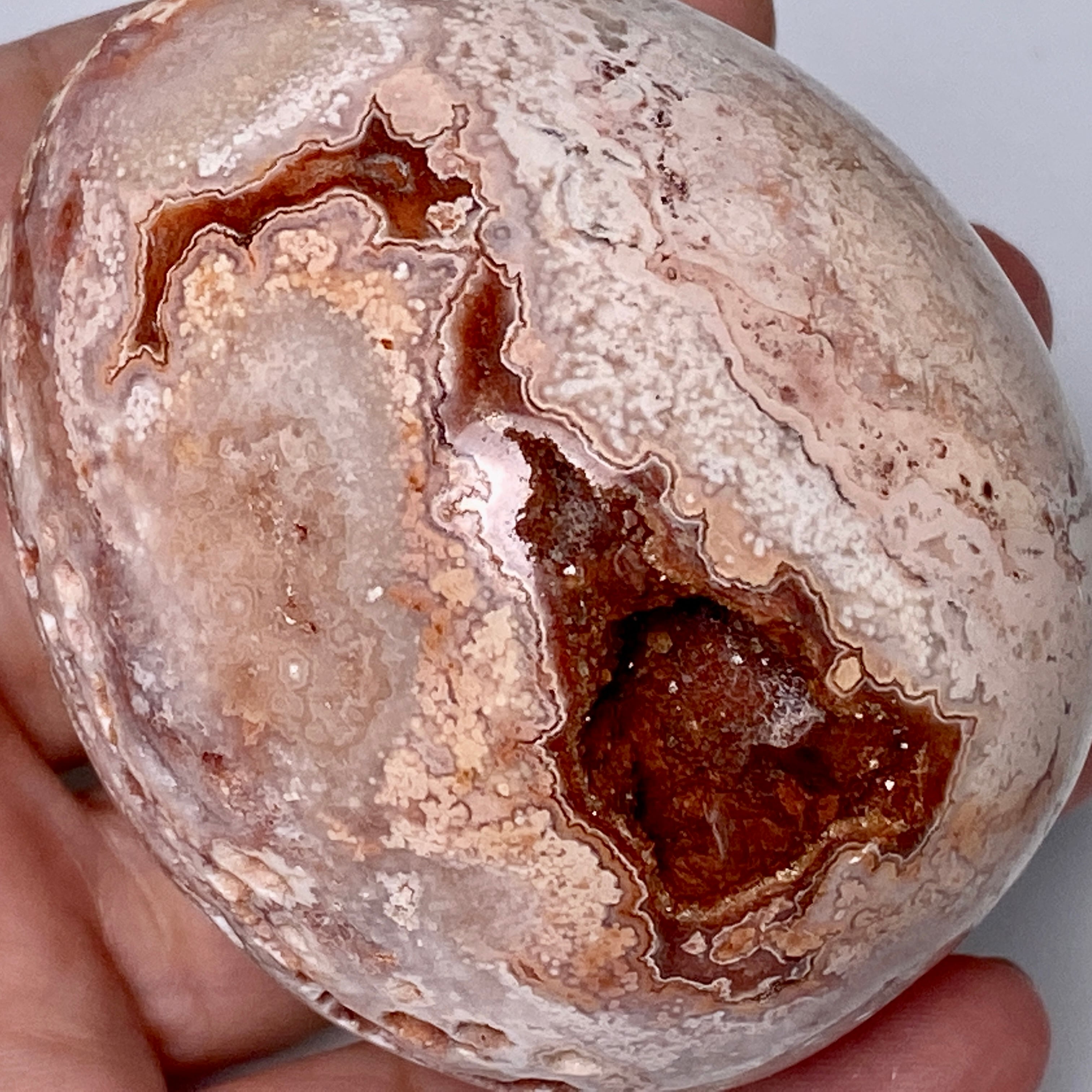 この石の特徴である入り組んだレース模様とバンディング(帯状の模様)が愛らしく、天然のポケット(穴)が幾つもあってこのエッグのナチュラル感を更に演出しています。特に頭からはもこもこのドゥルージー覗いてています。