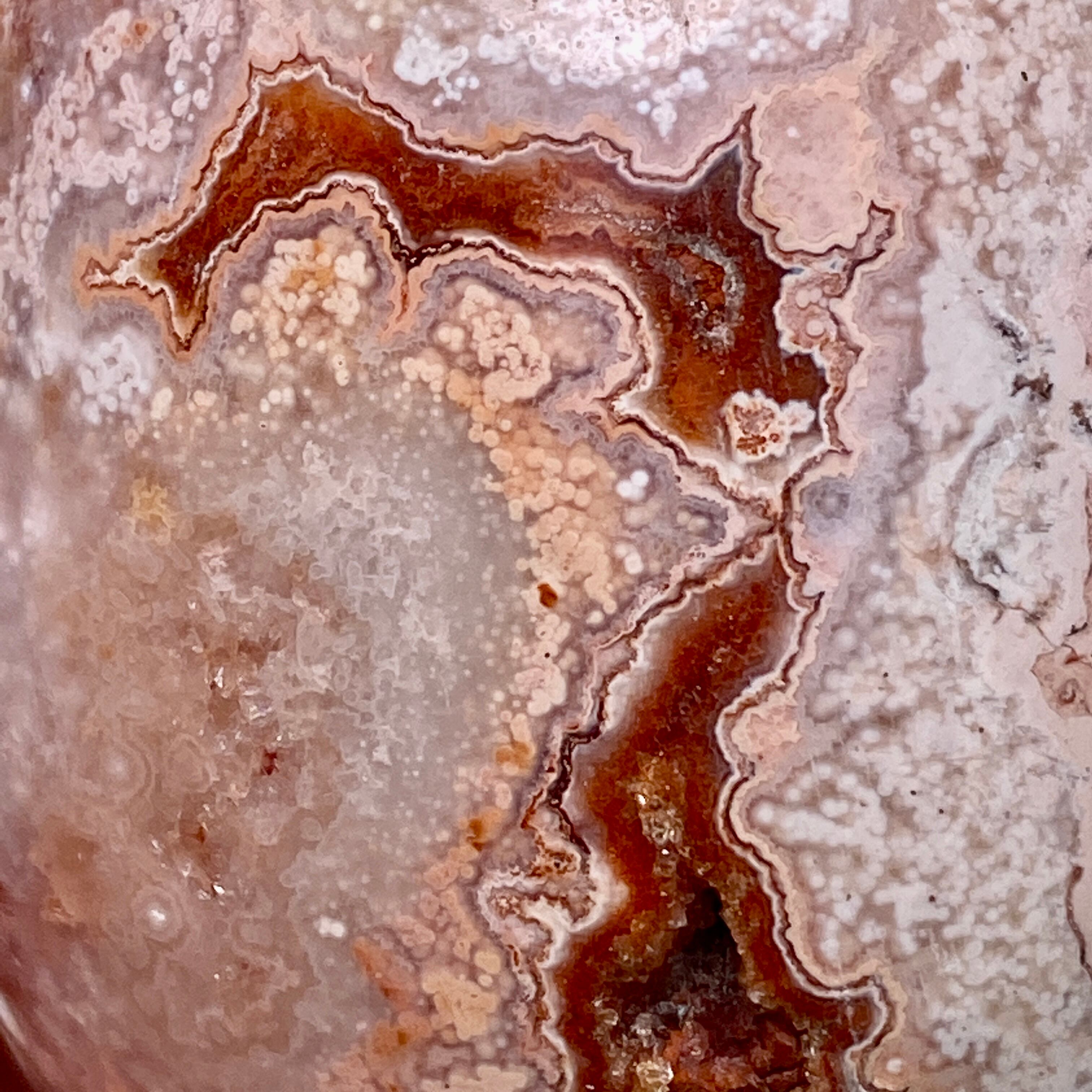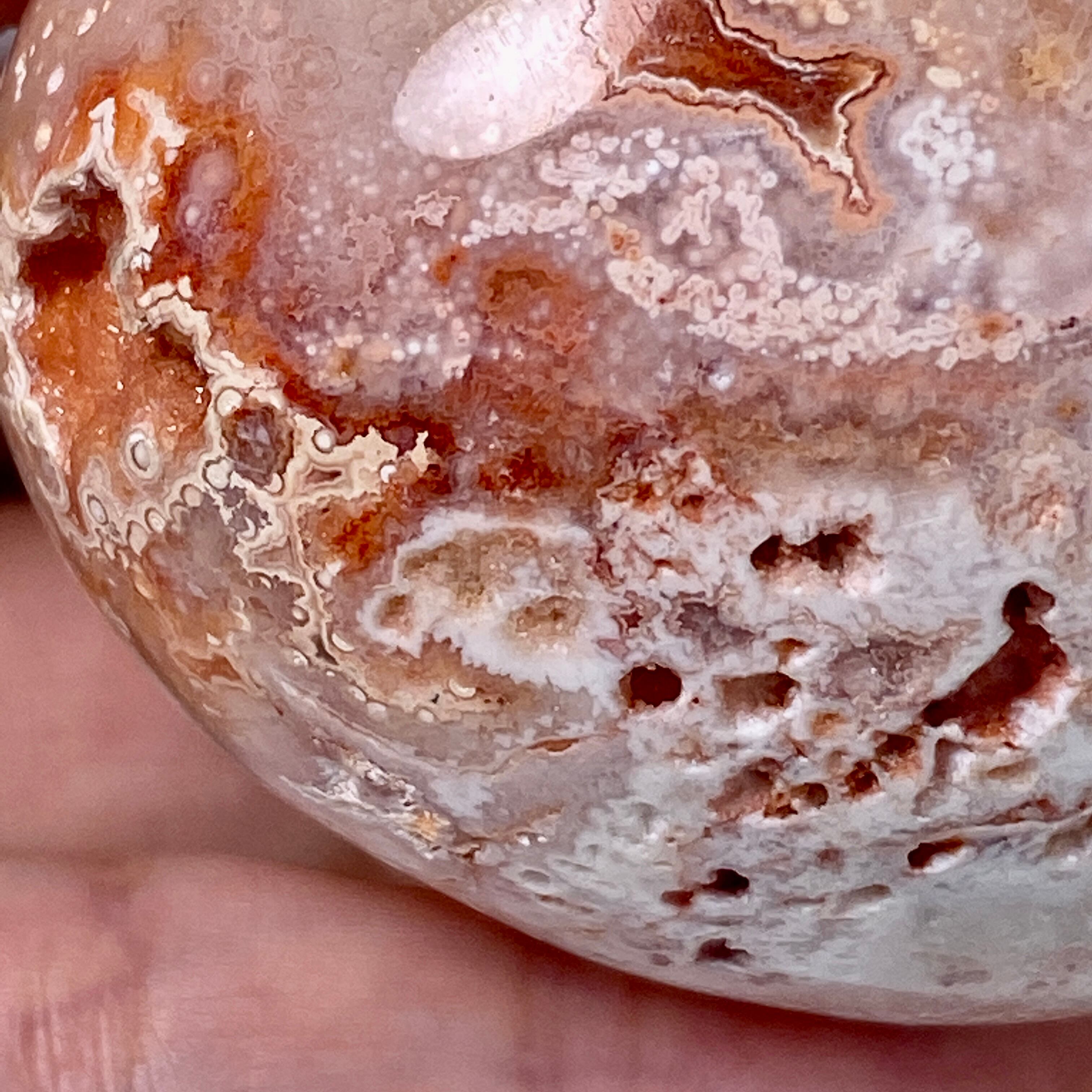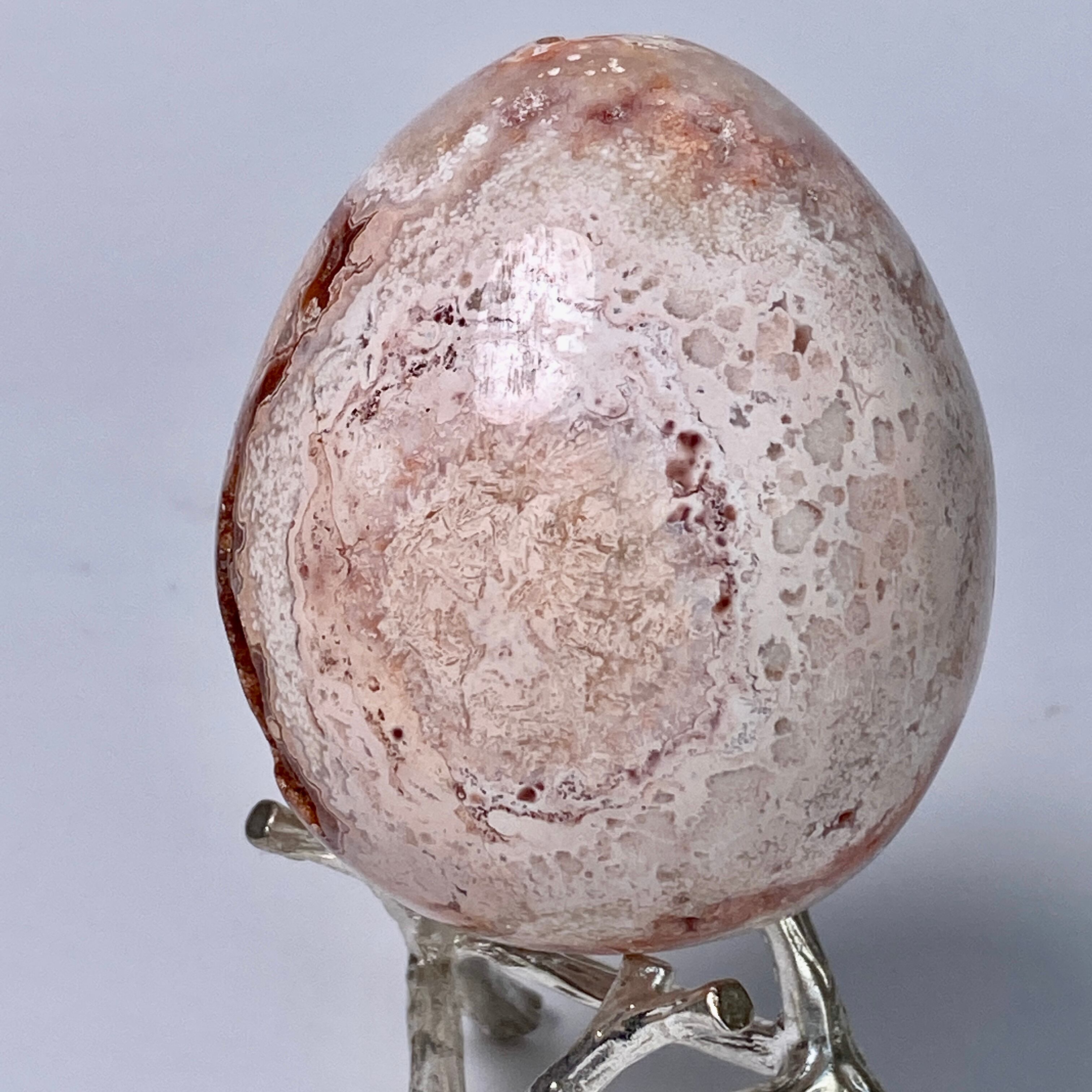 肌馴染みの良い淡いピンク/アプリコット系の色味が入った、クレイジーレースアゲートのエッグ型置物です。