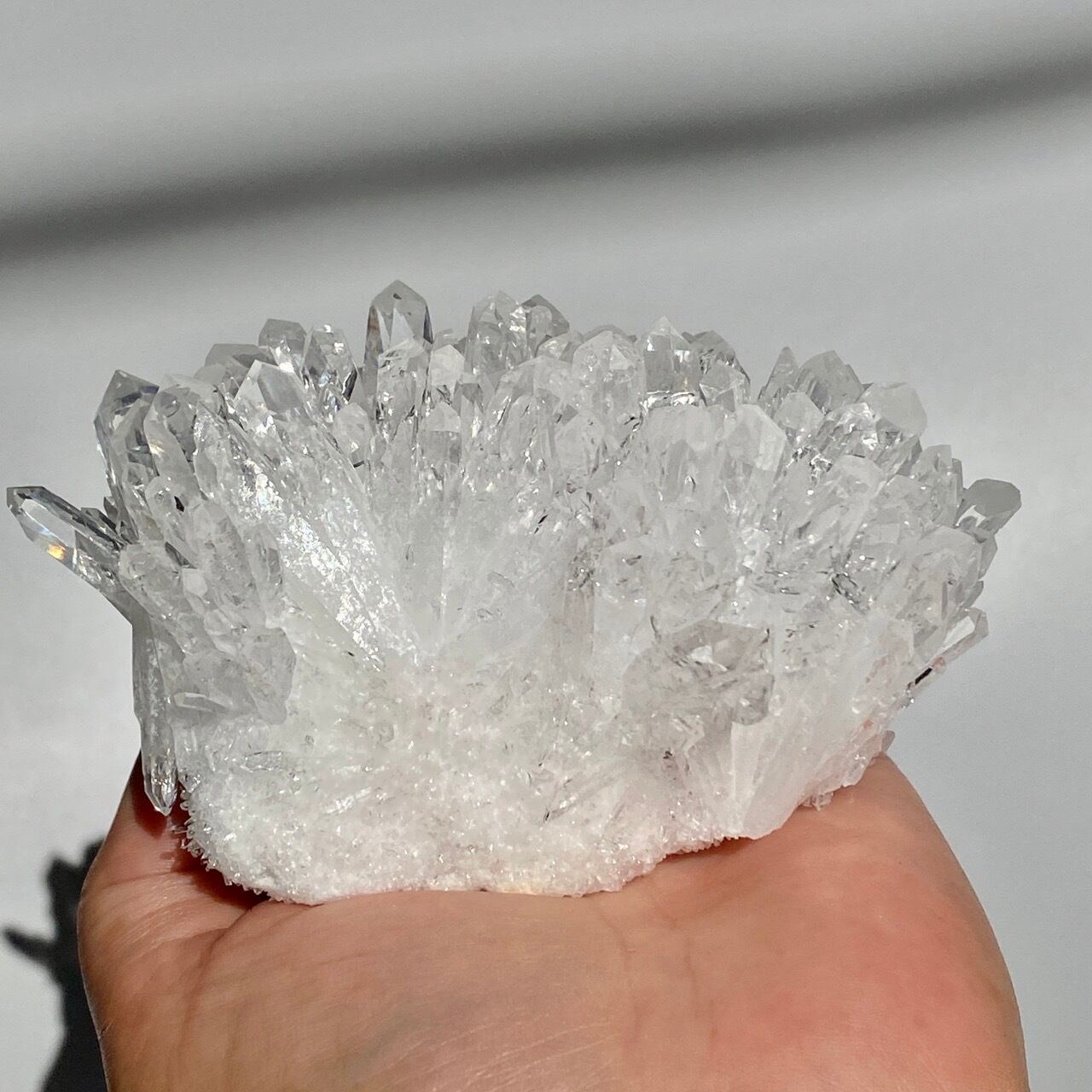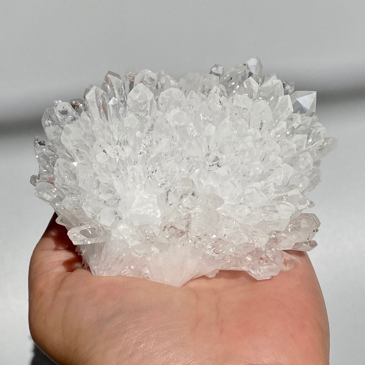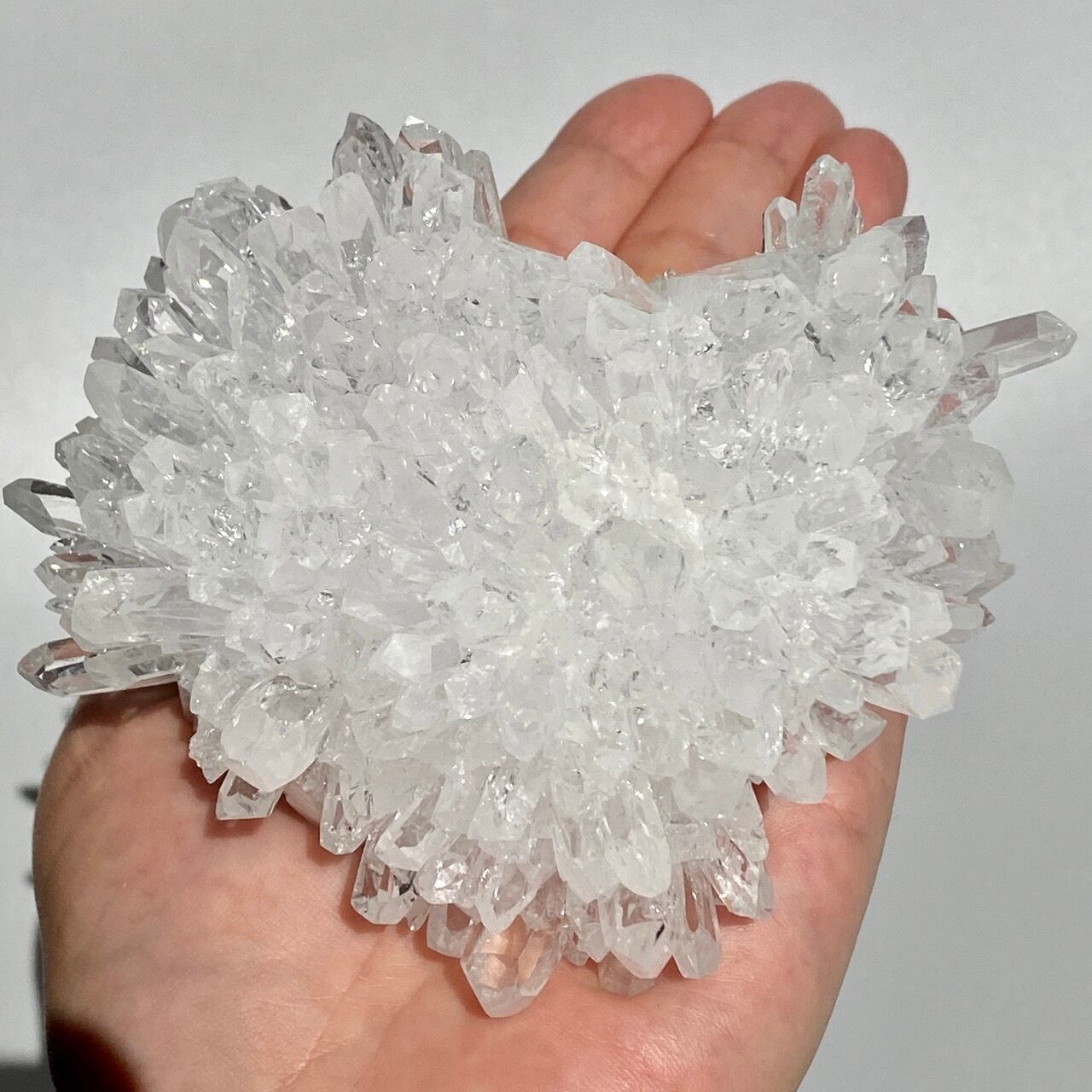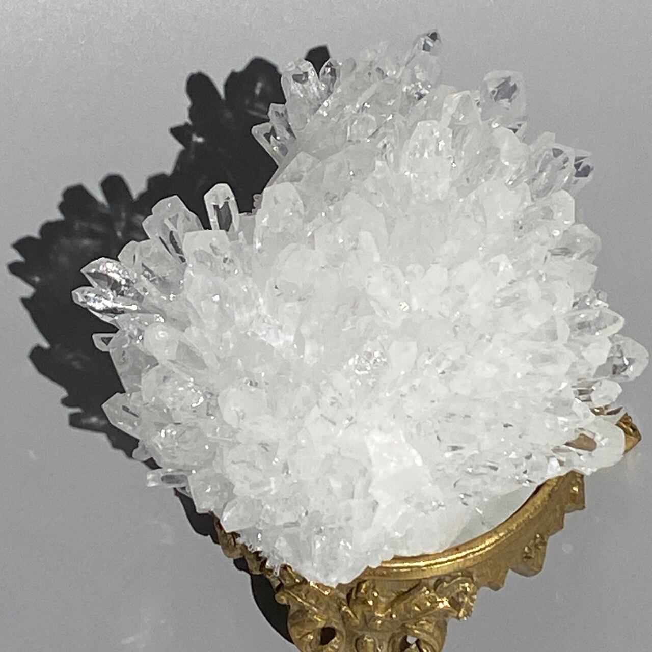 透明感と清涼感のあるポイントがぎっしりと詰まっており、真っ白な雪の様な母岩のせいで、全体的に白い花のような印象を与えています。高さもあり、形状もハートのようで、手のひらに載せた時のピュアホワイトの水晶クラスターがきらっきらと輝き、愛おしくてドキドキするような美しさです。夜室内で眺めても、その白さが際立ちます(実際の色味は最初の画像に光沢を加えた感じです)。