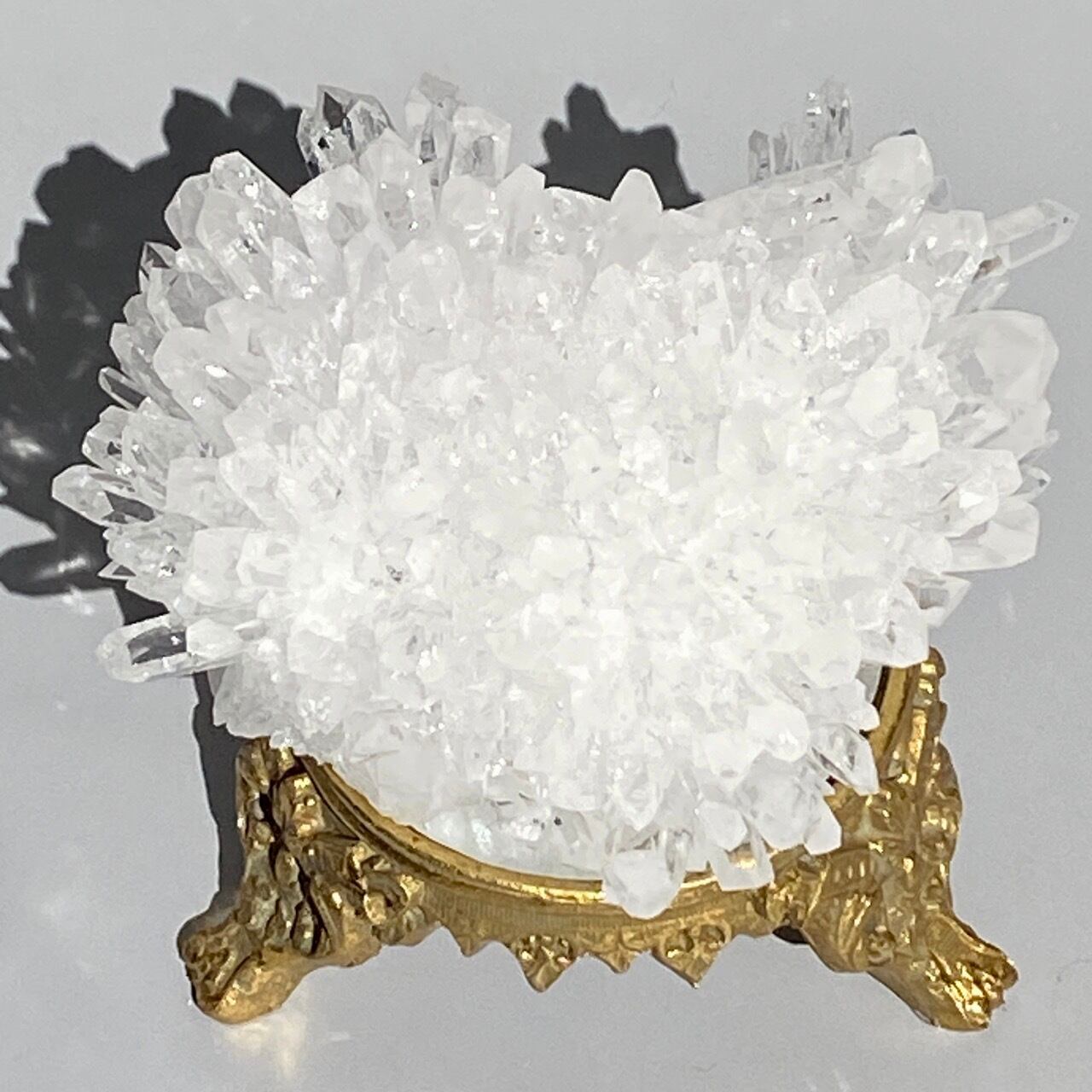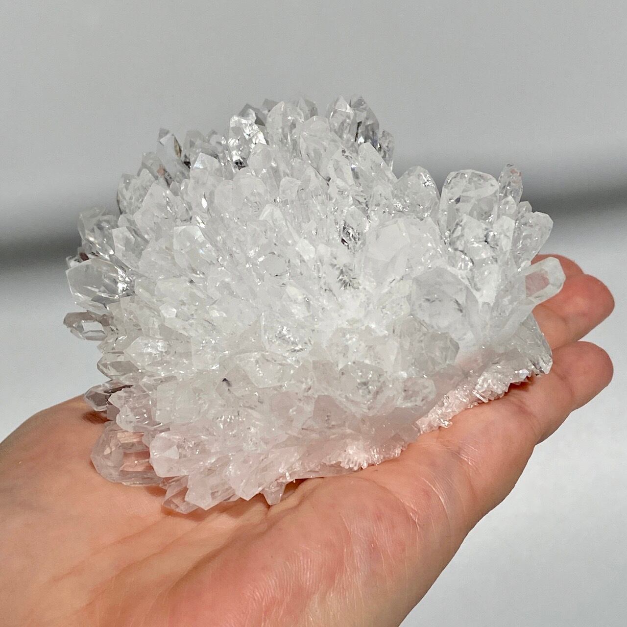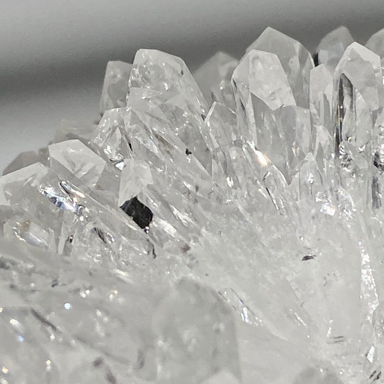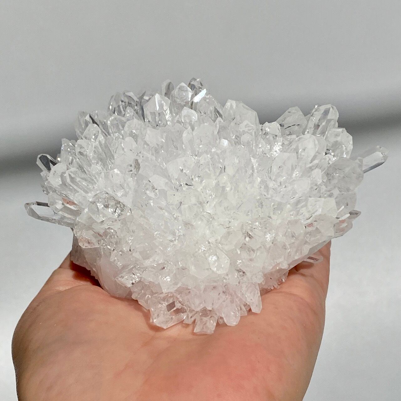 透明感と清涼感のあるポイントがぎっしりと詰まっており、真っ白な雪の様な母岩のせいで、全体的に白い花のような印象を与えています。高さもあり、形状もハートのようで、手のひらに載せた時のピュアホワイトの水晶クラスターがきらっきらと輝き、愛おしくてドキドキするような美しさです。夜室内で眺めても、その白さが際立ちます(実際の色味は最初の画像に光沢を加えた感じです)。