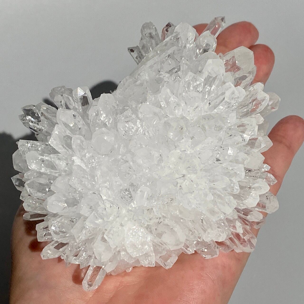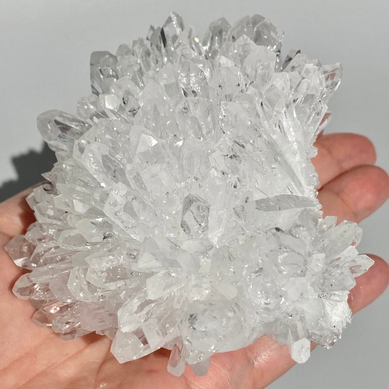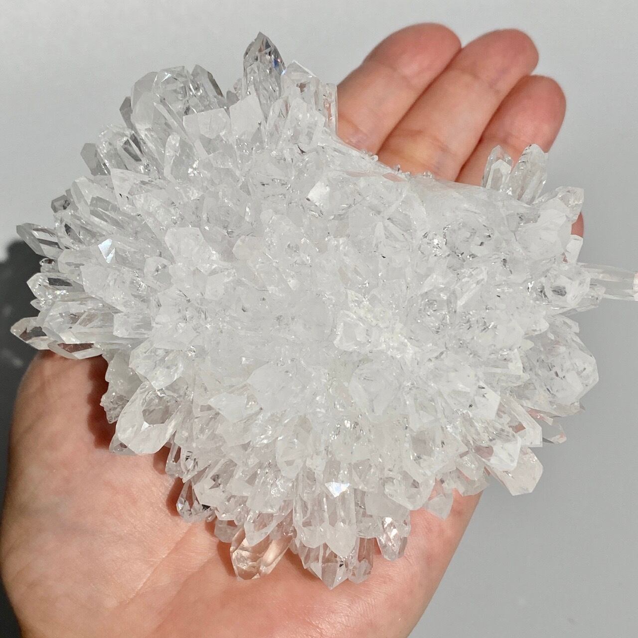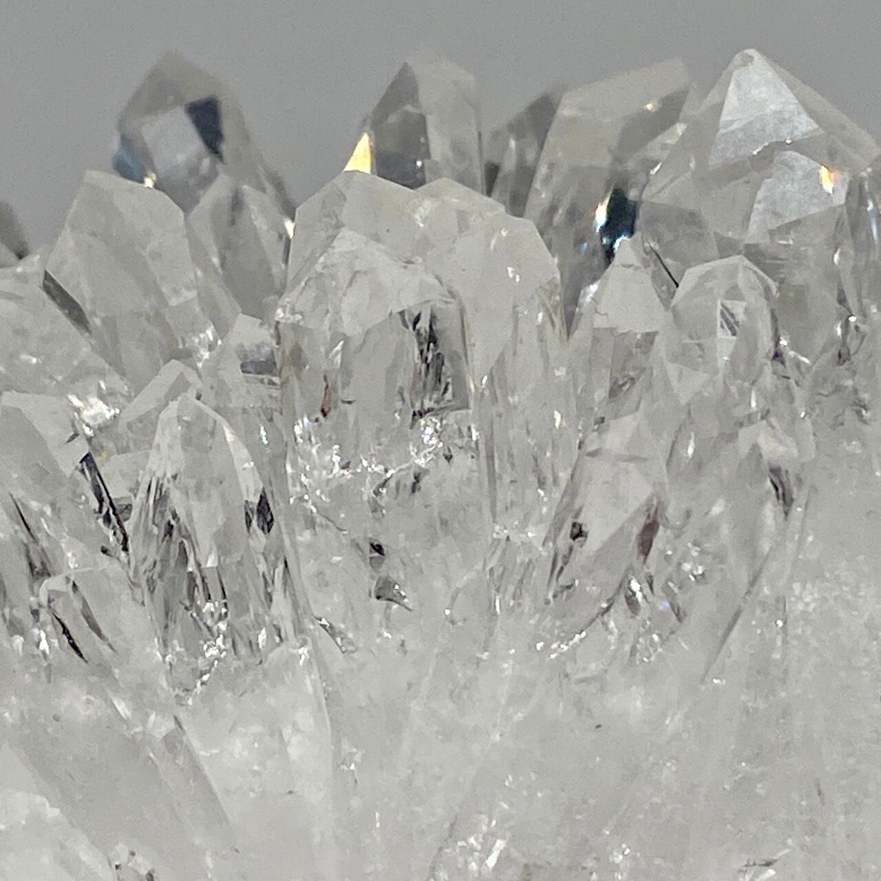 透明感と清涼感のあるポイントがぎっしりと詰まっており、真っ白な雪の様な母岩のせいで、全体的に白い花のような印象を与えています。高さもあり、形状もハートのようで、手のひらに載せた時のピュアホワイトの水晶クラスターがきらっきらと輝き、愛おしくてドキドキするような美しさです。夜室内で眺めても、その白さが際立ちます(実際の色味は最初の画像に光沢を加えた感じです)。