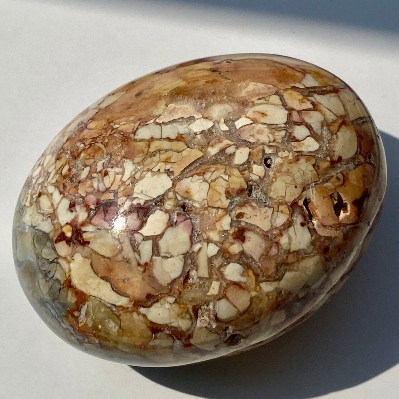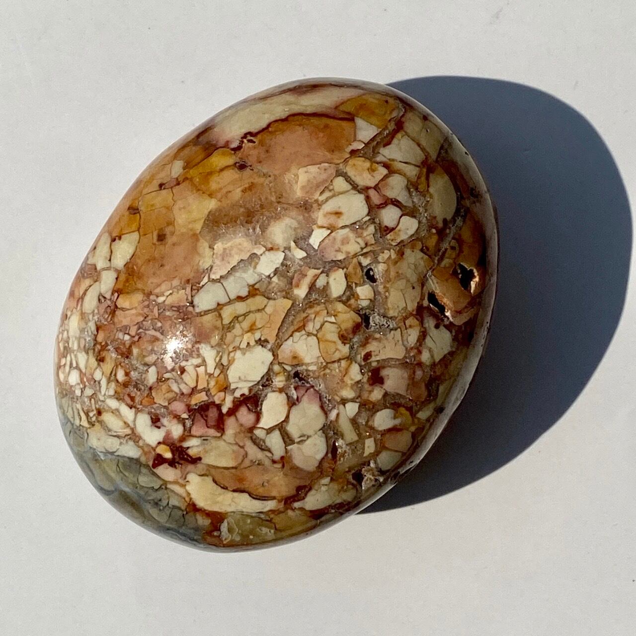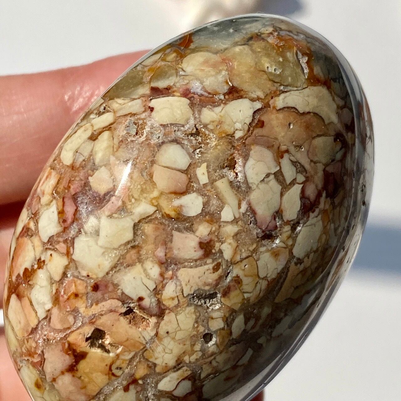 アイビスジャスパーは壊れた卵の殻の様な模様のためエッグシェルジャスパーとも呼ばれています。名前の由来はエジプトのIBIS BIRDの羽に類似しているらそう名付けられたそうです。