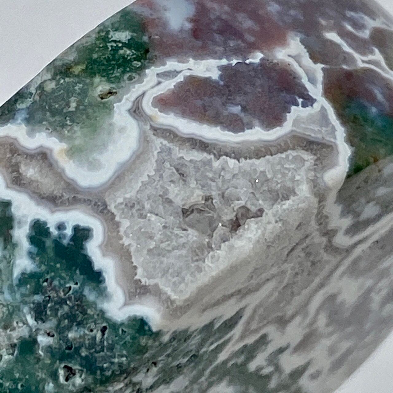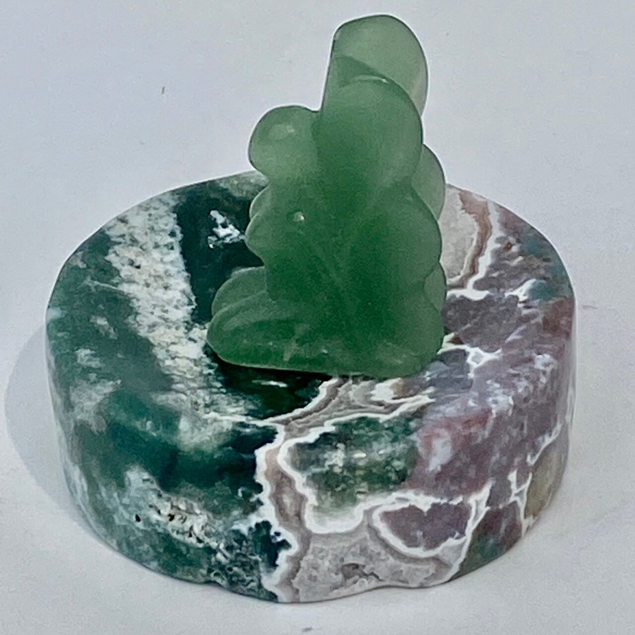表面を横切るバンディング(帯状の模様)の中にクウォーツが顔を覗かせている小さいサイズのモスアゲートのボウルです。底面の柄もキュートで、このような芸術的な模様のピースは唯一無二でなかなか出ないので、早い者勝ちです。