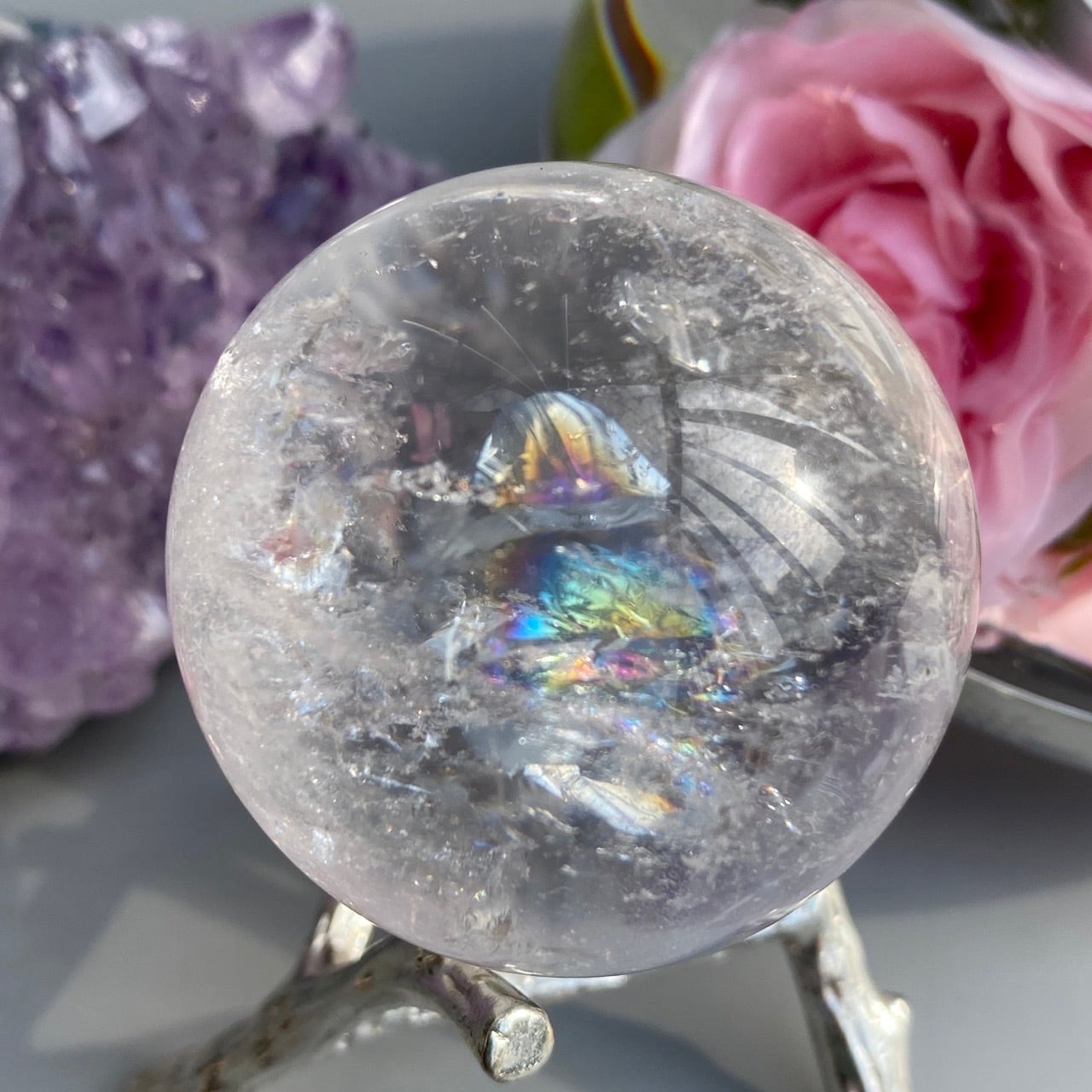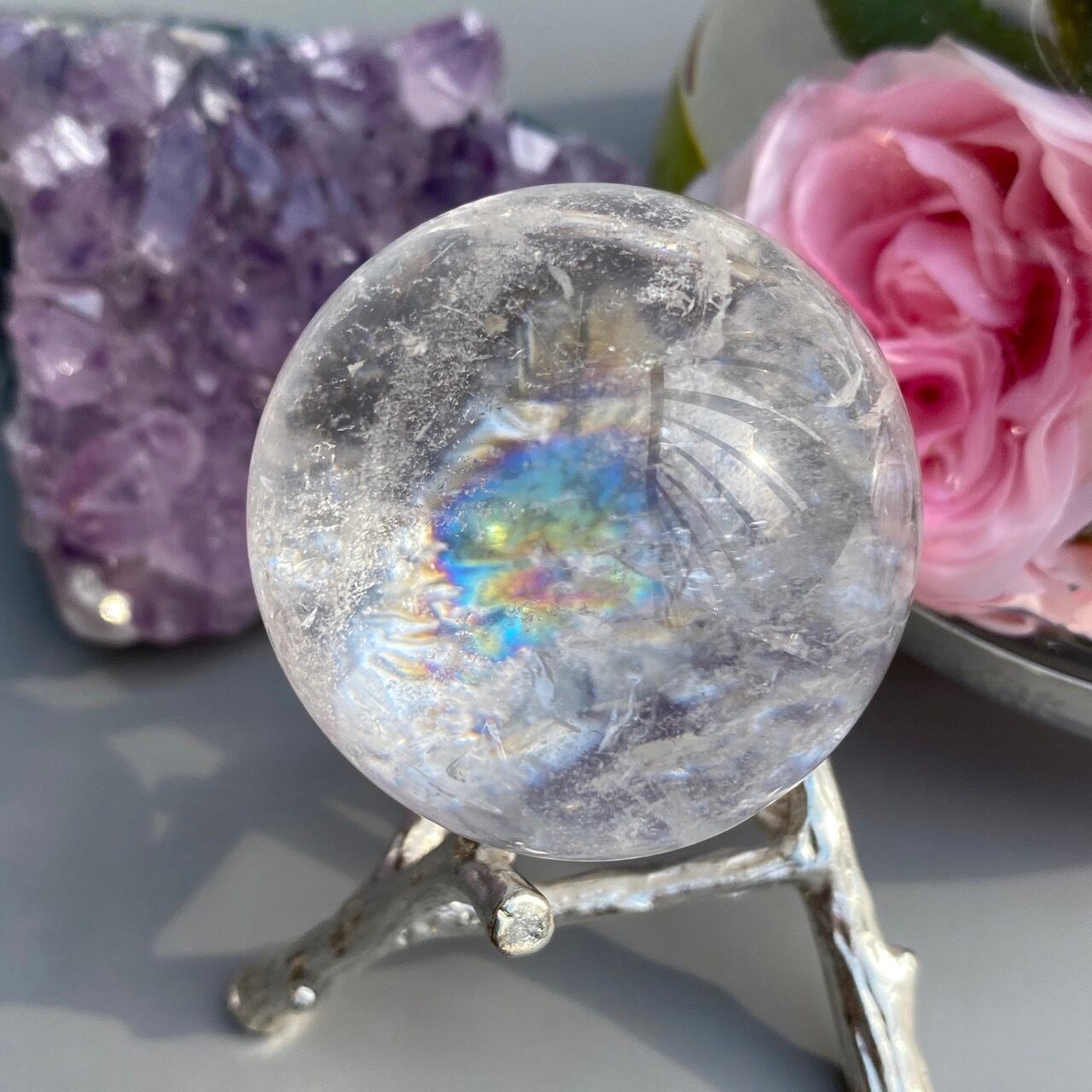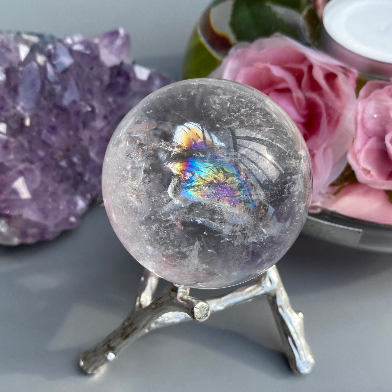 虹入りのクリアクォーツ(アイリスクォーツ)のスフィアになります。内部のクラック部分に見られる虹が美しいです。角度を変えながら出てくる虹をお楽しみ下さい。