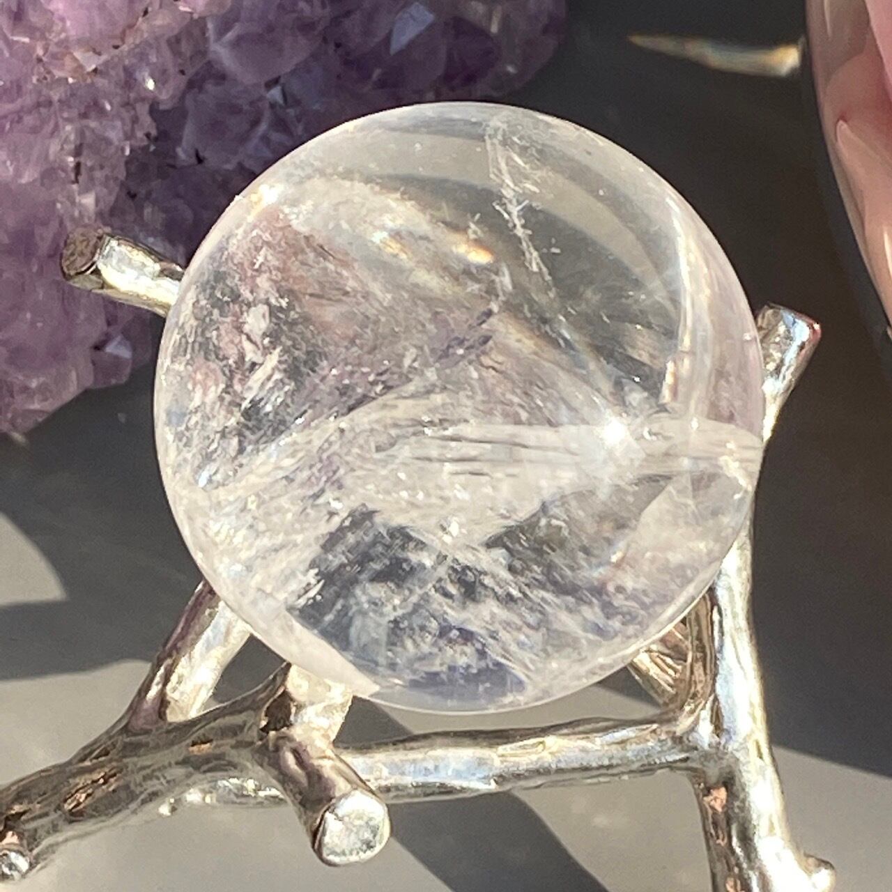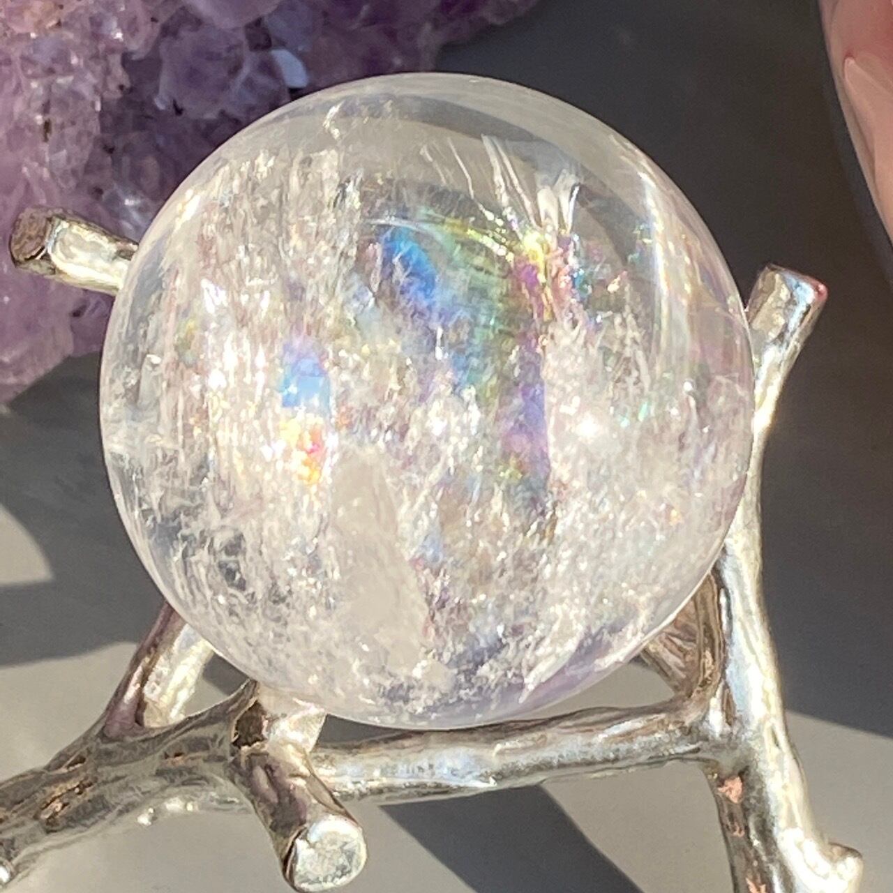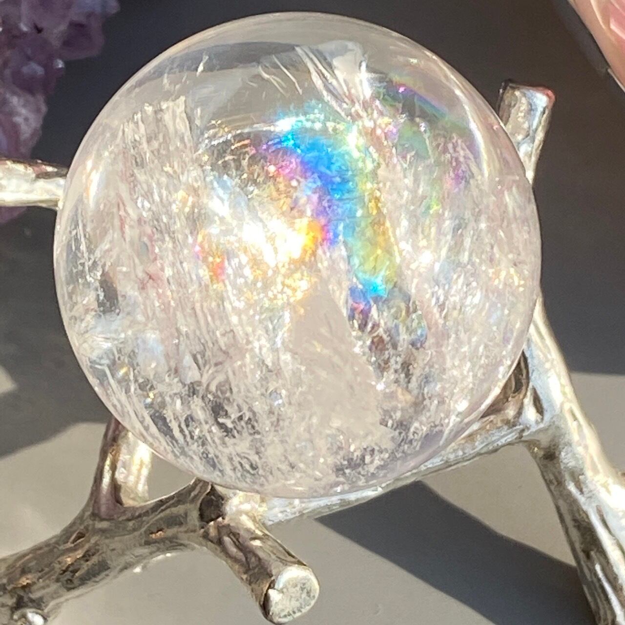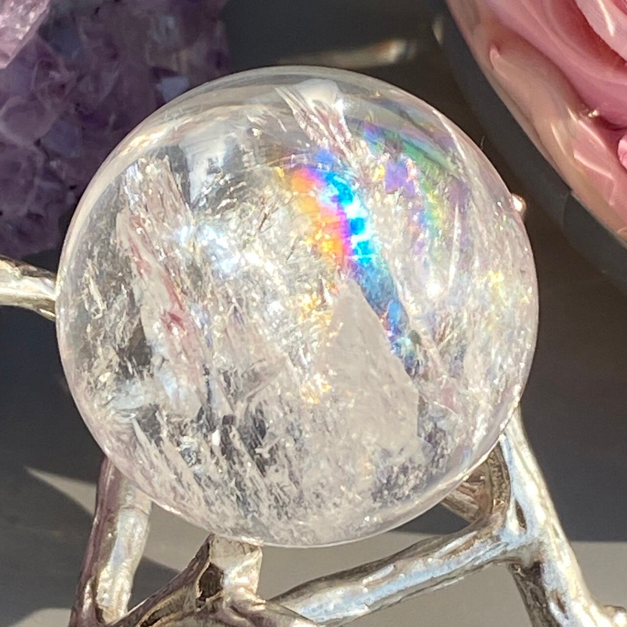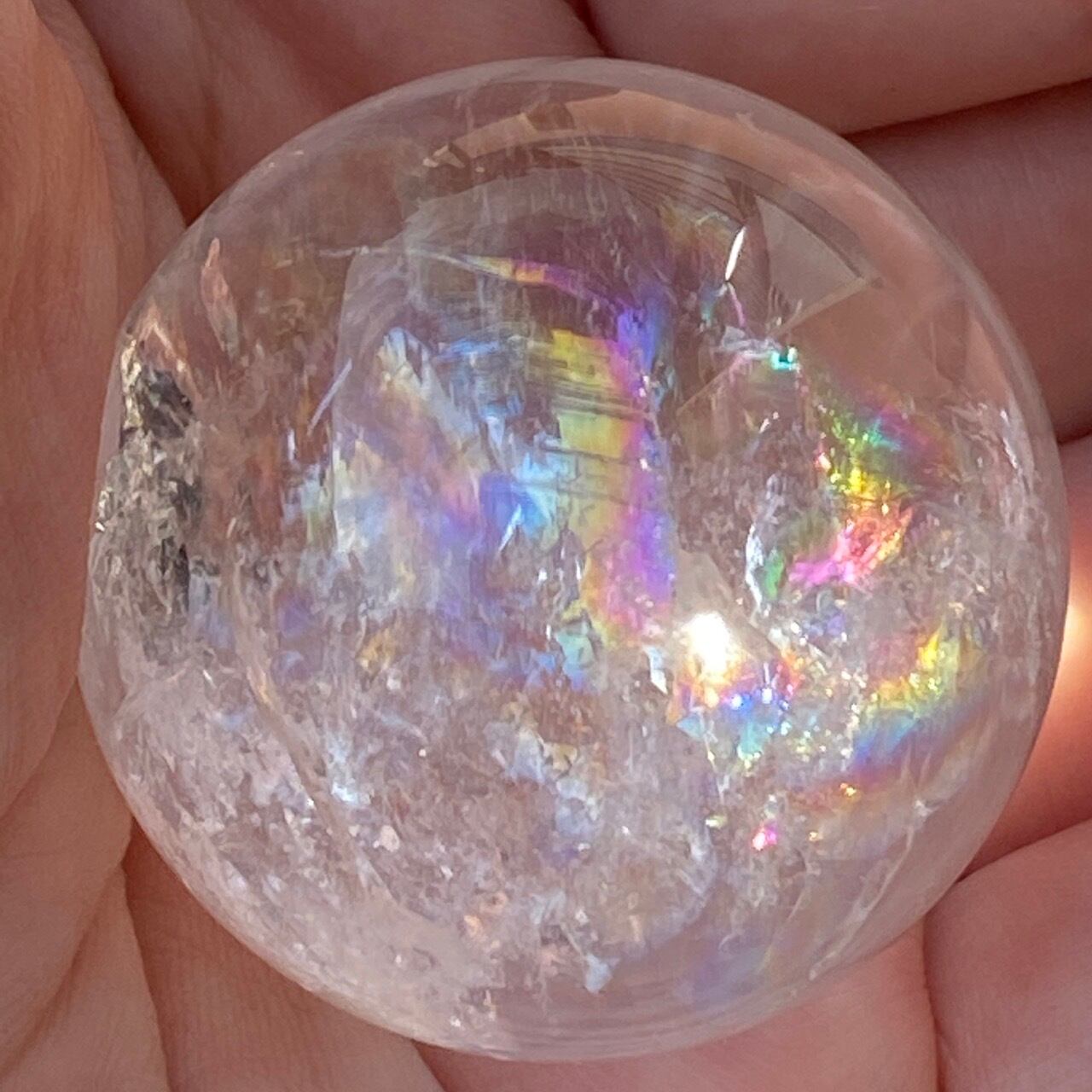 虹入りのクリアクォーツ(アイリスクォーツ)のスフィアになります。内部のクラック部分に見られる虹が美しいです。角度を変えながら出てくる虹をお楽しみ下さい。