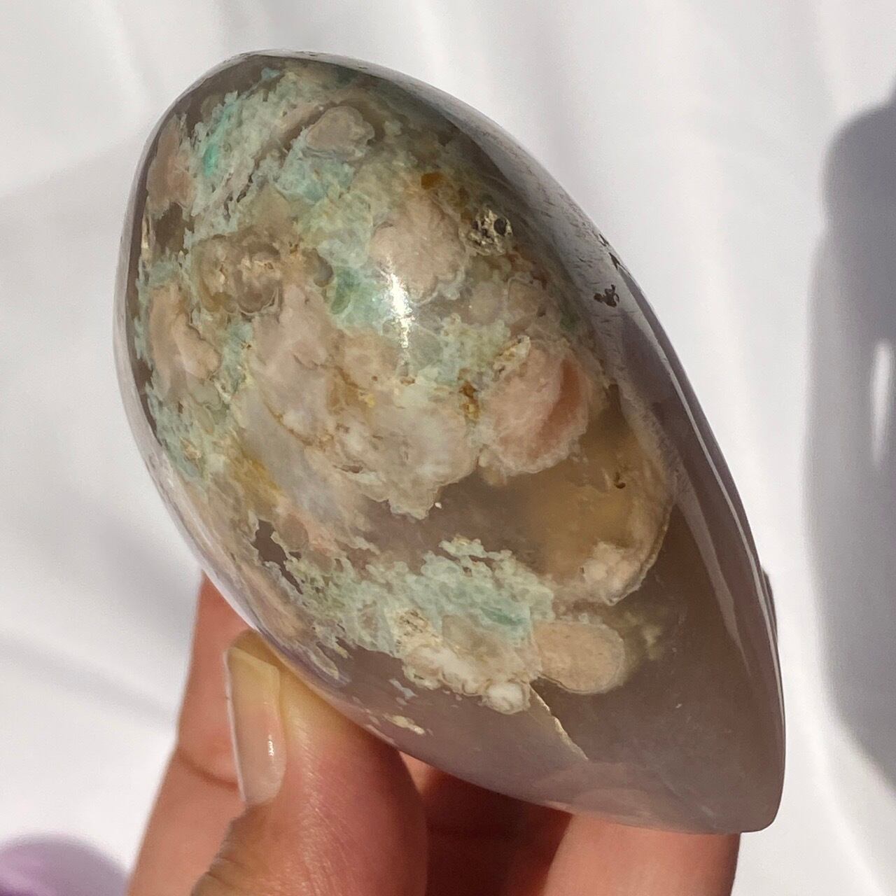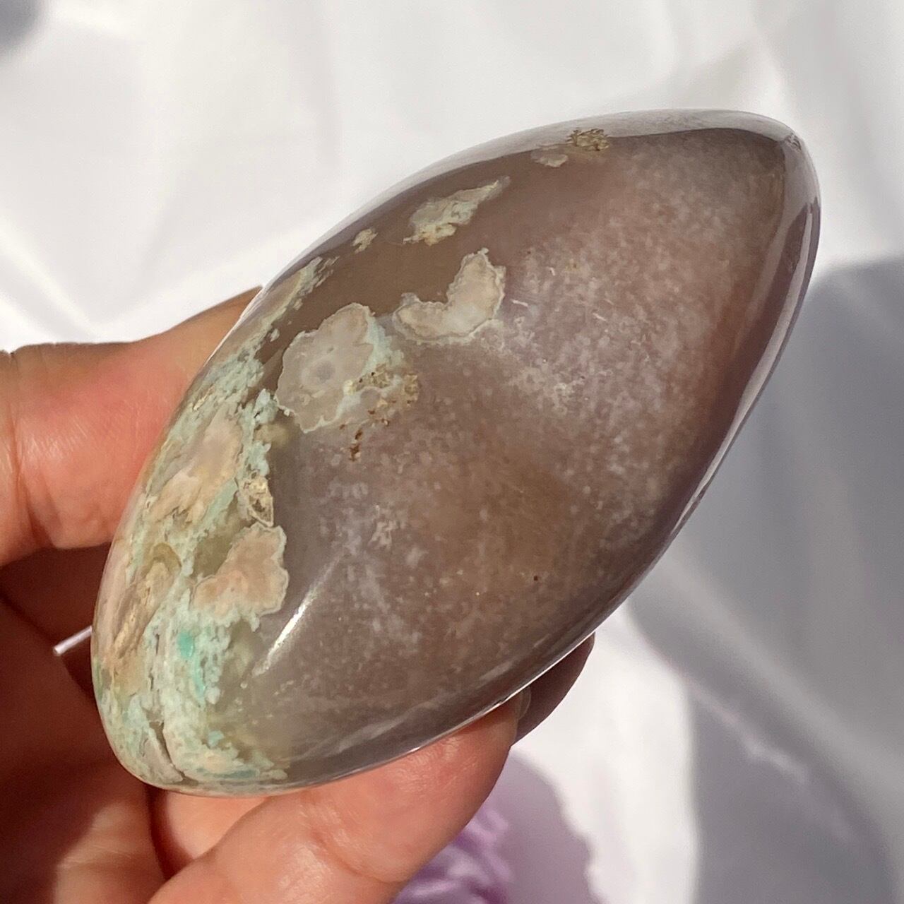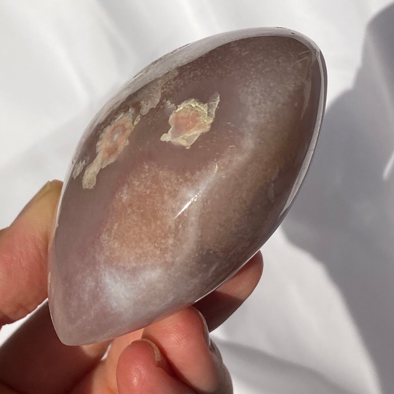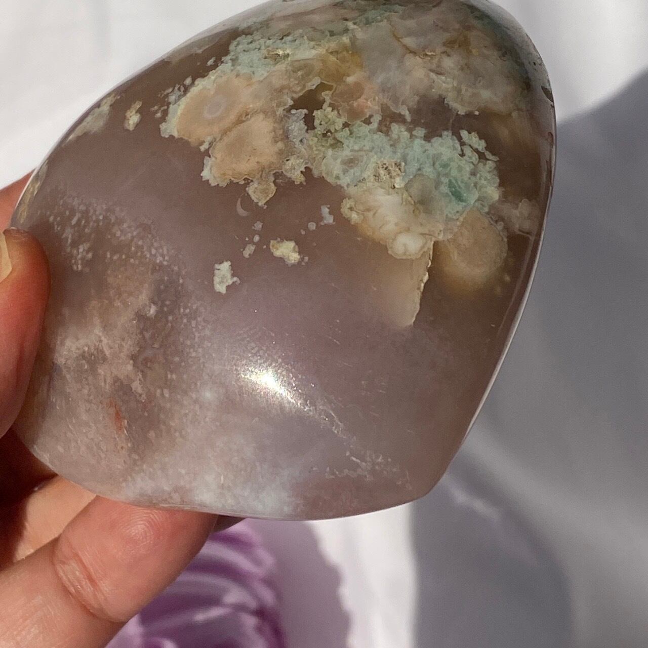 幸運にも購入できた時は他のバイヤーから口々に『本当にラッキー。ゴージャスね!』と言われたお品です。とりわけ、このようなラベンダーがかった色味は、アメリカでは人気があり、フラワーアゲートでこのような色味はあまり無いからです。