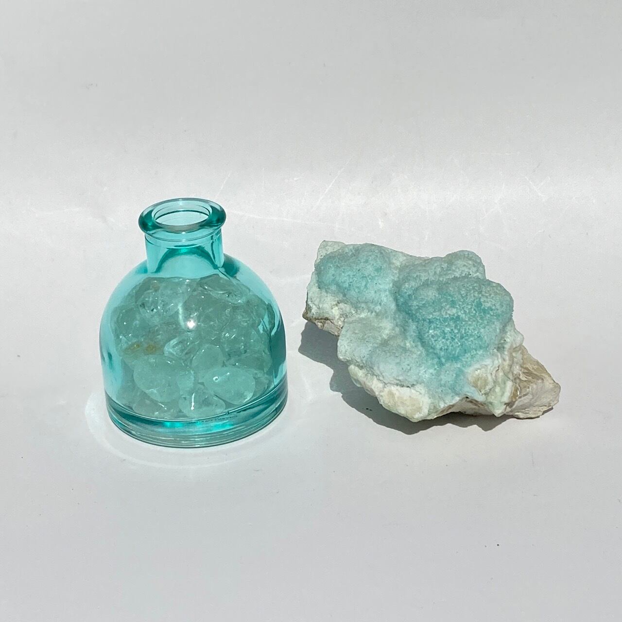 尚、厳重に梱包いたしますが、この天然石の特性・構造上、輸送中に部分的に破損を起こす場合がございます。ブルーアラゴナイトは、雲母の様に、ポロポロと粉が落ちてくる事がありますので、ハンドリングにはご注意下さい。