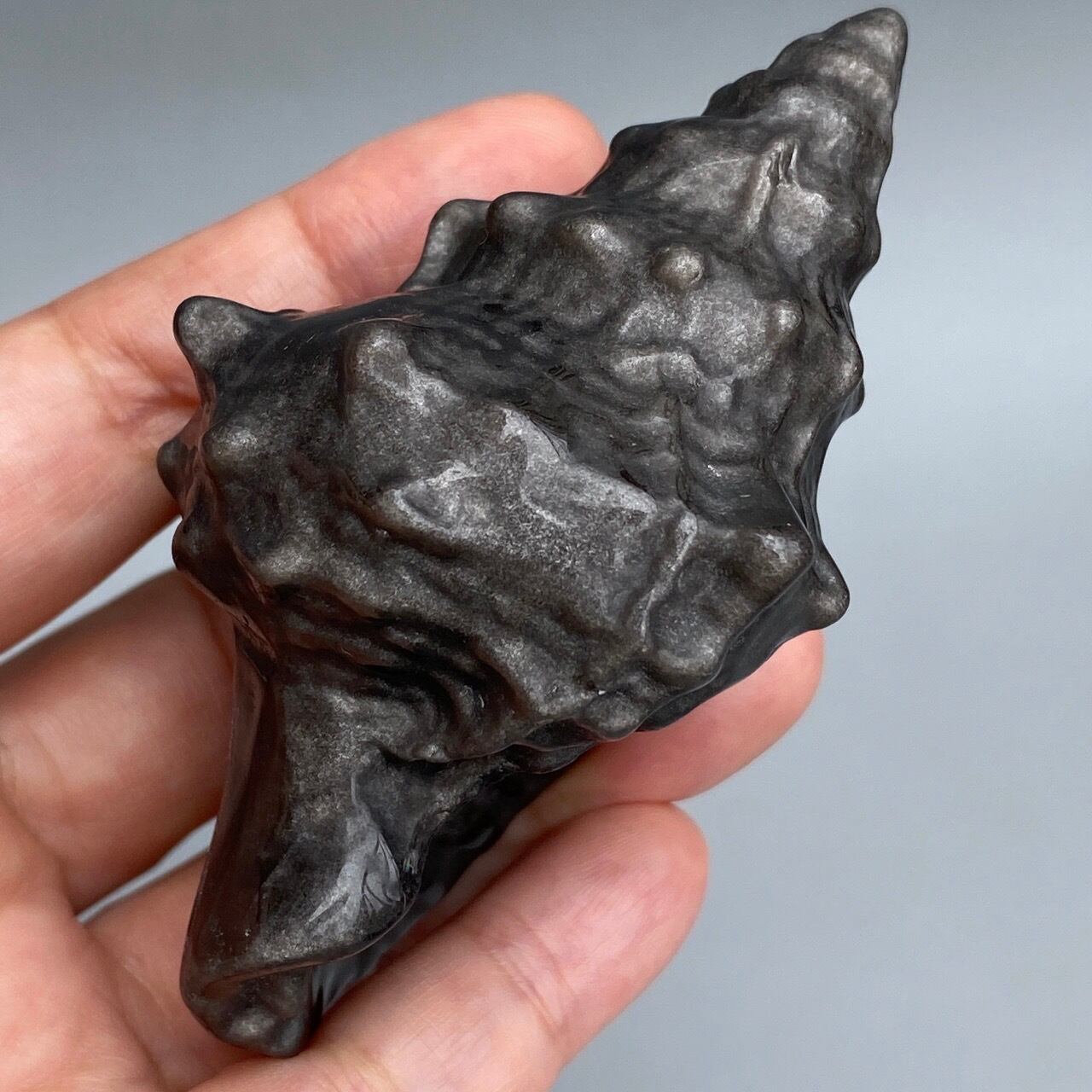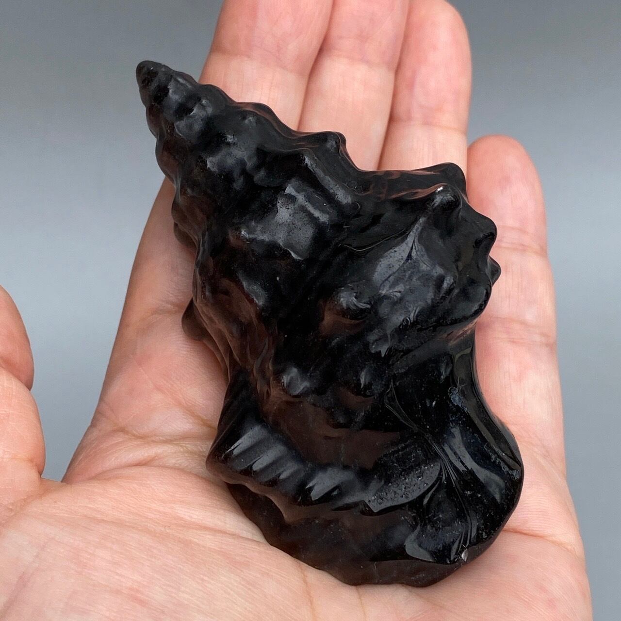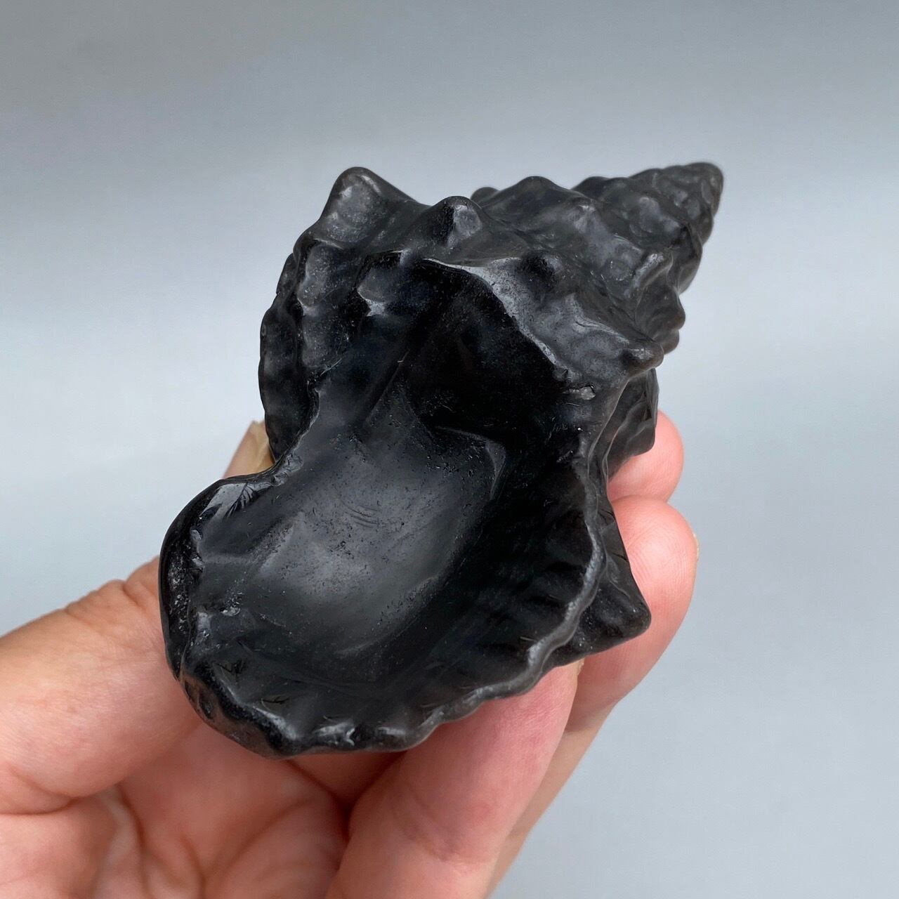 角度により、シルバーのシラーが見られるブラックオブシディアンの貝の置物になります。