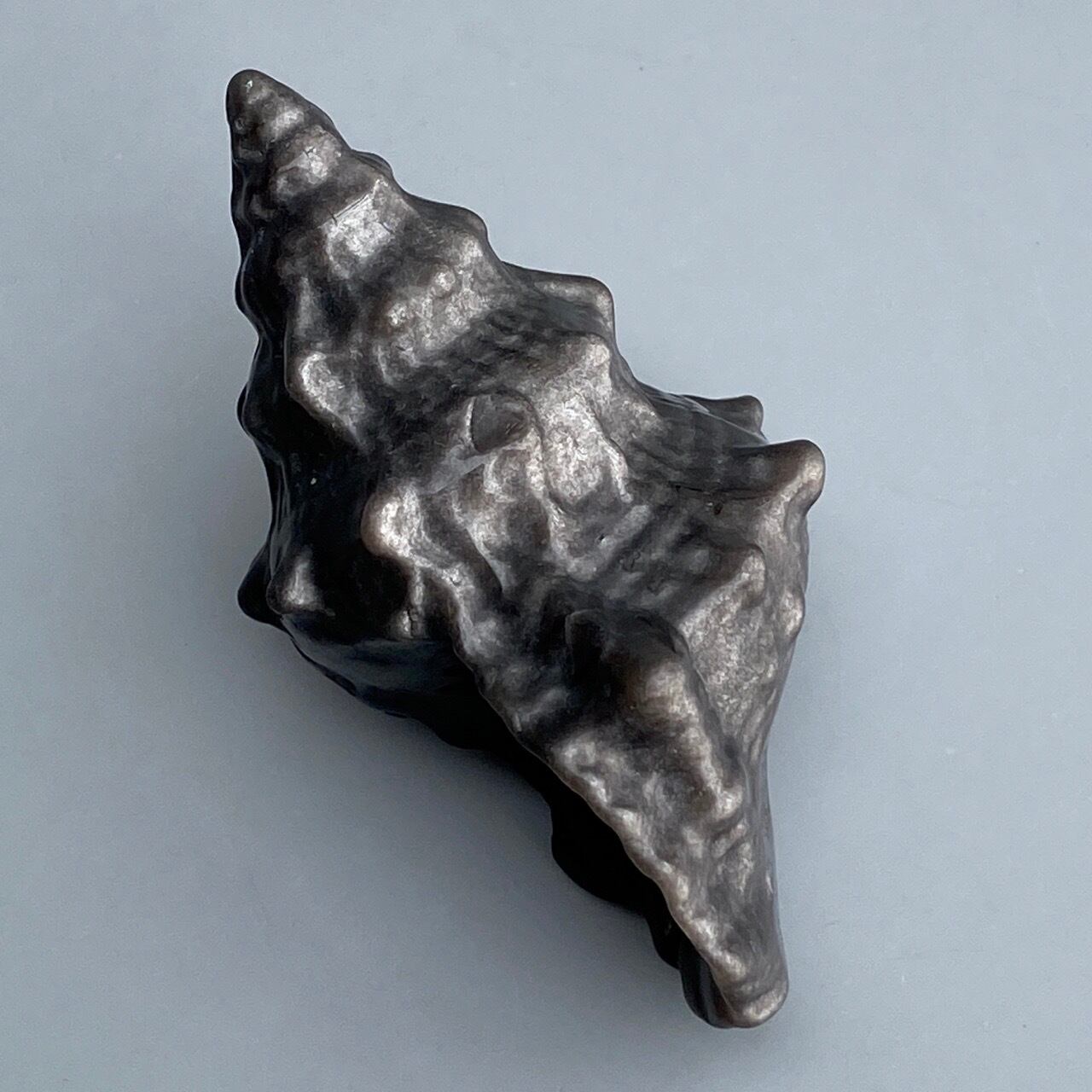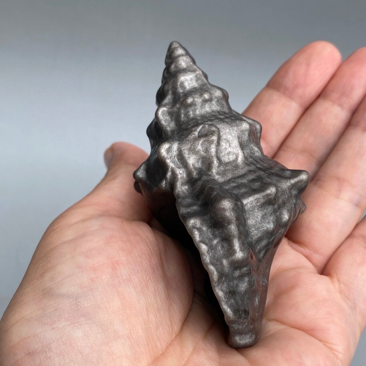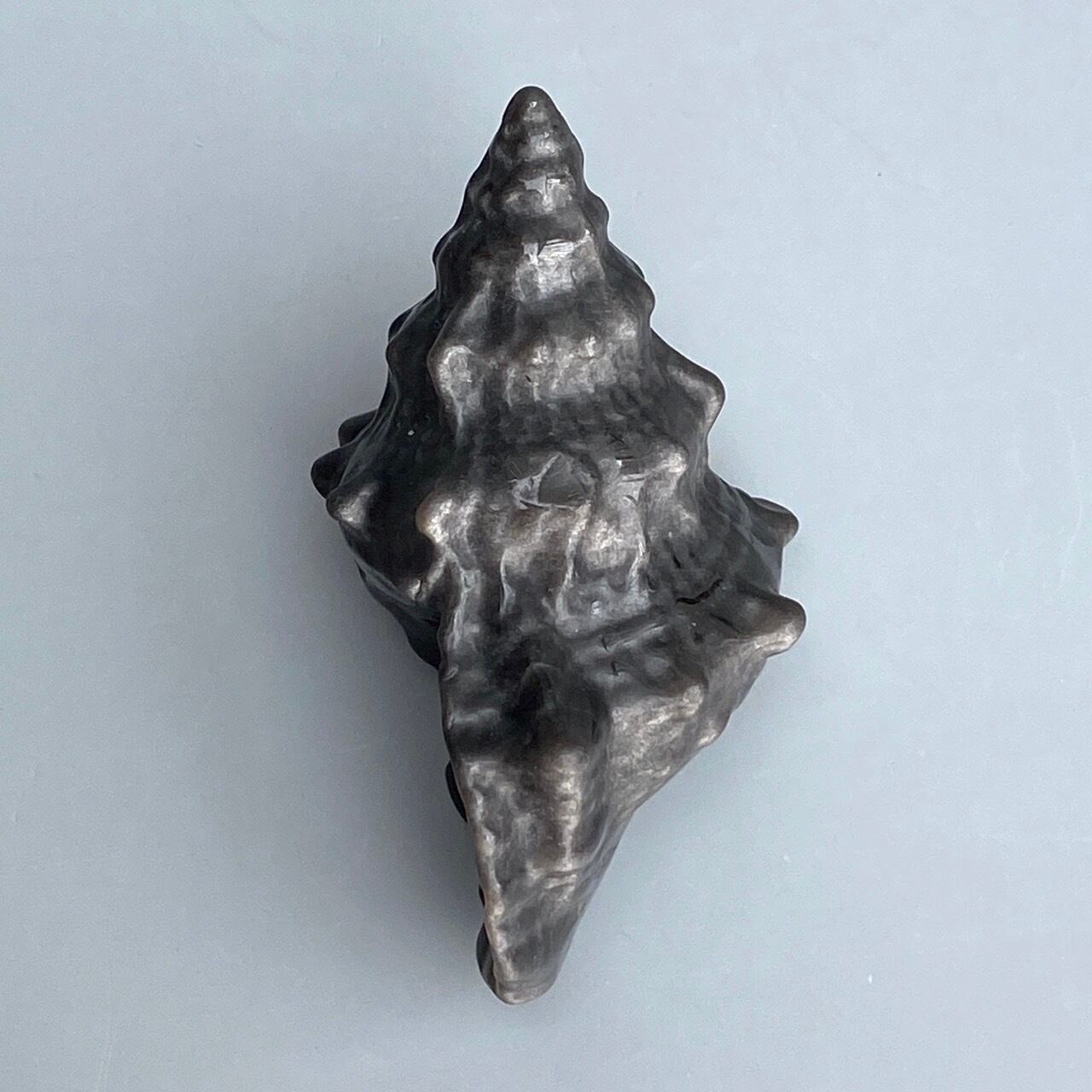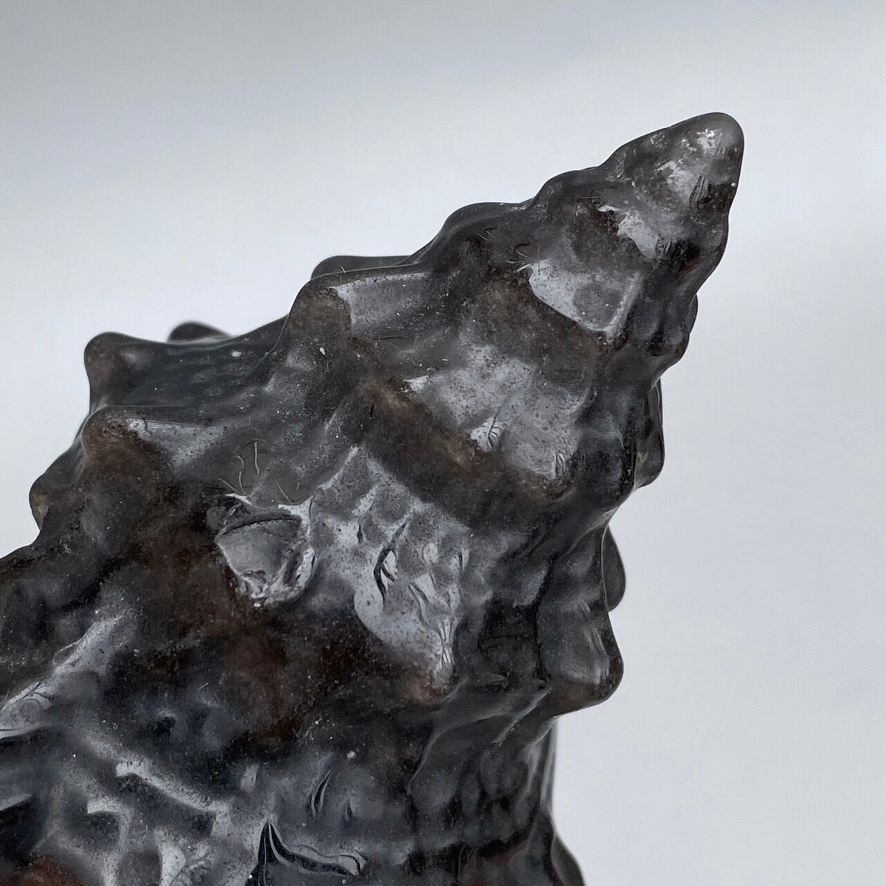 角度により、シルバーのシラーが見られるブラックオブシディアンの貝の置物になります。