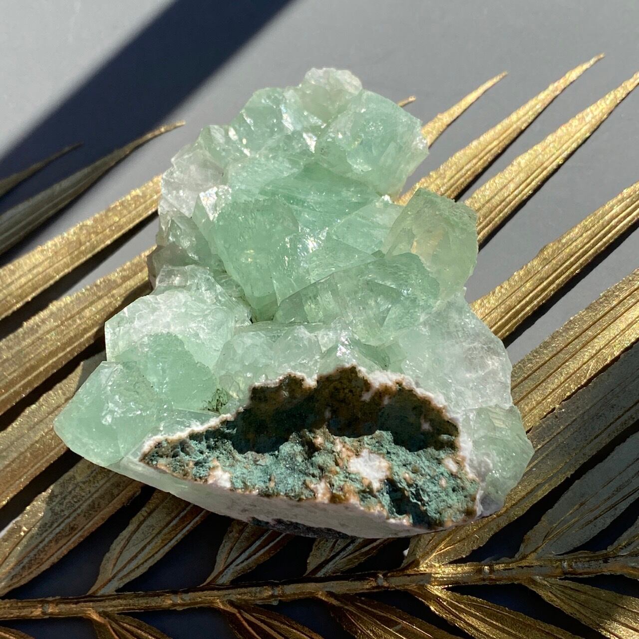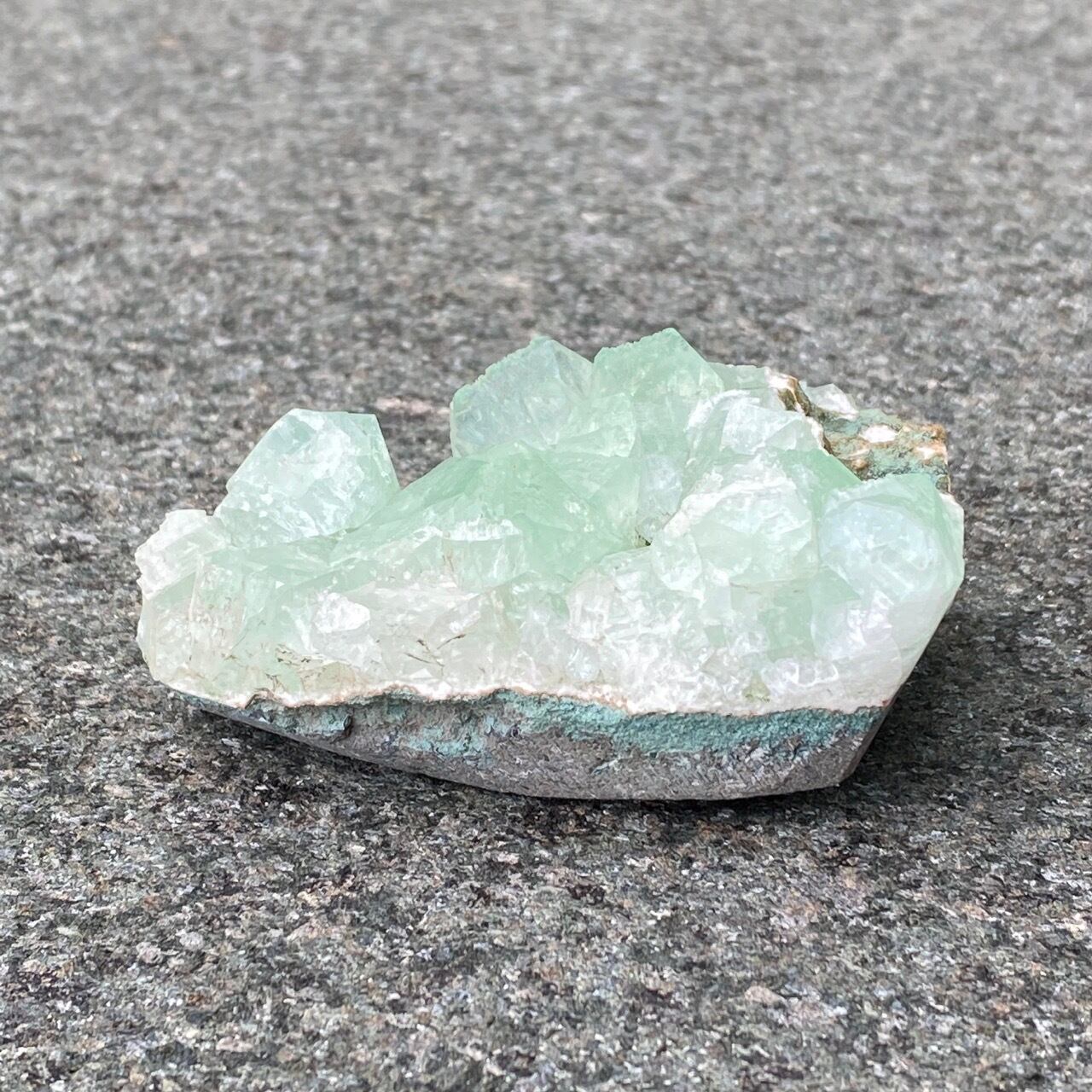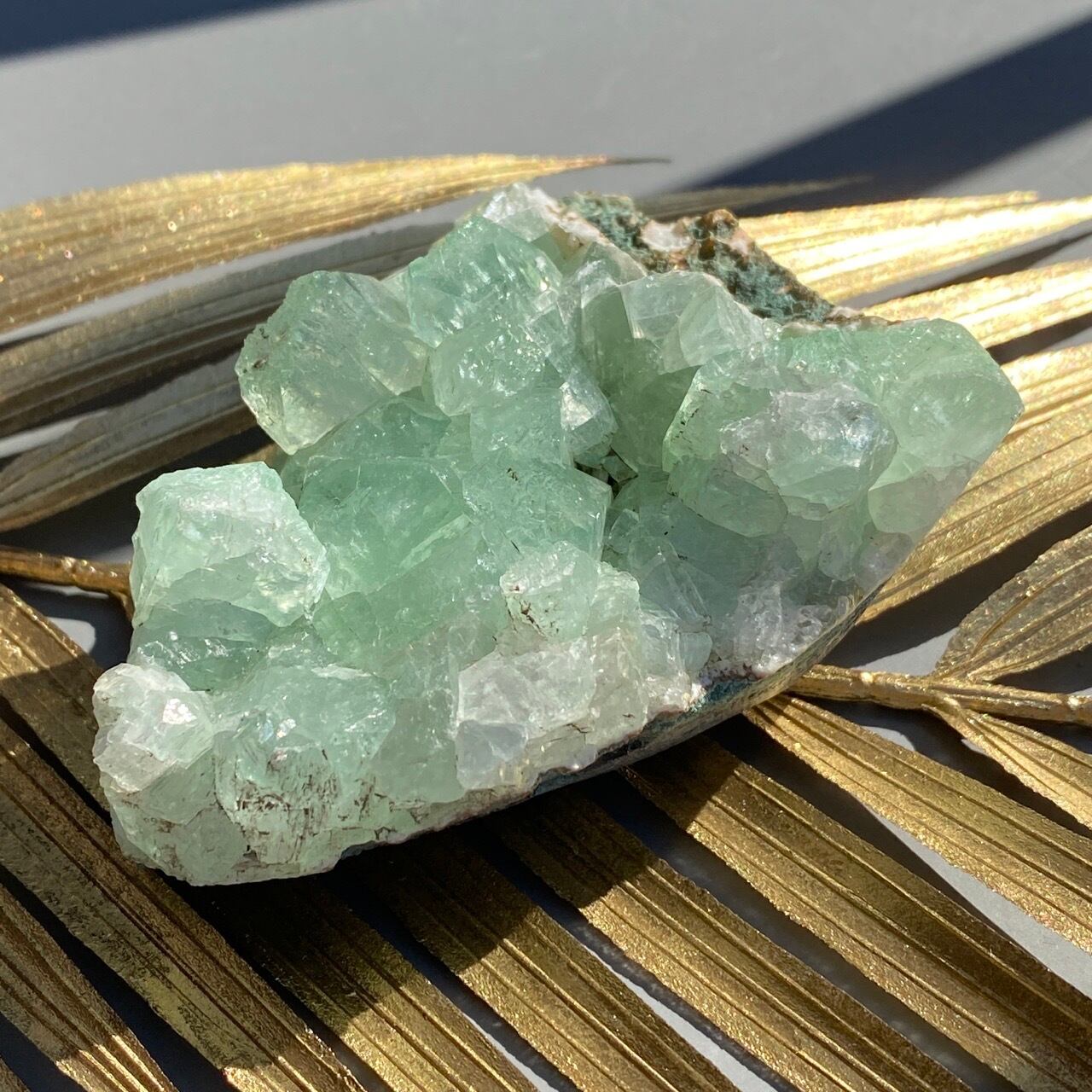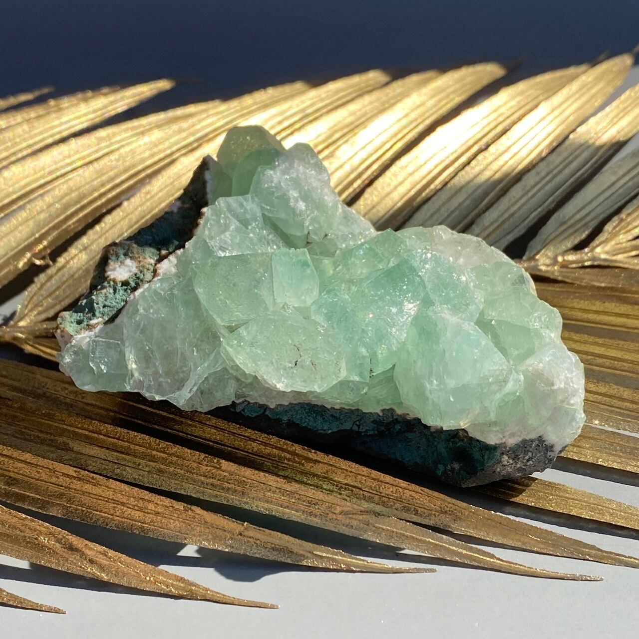 アポフィライトは大好きな石のひとつ。アポフィライトの独特な艶感はダイヤモンドや水晶とまた違って美しく、魅力的です。それも目に優しいグリーン。クラスターなので、色々な方向からファセットの表情や艶感を楽しめます。