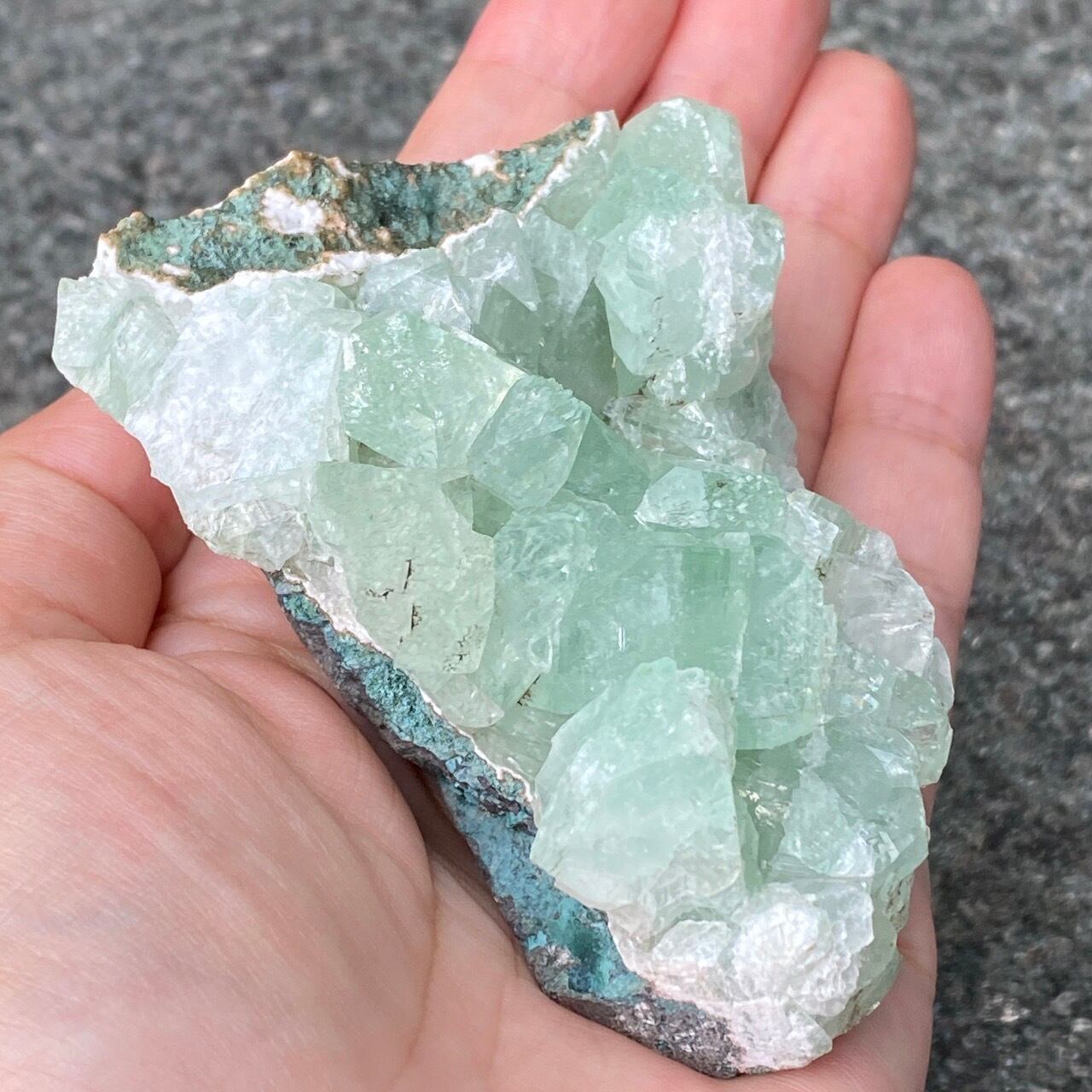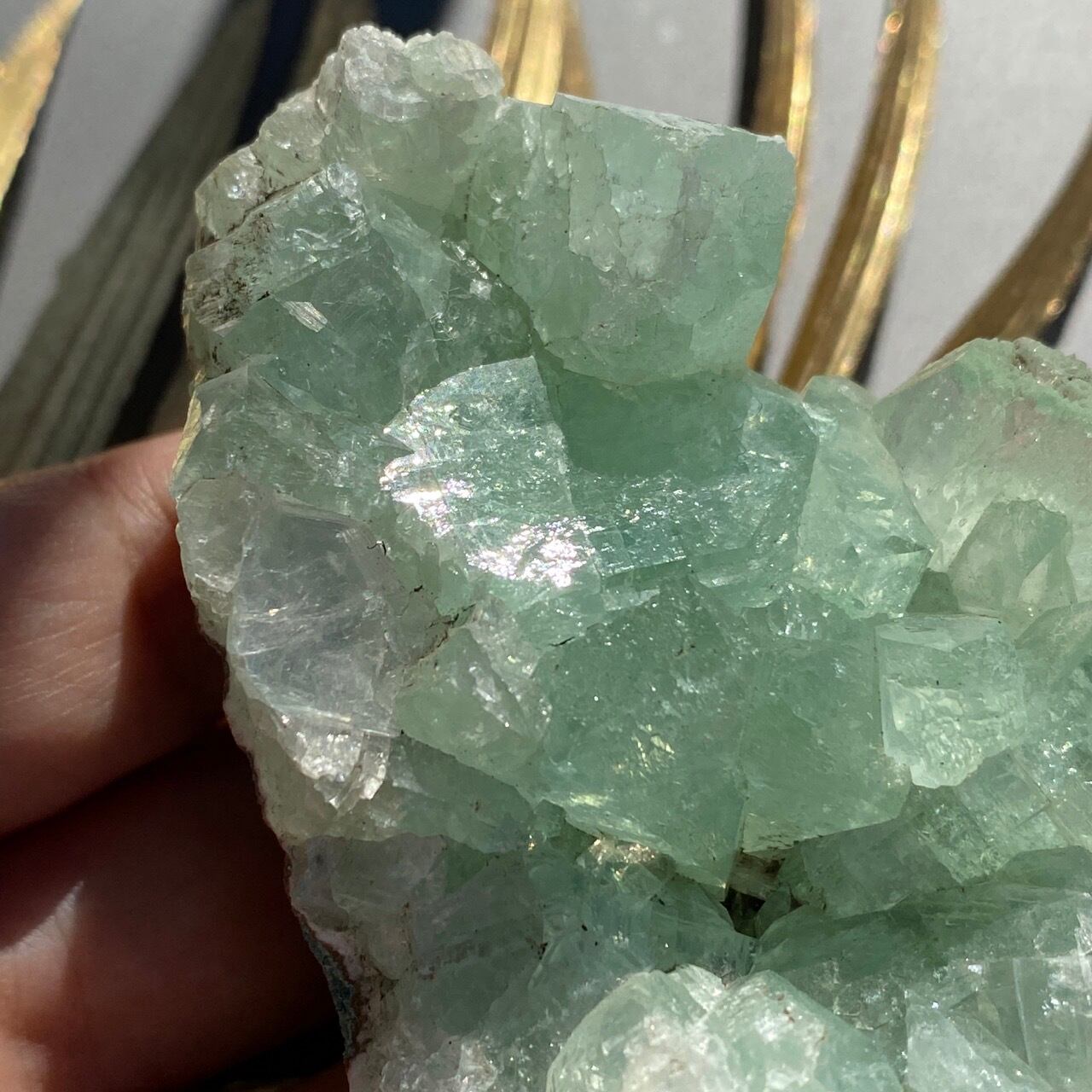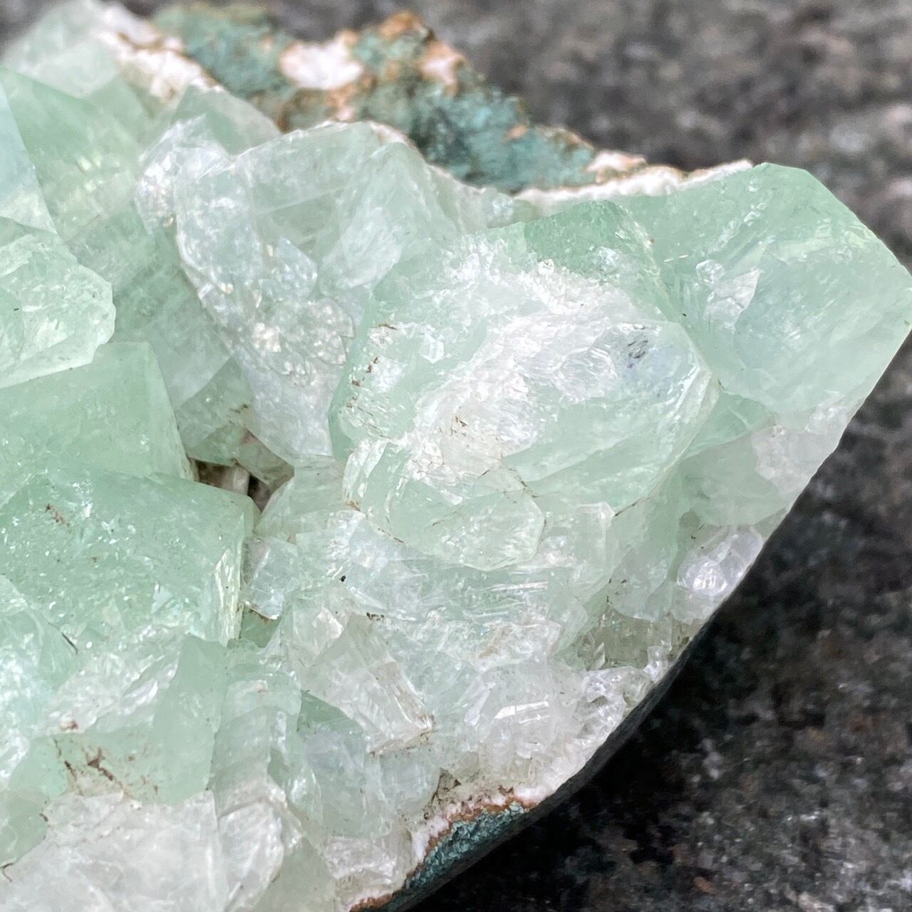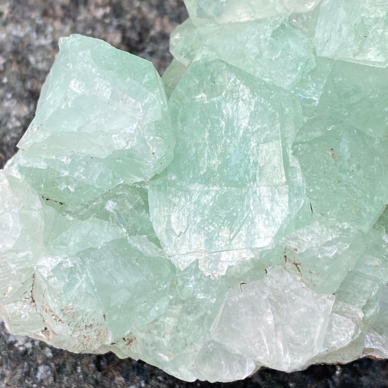 アポフィライトは大好きな石のひとつ。アポフィライトの独特な艶感はダイヤモンドや水晶とまた違って美しく、魅力的です。それも目に優しいグリーン。クラスターなので、色々な方向からファセットの表情や艶感を楽しめます。