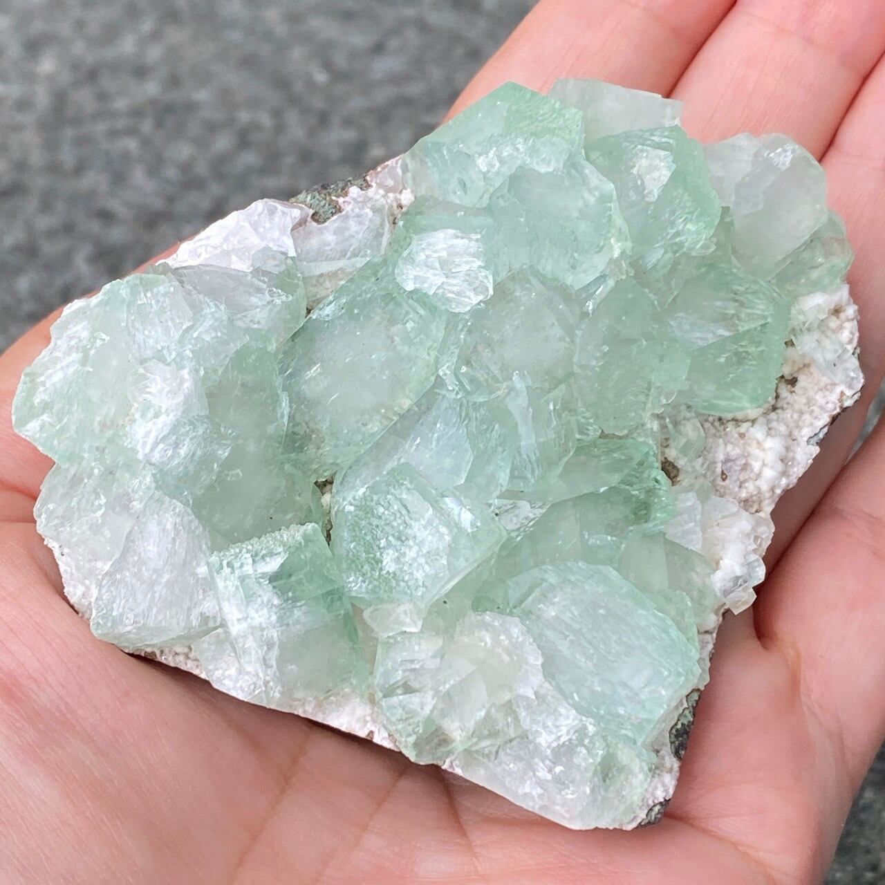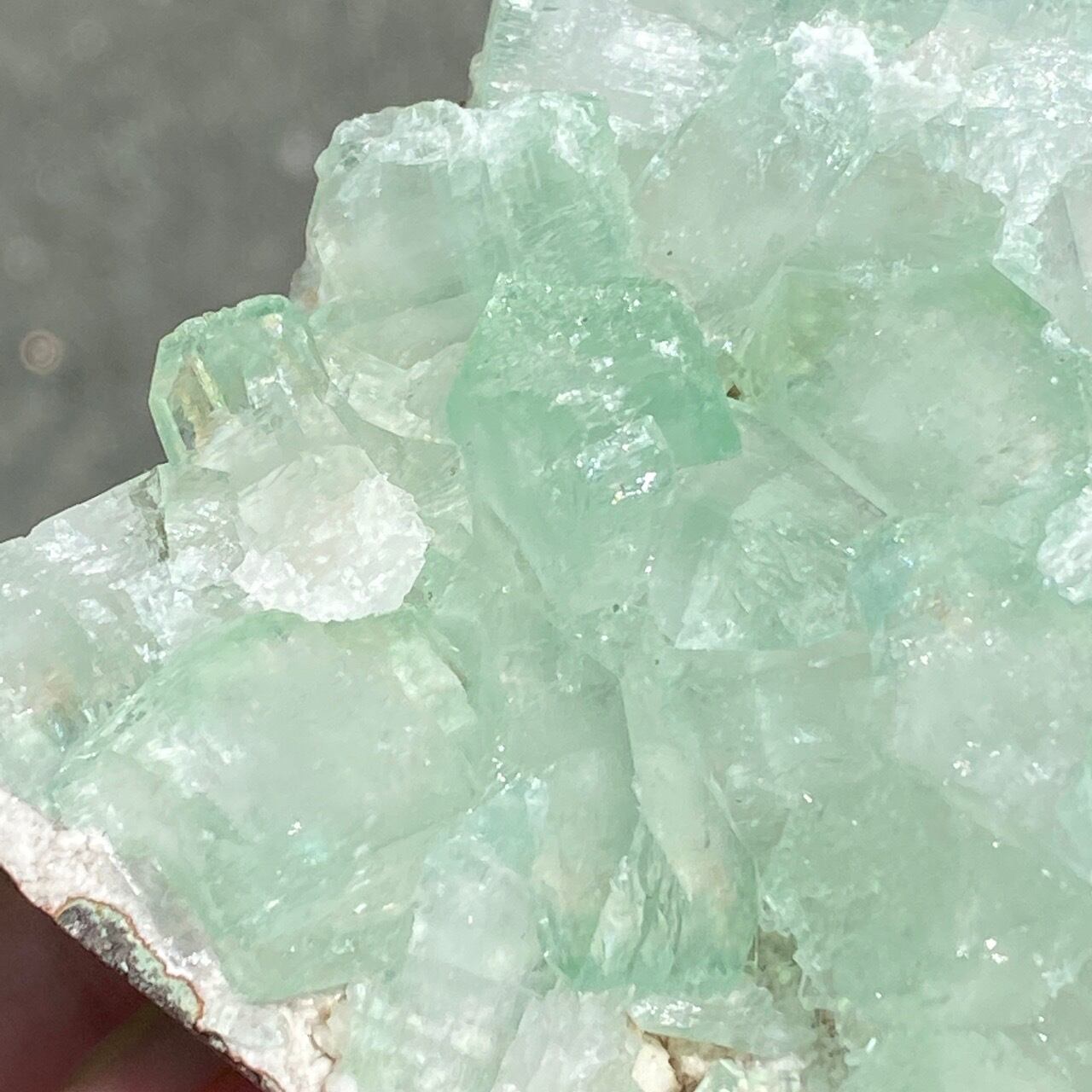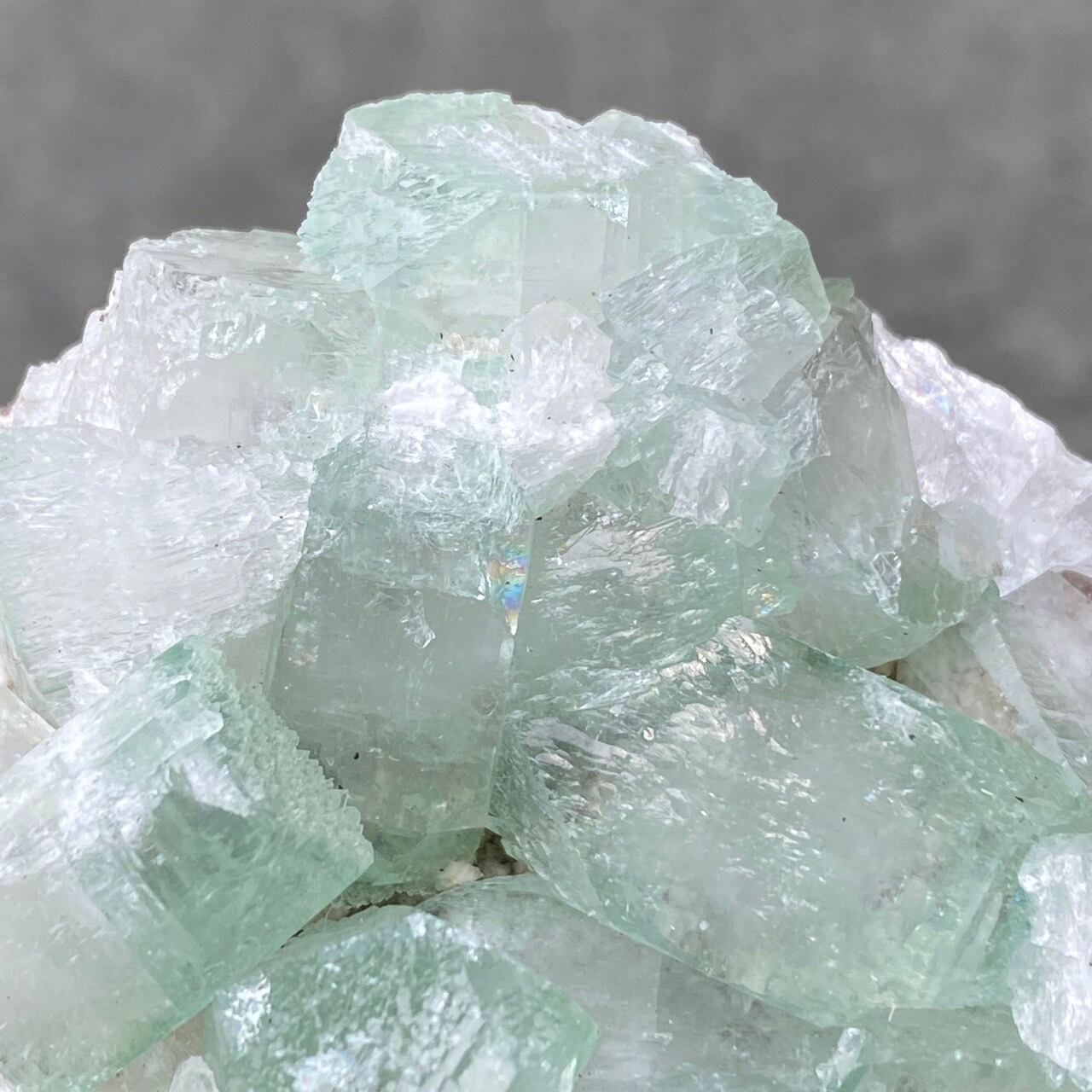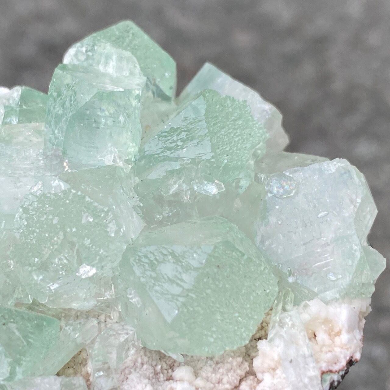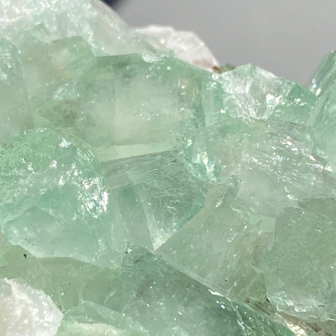 アポフィライトは大好きな石のひとつ。アポフィライトの独特な艶感はダイヤモンドや水晶とまた違って美しく、魅力的です。それも目に優しいグリーン。クラスターなので、色々な方向からファセットの表情や艶感を楽しめます。