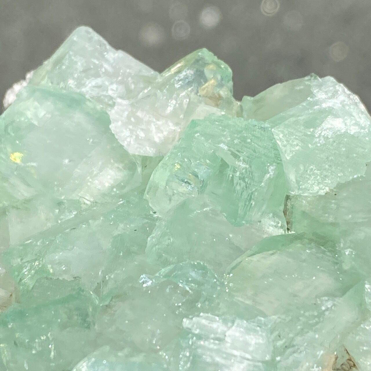 アポフィライトの中でも産出量が少ないため希少性が高い、インド産のグリーンアポフィライトのクラスターです。微量のバナジウムを多く含んでいるほどその緑色が濃くなります。