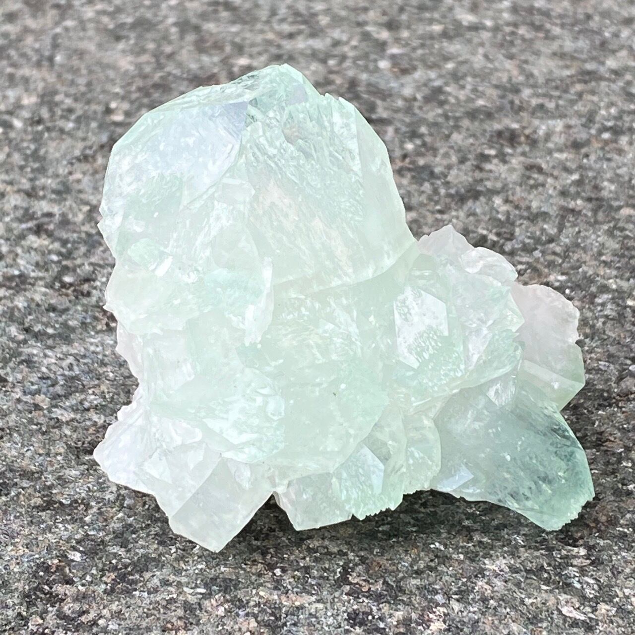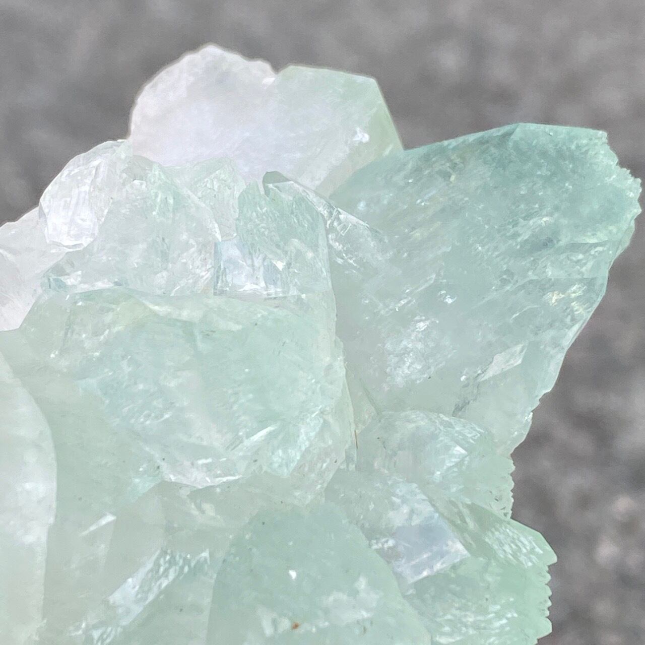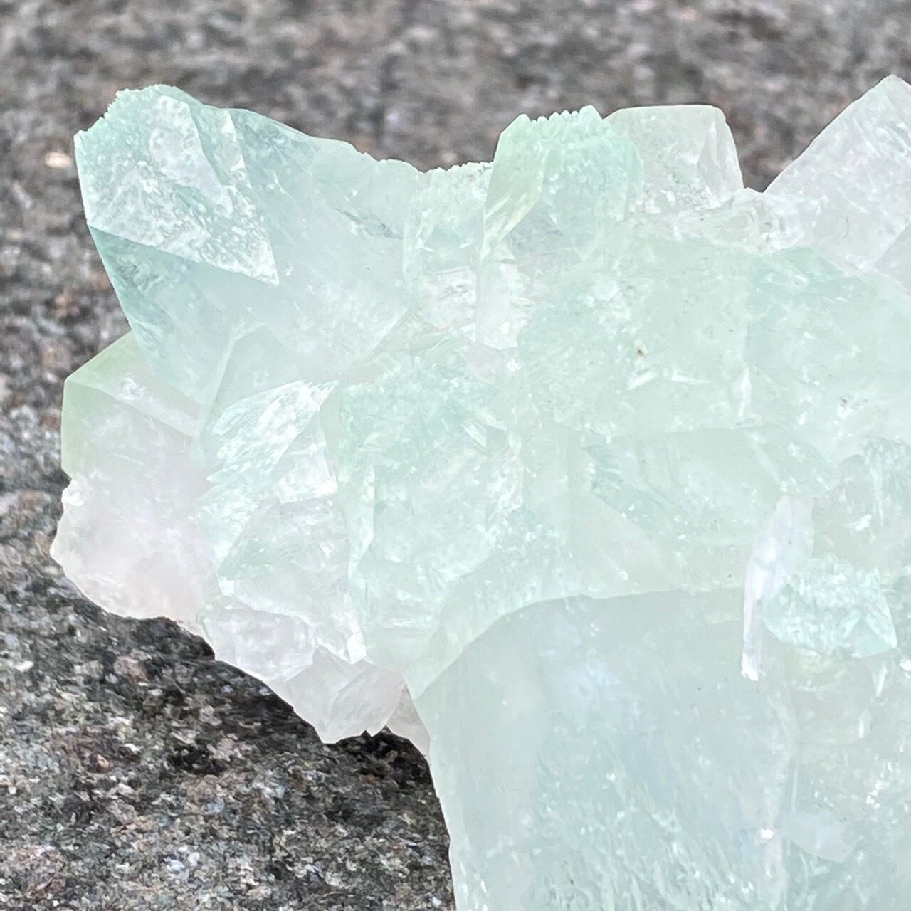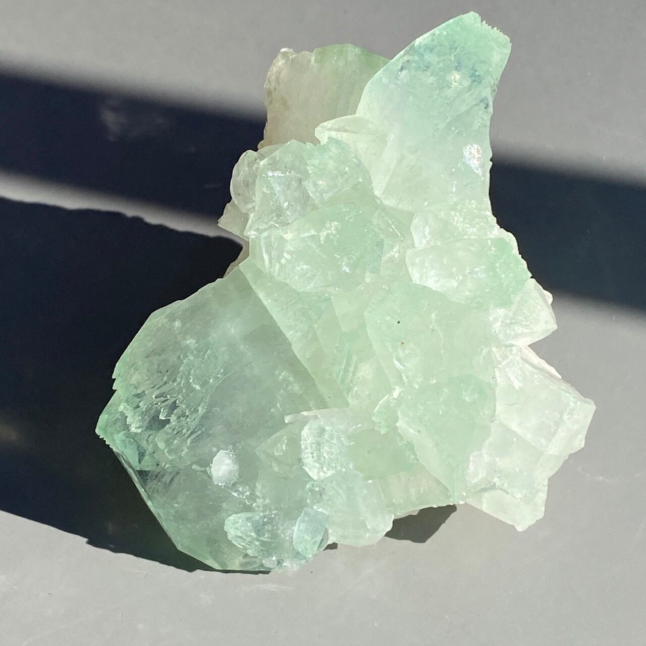 アポフィライトは大好きな石のひとつ。砂糖菓子のようなアポフィライトの独特な艶感はダイヤモンドや水晶とまた違って美しく、魅力的です。それも目に優しいグリーン。クラスターなので、色々な方向からファセットの表情や艶感を楽しめます。