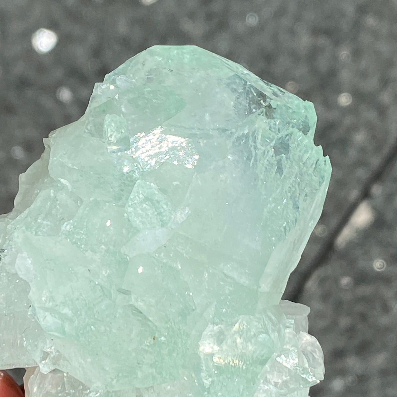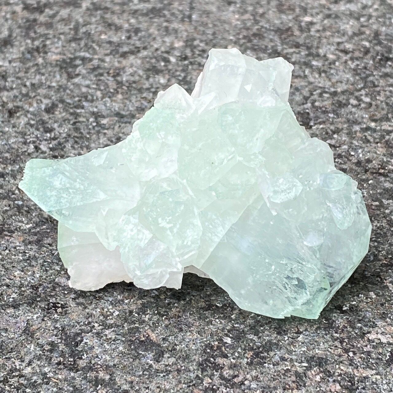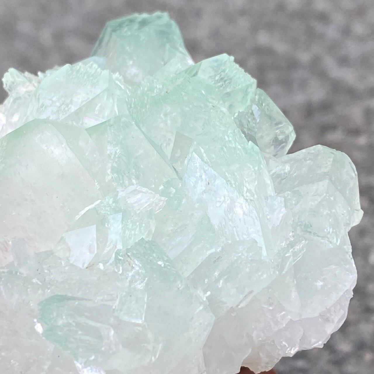 アポフィライトは大好きな石のひとつ。砂糖菓子のようなアポフィライトの独特な艶感はダイヤモンドや水晶とまた違って美しく、魅力的です。それも目に優しいグリーン。クラスターなので、色々な方向からファセットの表情や艶感を楽しめます。