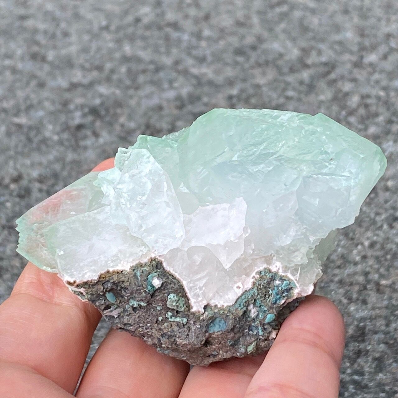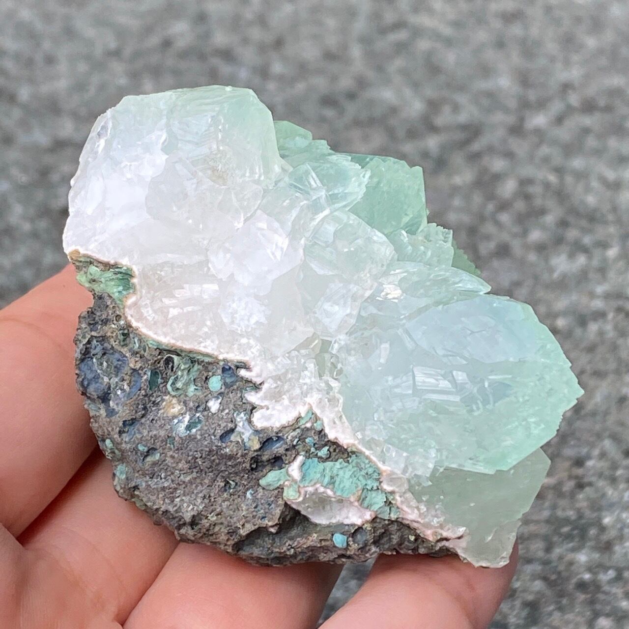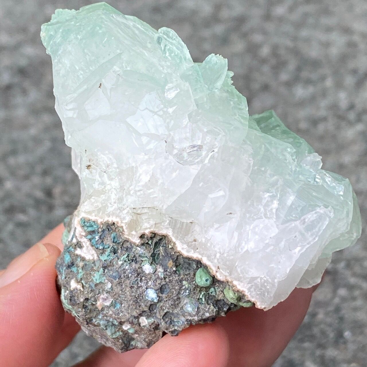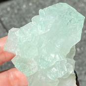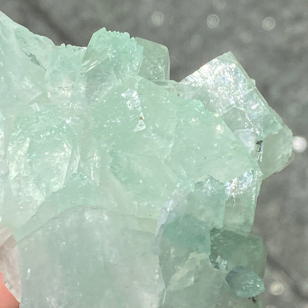 アポフィライトは大好きな石のひとつ。砂糖菓子のようなアポフィライトの独特な艶感はダイヤモンドや水晶とまた違って美しく、魅力的です。それも目に優しいグリーン。クラスターなので、色々な方向からファセットの表情や艶感を楽しめます。