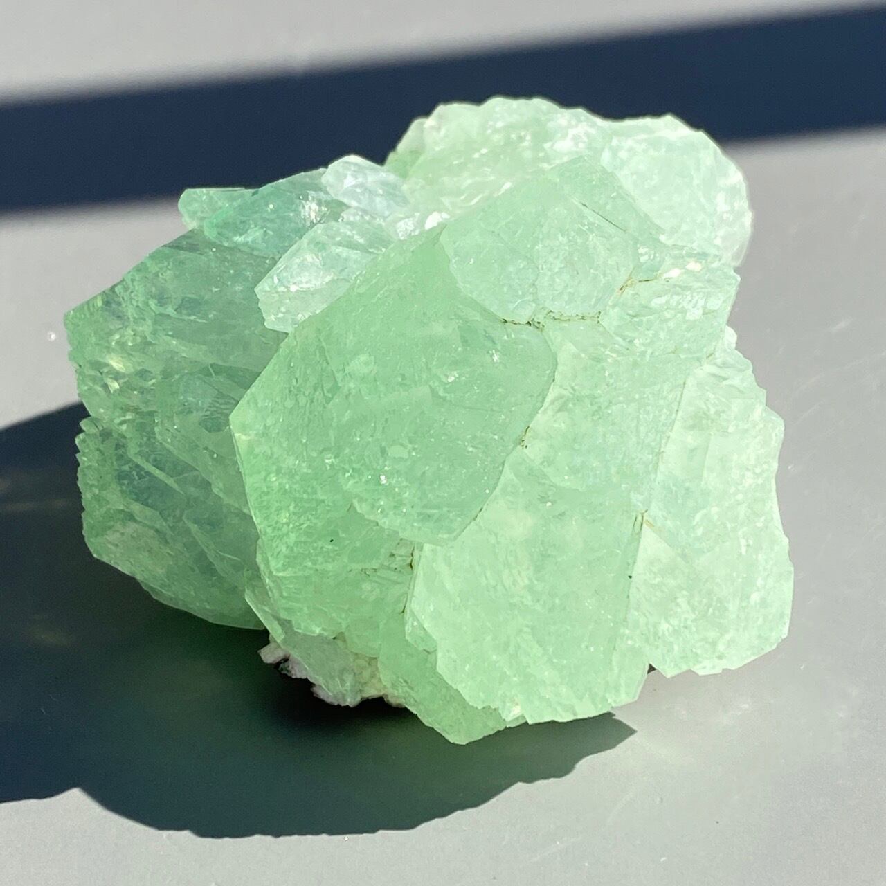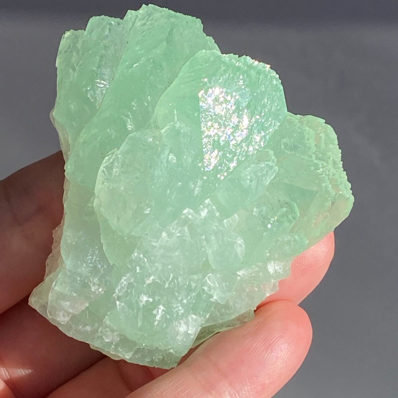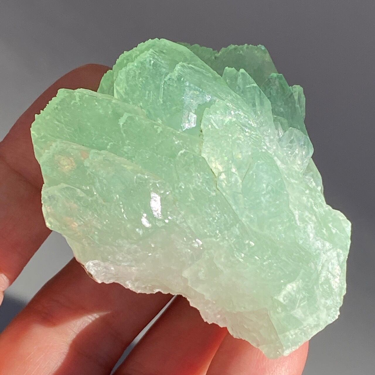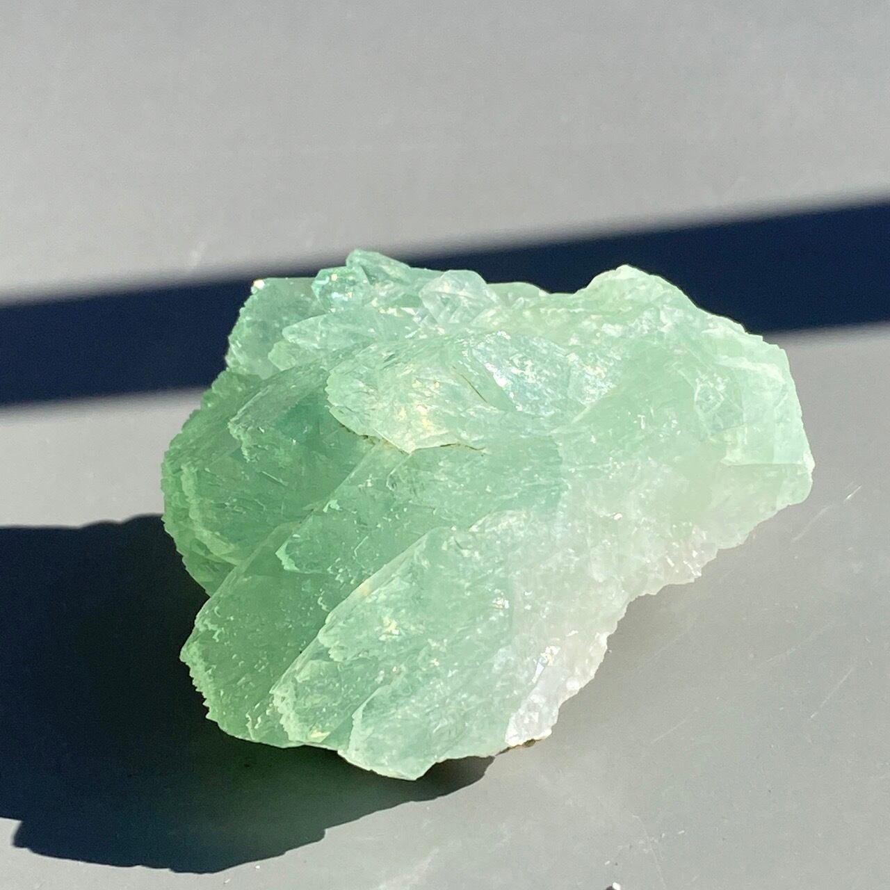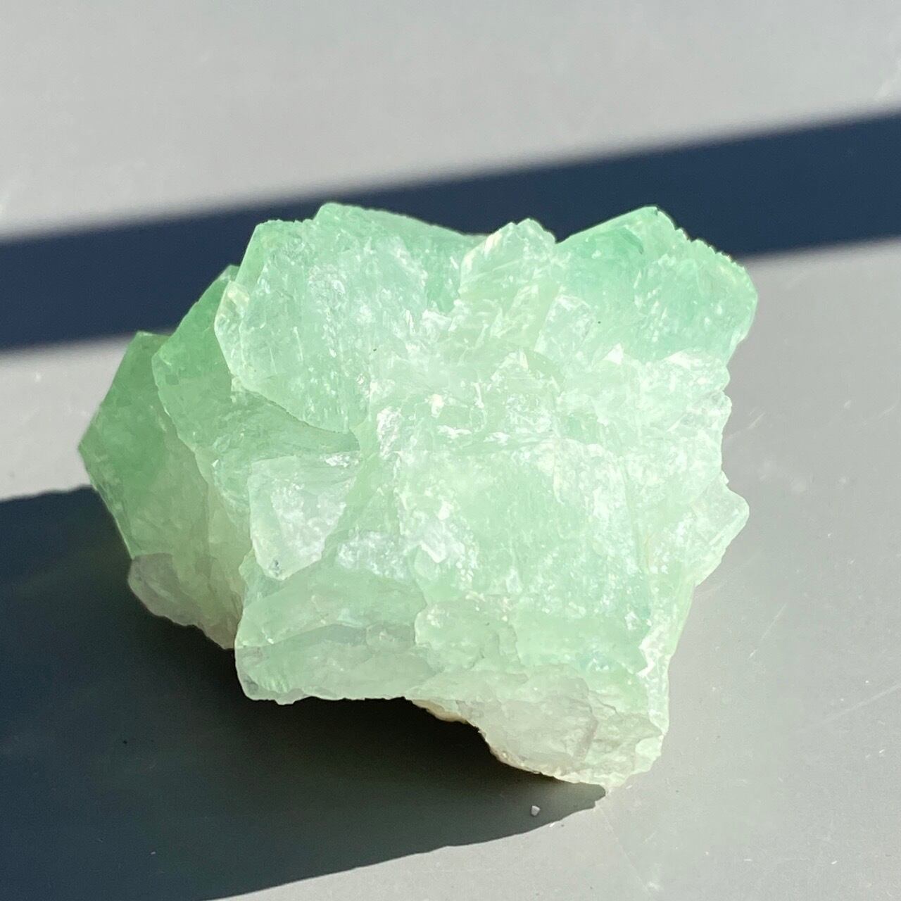 アポフィライトは大好きな石のひとつ。アポフィライトの独特でシルキーな艶感はダイヤモンドや水晶とまた違って美しく、魅力的です。それも目に優しいグリーン。特にこの子は同時にお迎えしたグリーンアポフィライトの中で色味が最も濃いです。