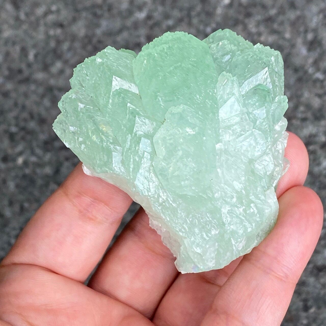 アポフィライトの中でも産出量が少ないため希少性が高い、インド産のグリーンアポフィライトのクラスターです。微量のバナジウムを多く含んでいるほどその緑色が濃くなります。