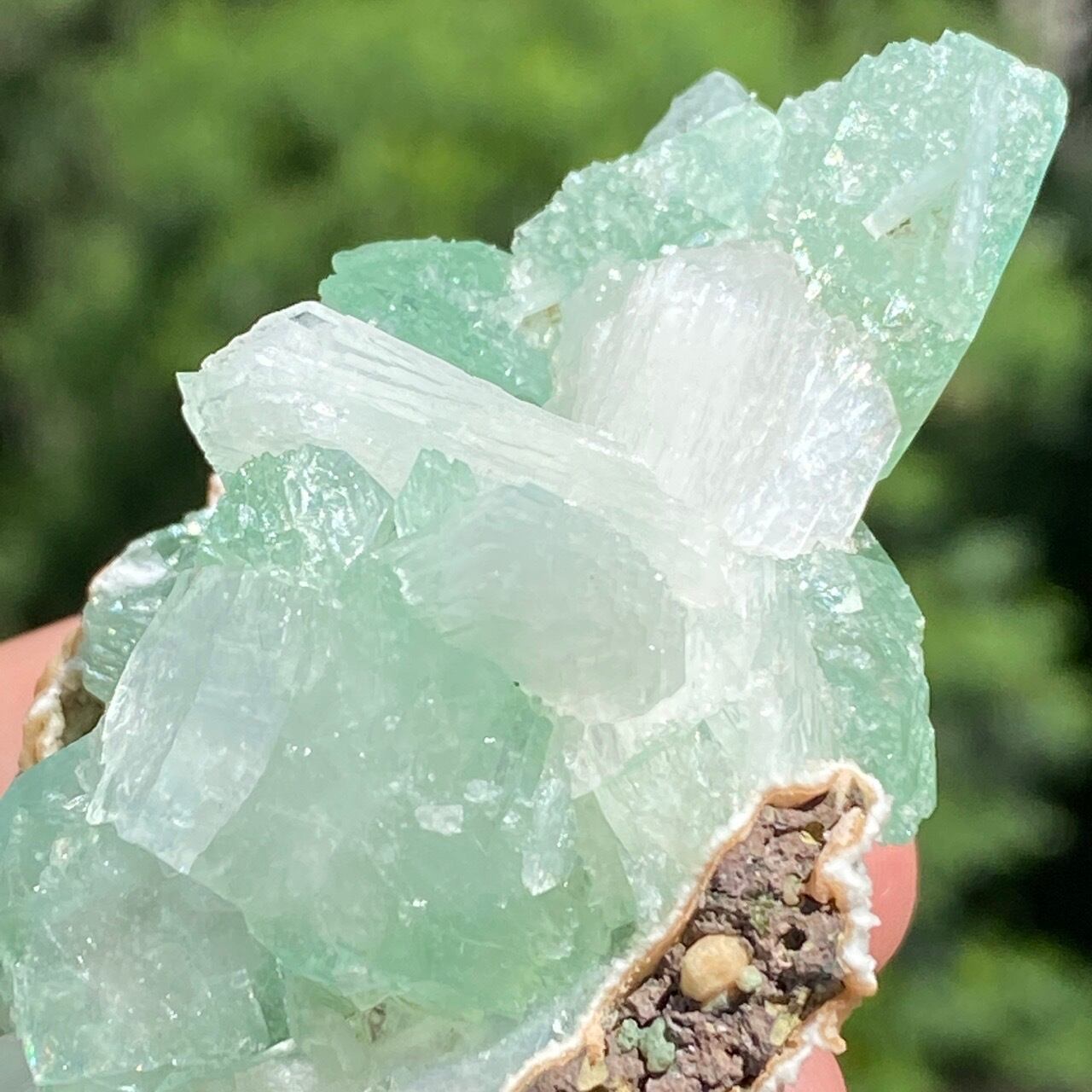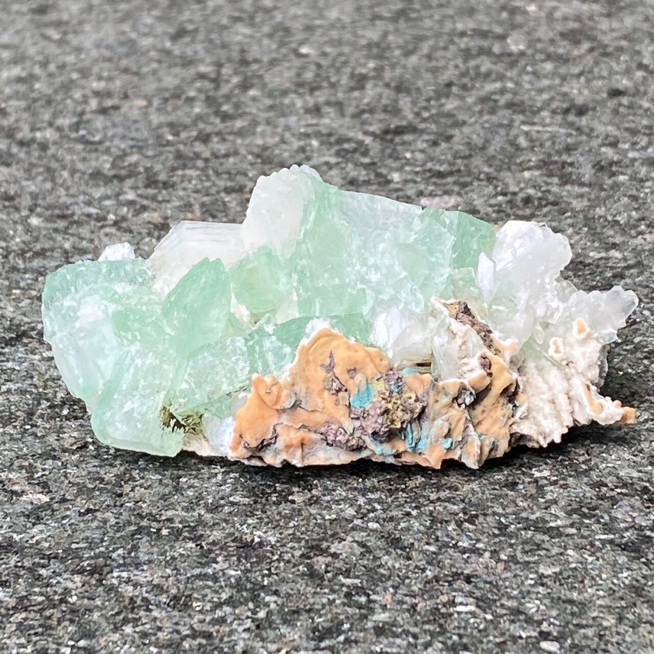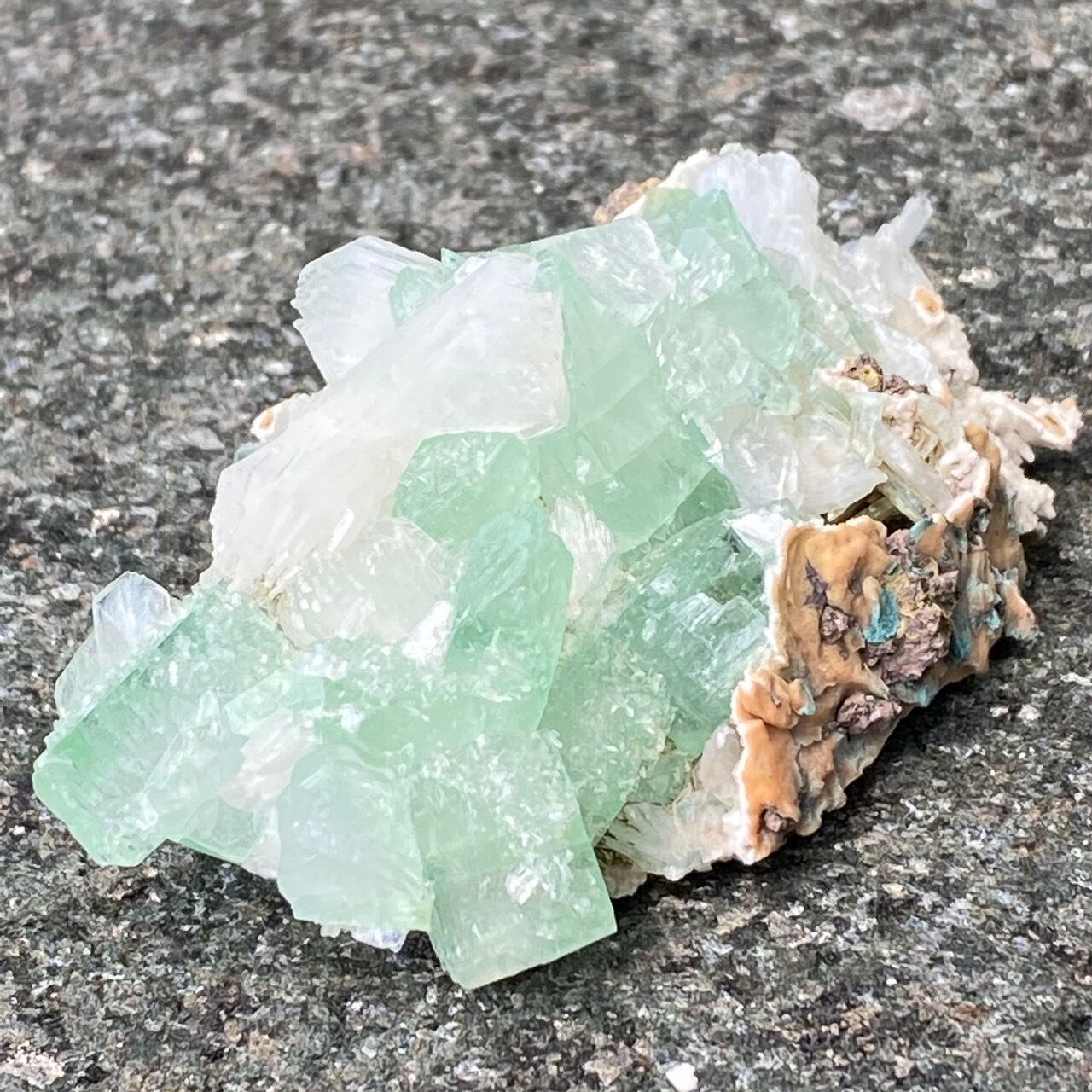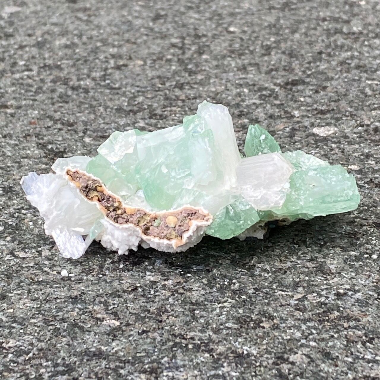 サプライヤーからお迎えする時に、白い結晶部分の石に関して聞いた内容を失念してしまったのですが、形状と質感からスティルバイトだと思われます。この白とグリーンのコンビネーションが素敵です。