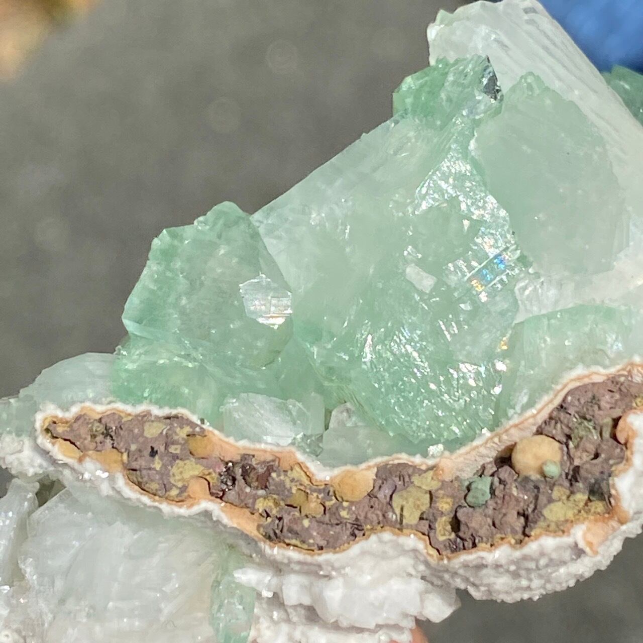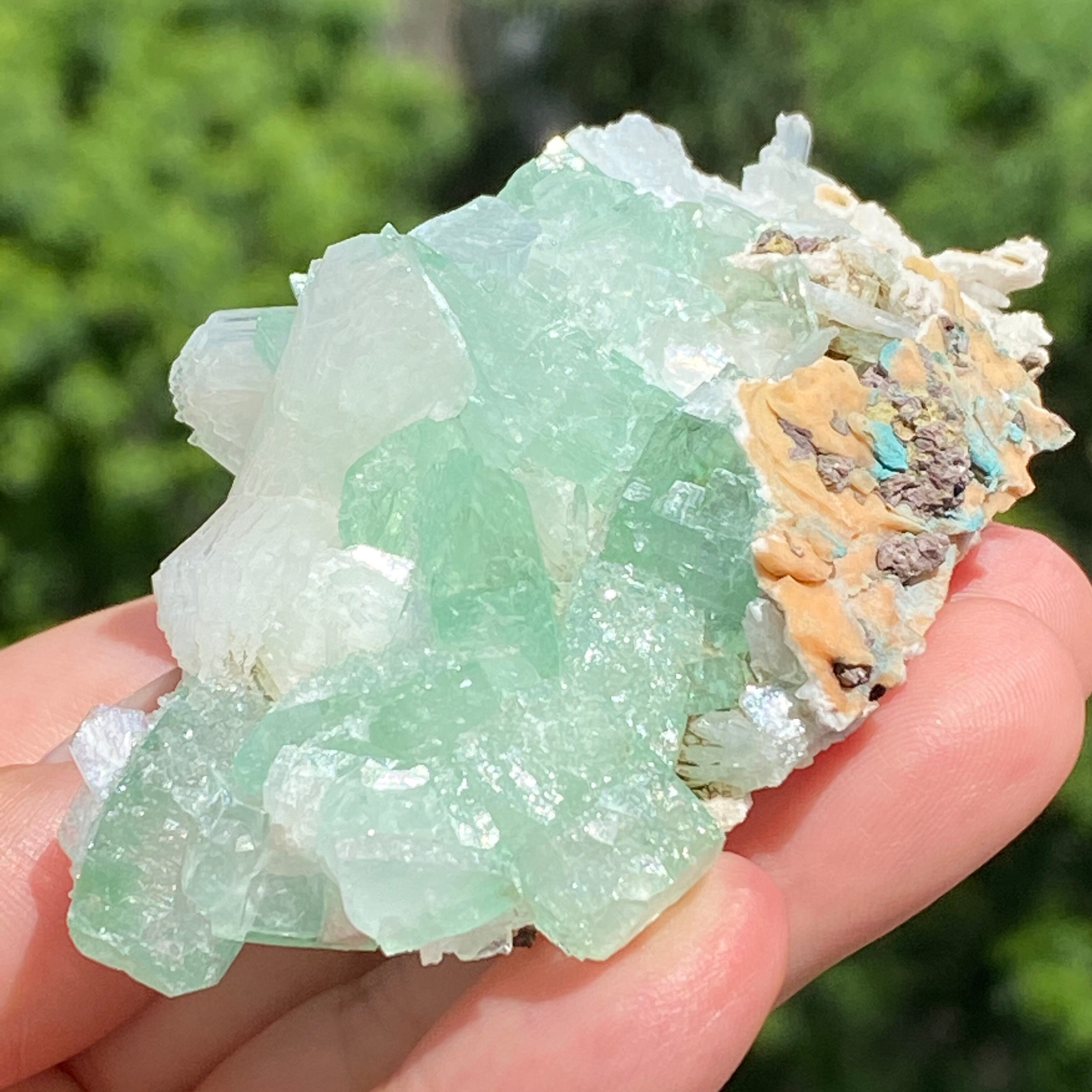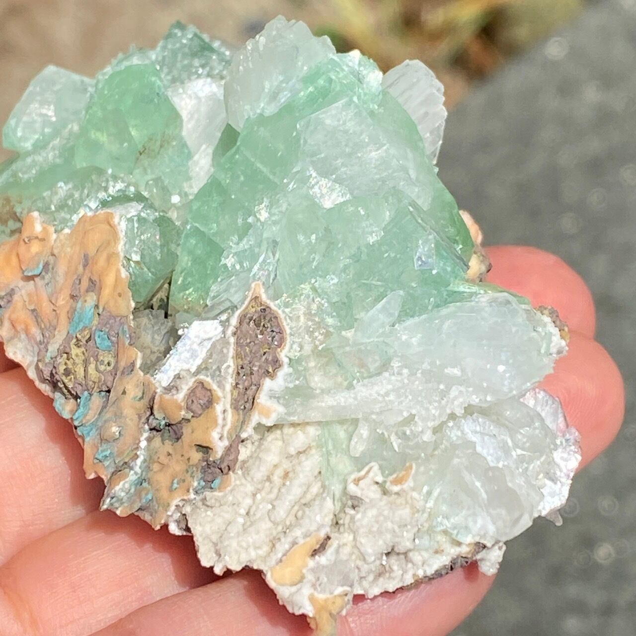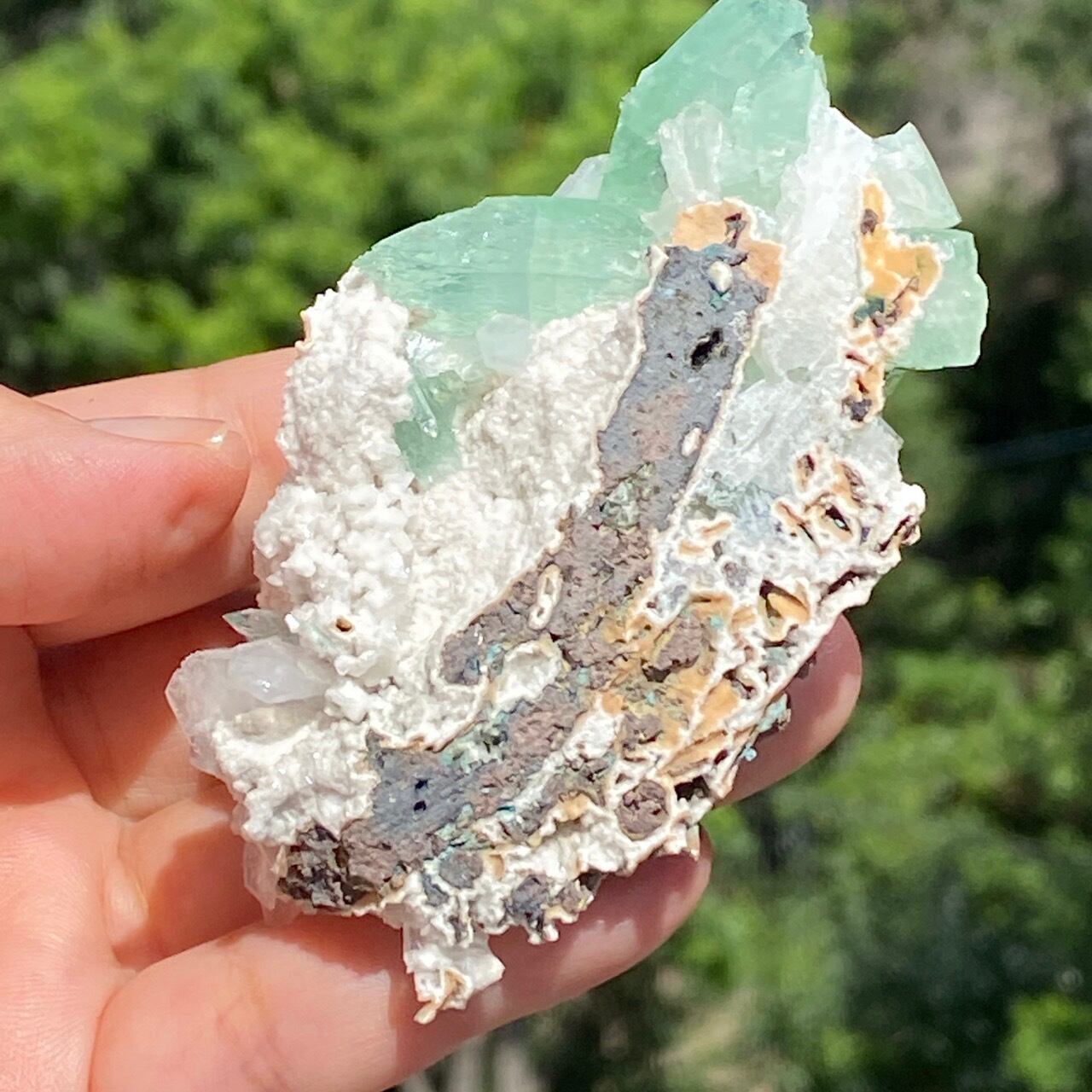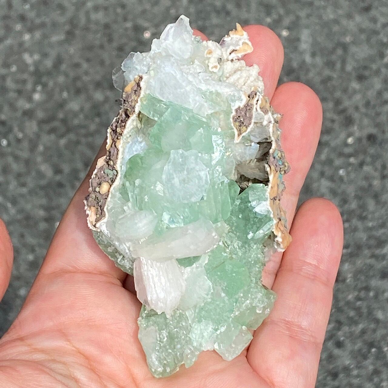 サプライヤーからお迎えする時に、白い結晶部分の石に関して聞いた内容を失念してしまったのですが、形状と質感からスティルバイトだと思われます。この白とグリーンのコンビネーションが素敵です。