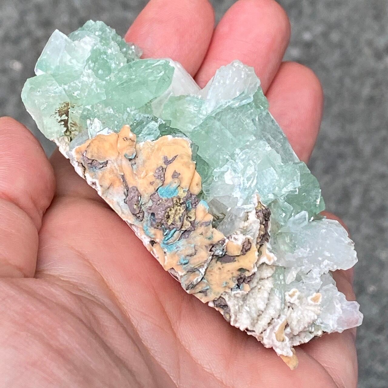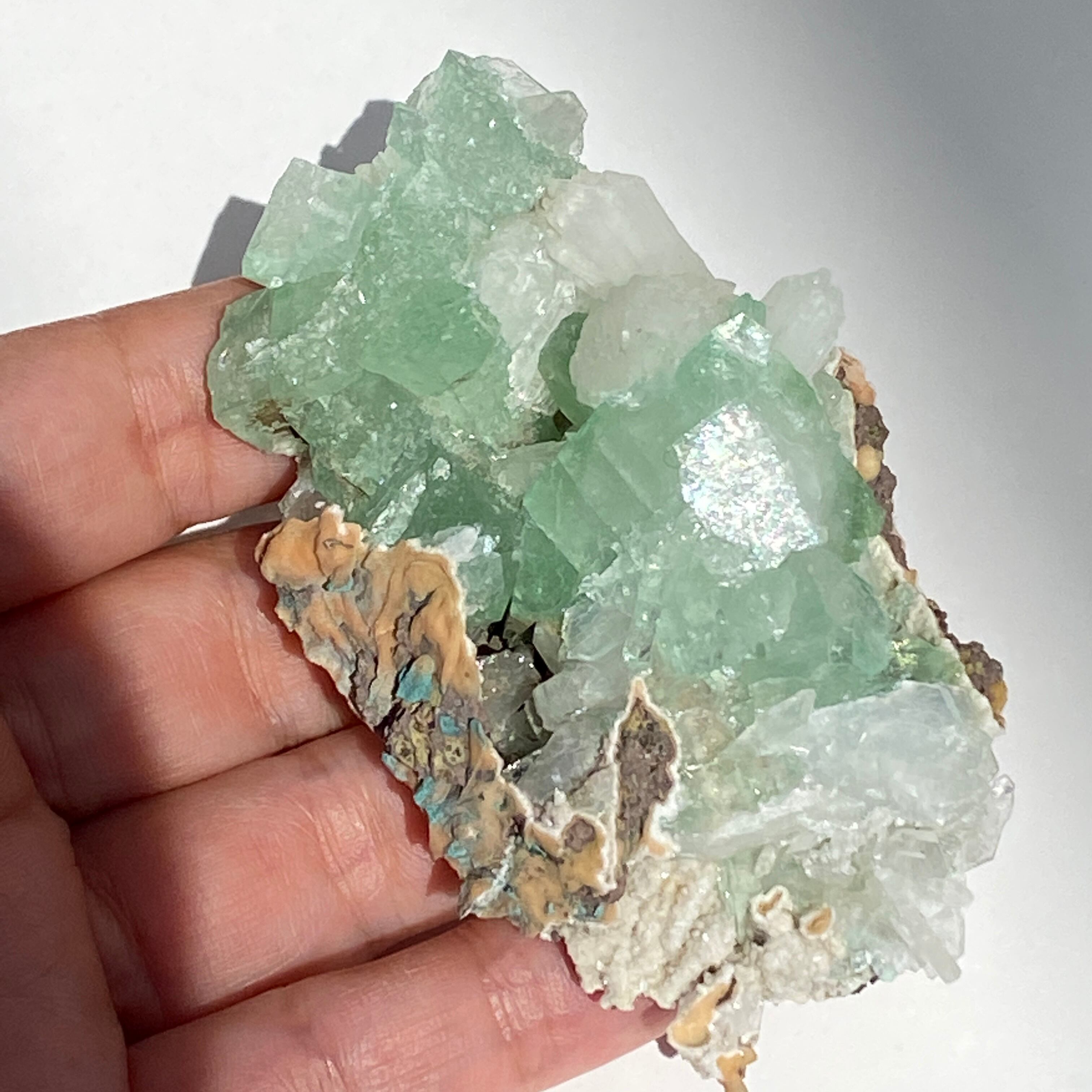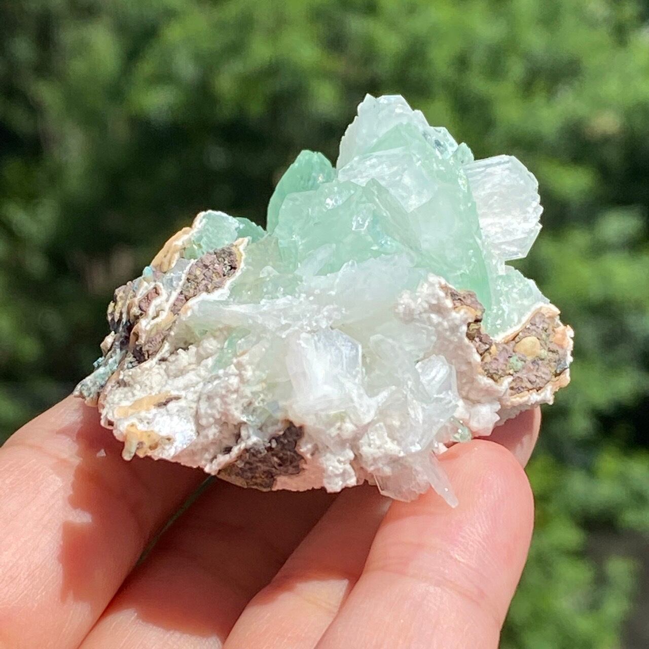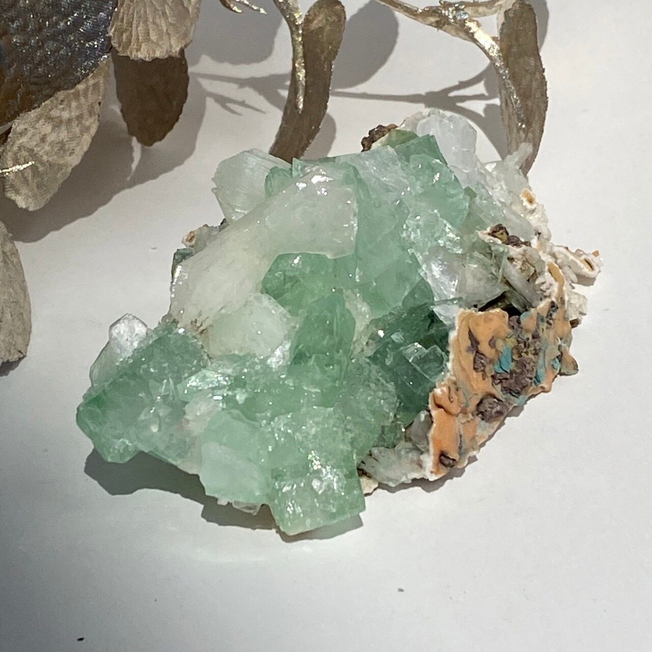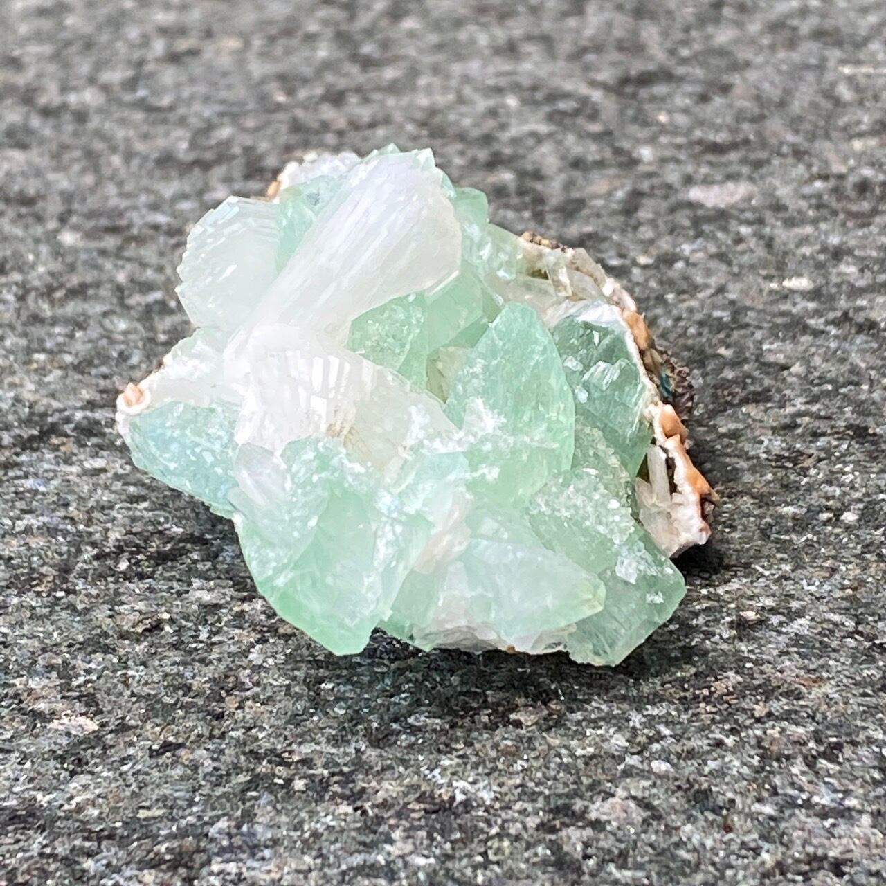 アポフィライトは大好きな石のひとつ。アポフィライトの独特でシルキーな艶感はダイヤモンドや水晶とまた違って美しく、魅力的です。それも目に優しいグリーン。クラスターなので、色々な方向からファセットの表情や艶感を楽しめます。