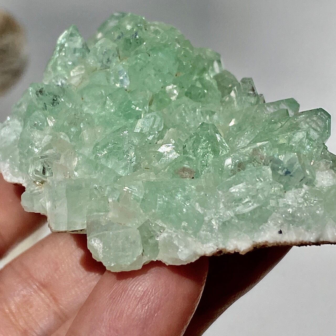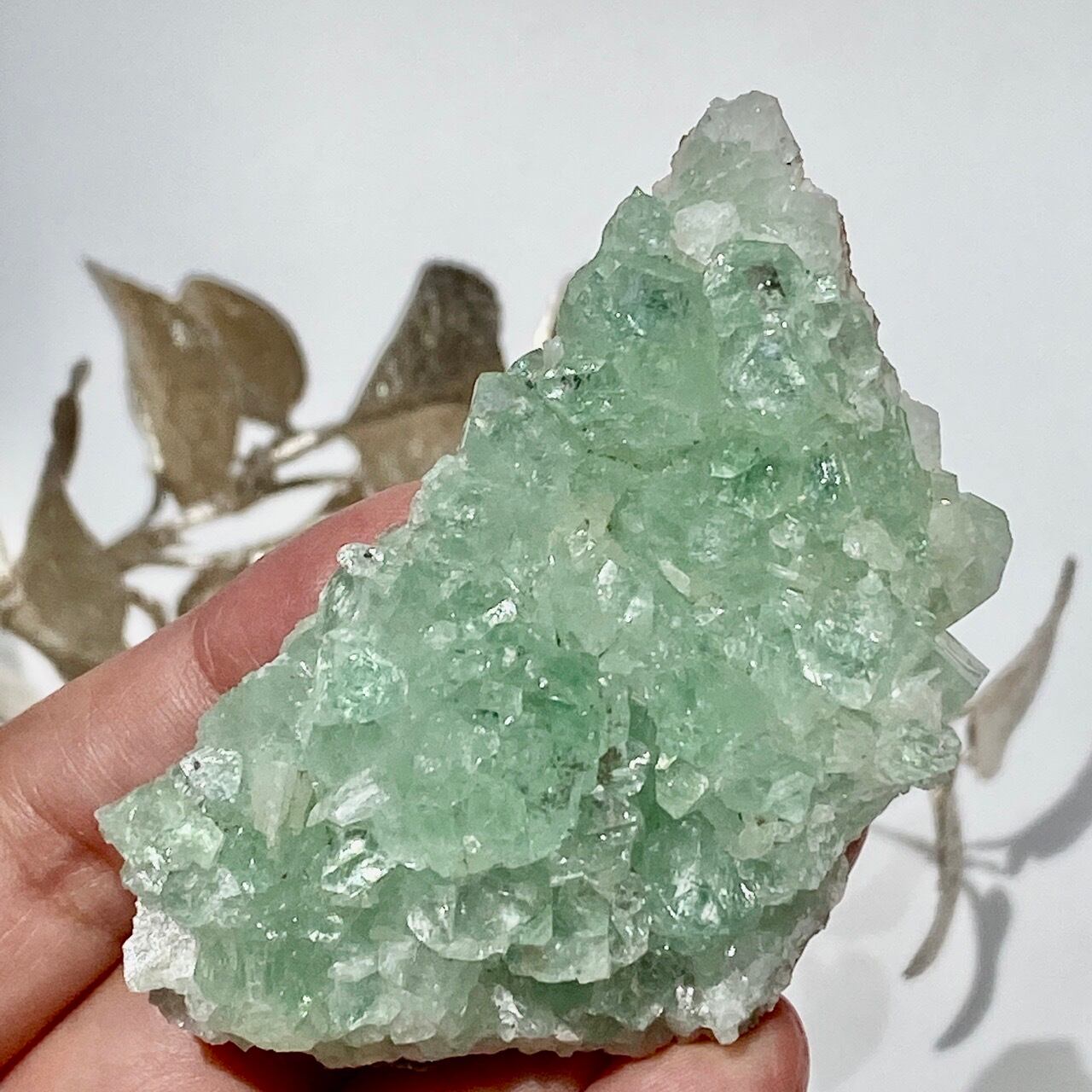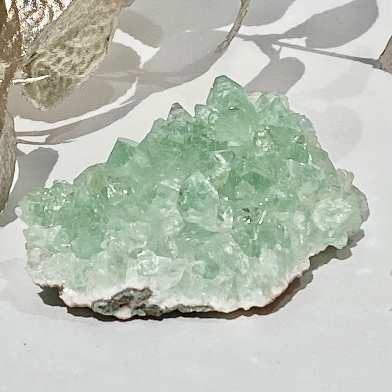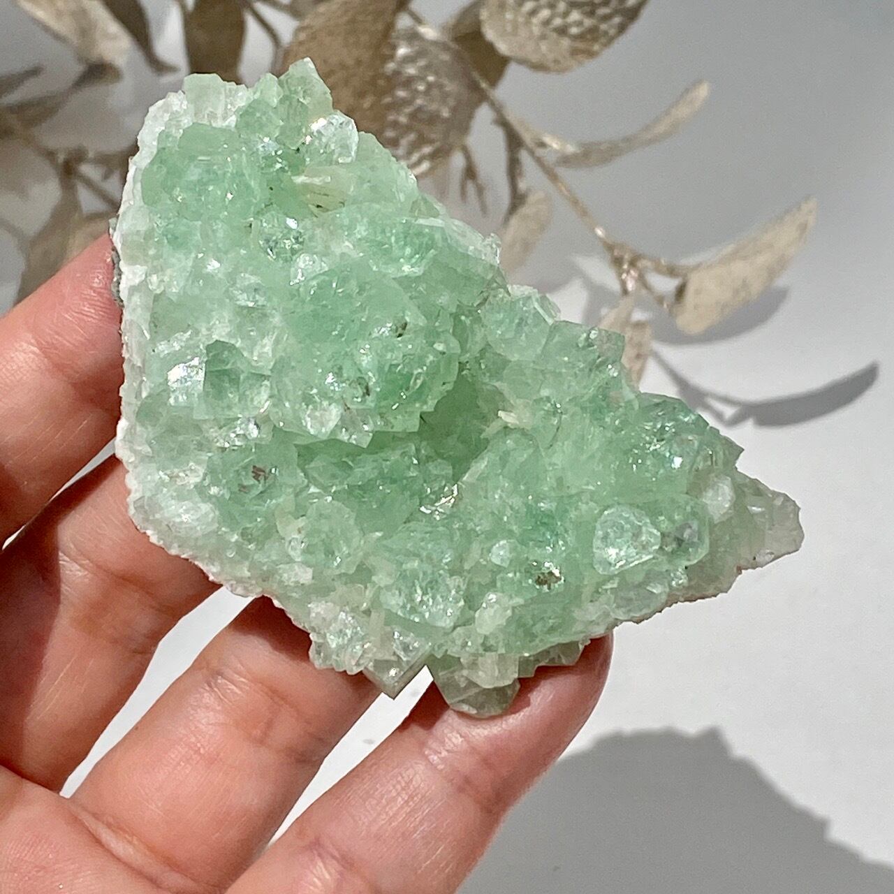 アポフィライトは大好きな石のひとつ。砂糖菓子のようなアポフィライトの独特でシルキーな艶感はダイヤモンドや水晶とまた違って美しく、魅力的です。それも目に優しいグリーンで透明感があります。クラスターなので、色々な方向からファセットの表情や艶感、そして透明感を楽しめます。