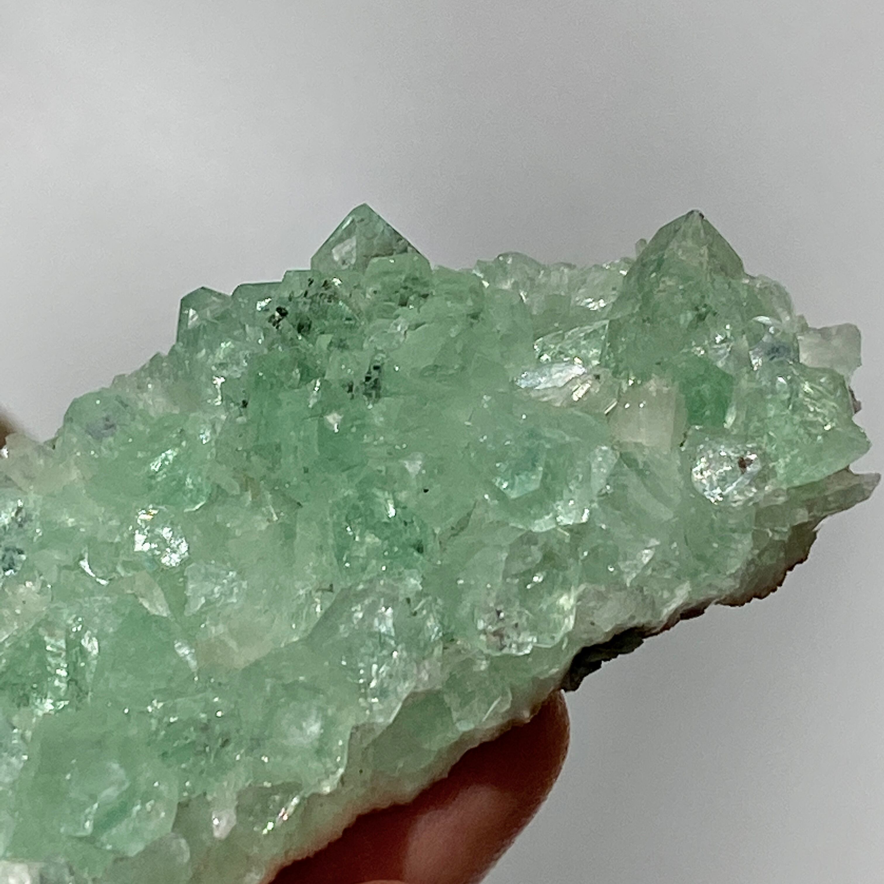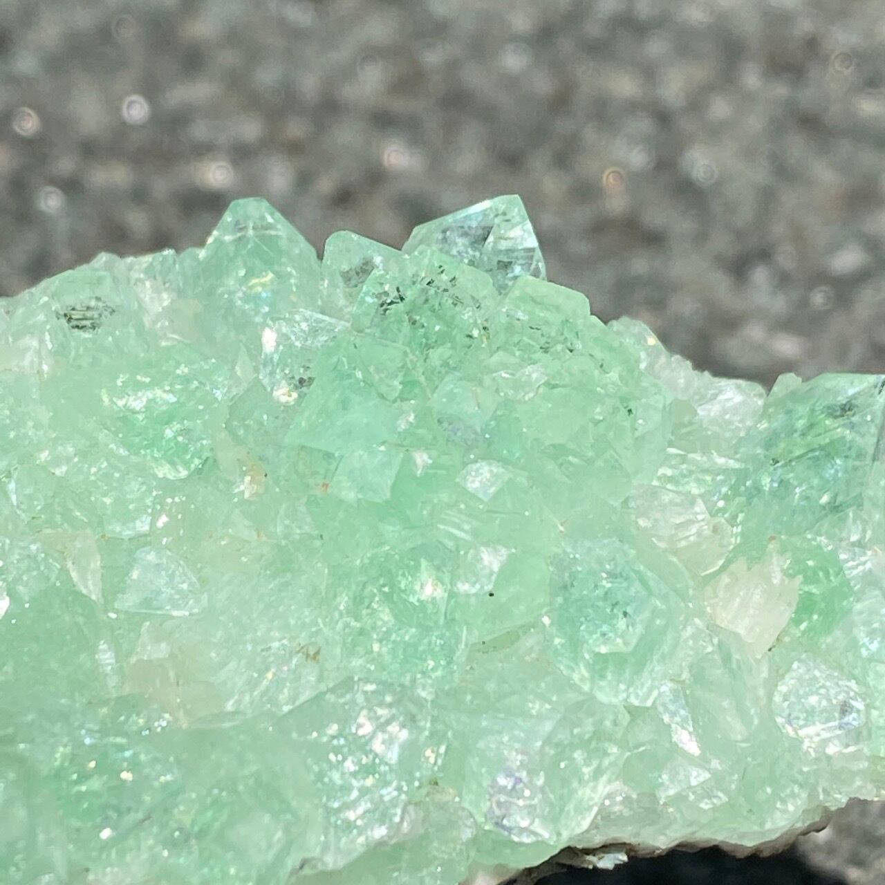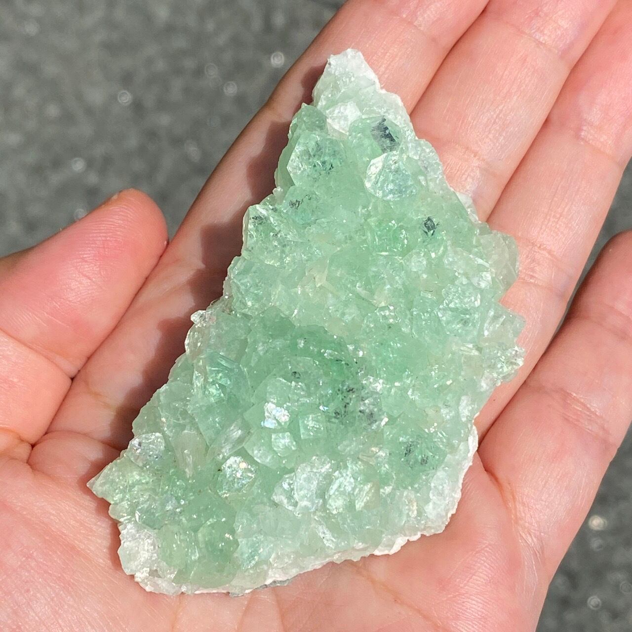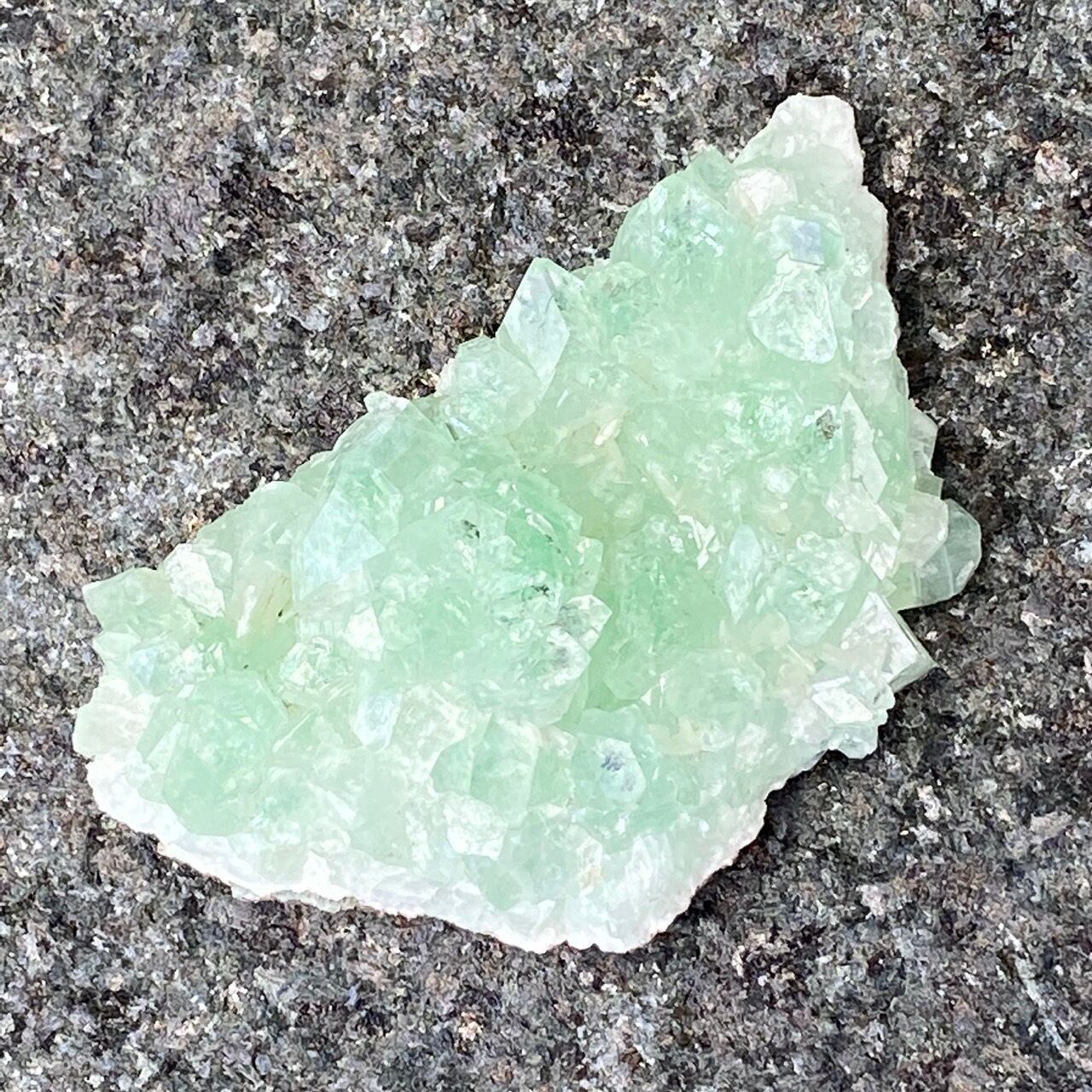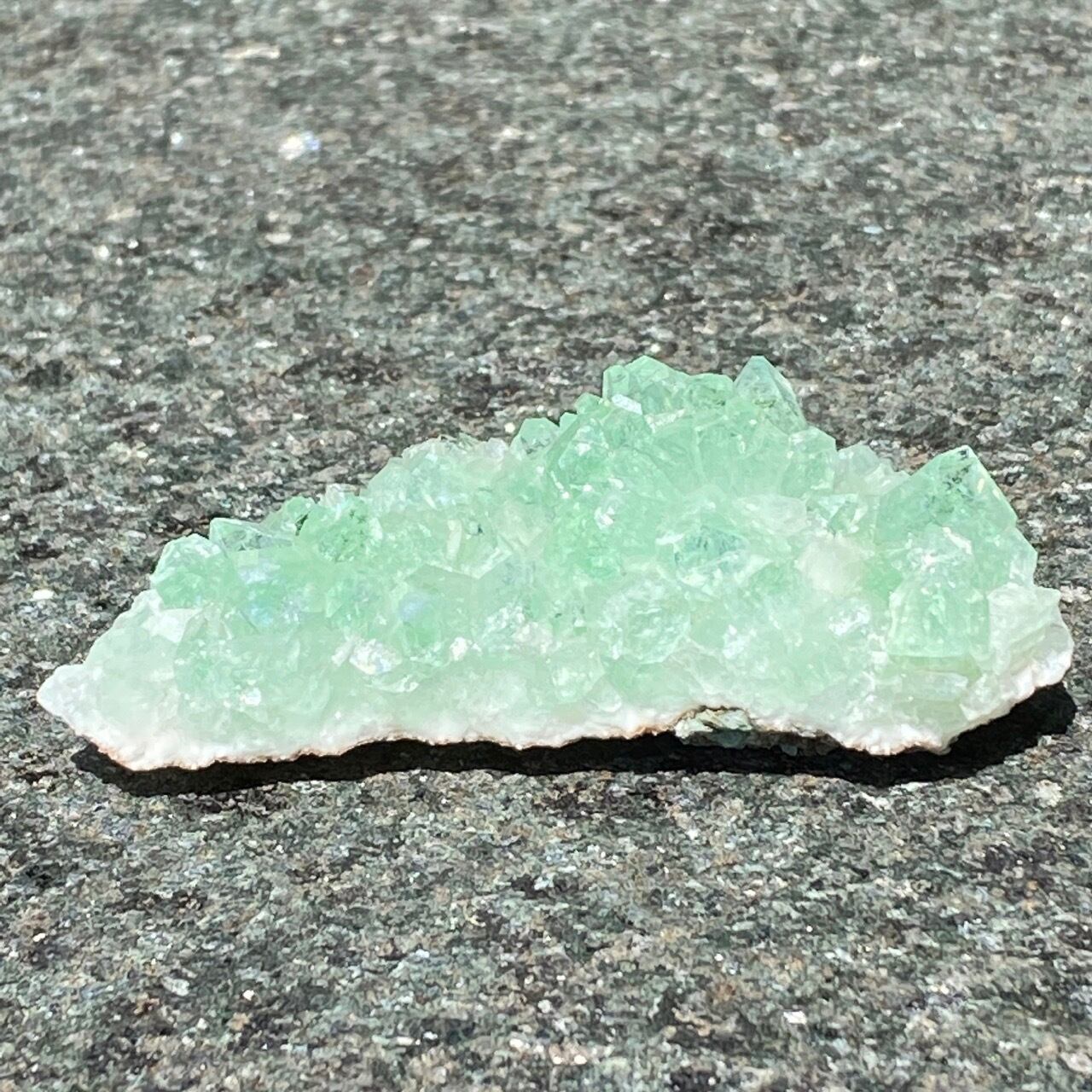 アポフィライトは大好きな石のひとつ。砂糖菓子のようなアポフィライトの独特でシルキーな艶感はダイヤモンドや水晶とまた違って美しく、魅力的です。それも目に優しいグリーンで透明感があります。クラスターなので、色々な方向からファセットの表情や艶感、そして透明感を楽しめます。