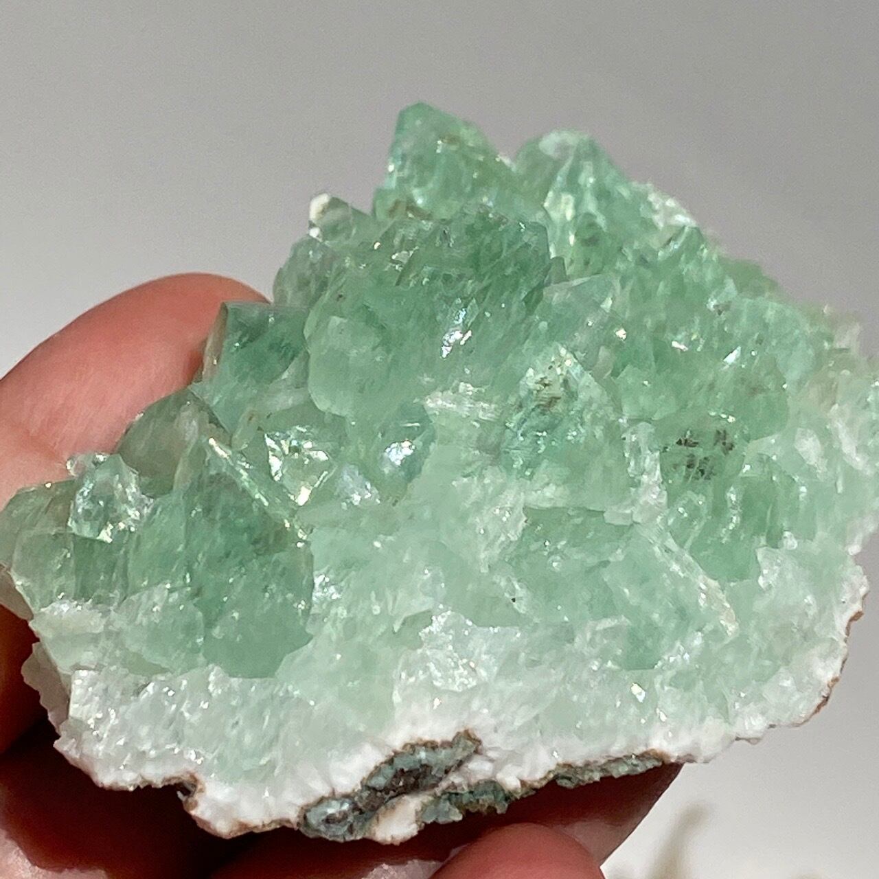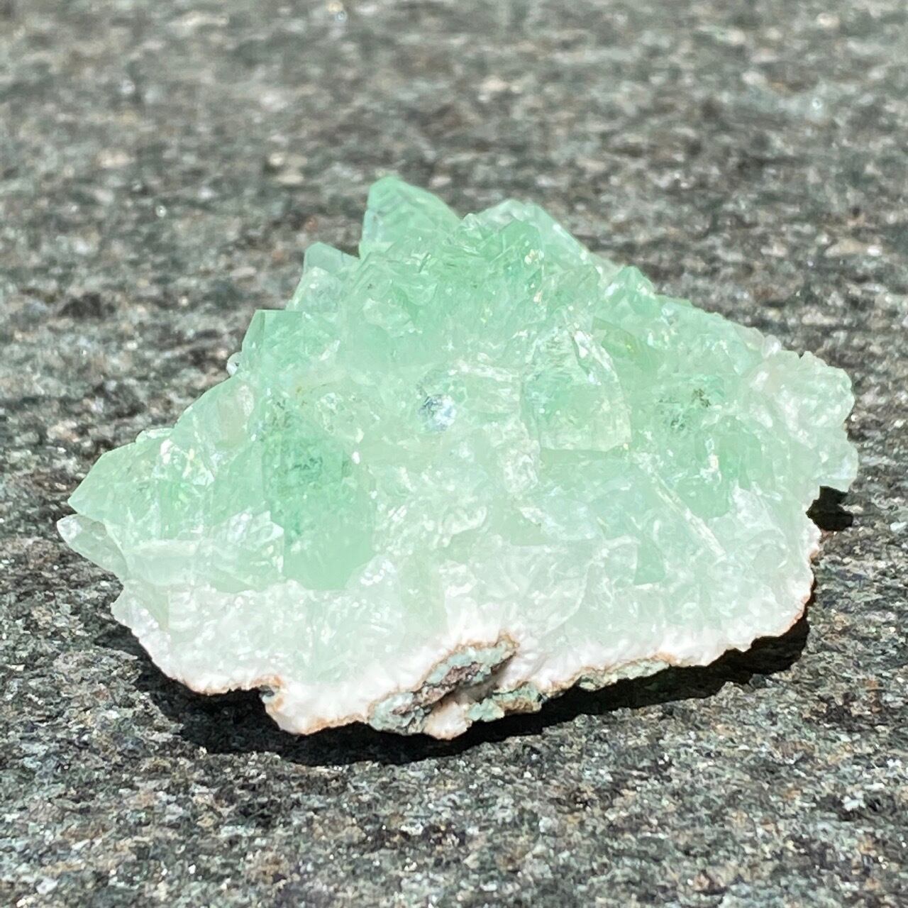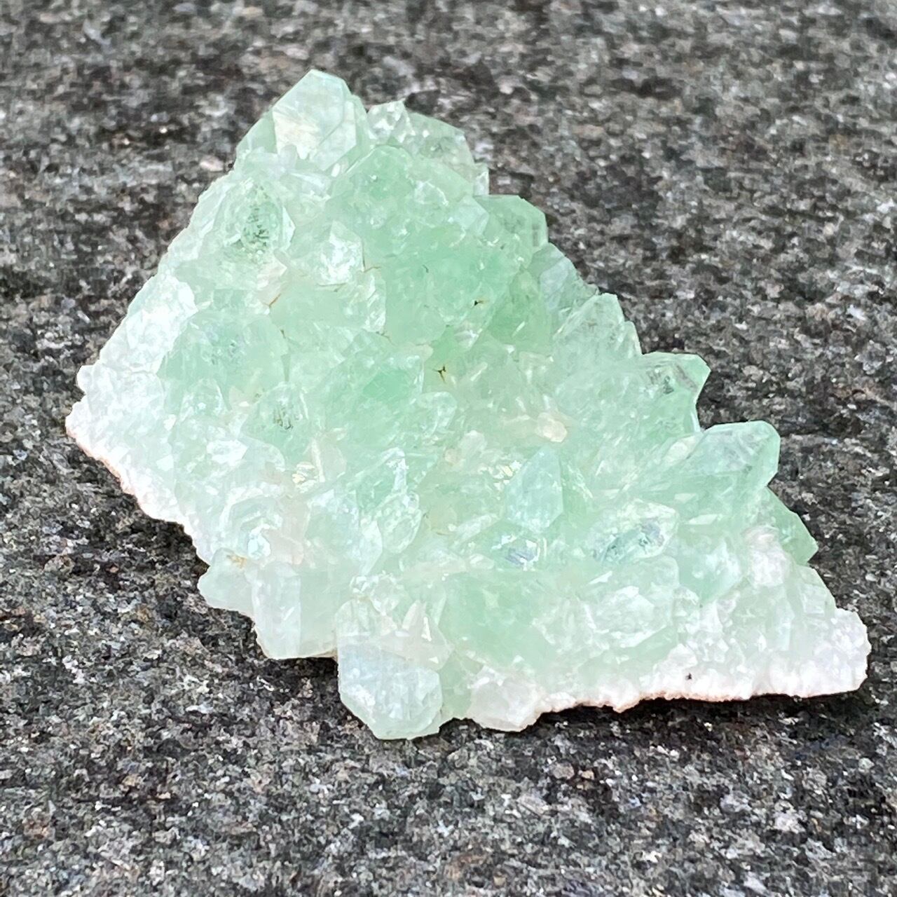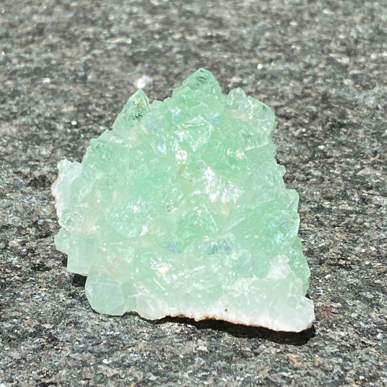 アポフィライトは大好きな石のひとつ。砂糖菓子のようなアポフィライトの独特でシルキーな艶感はダイヤモンドや水晶とまた違って美しく、魅力的です。それも目に優しいグリーンで透明感があります。クラスターなので、色々な方向からファセットの表情や艶感、そして透明感を楽しめます。