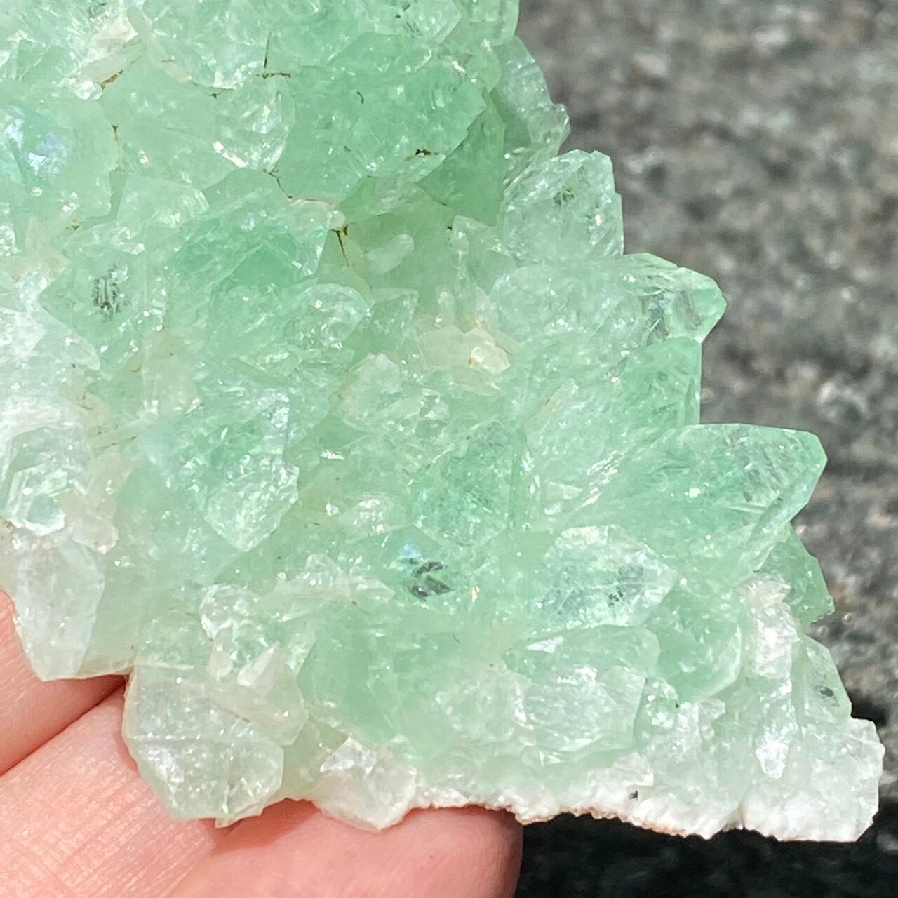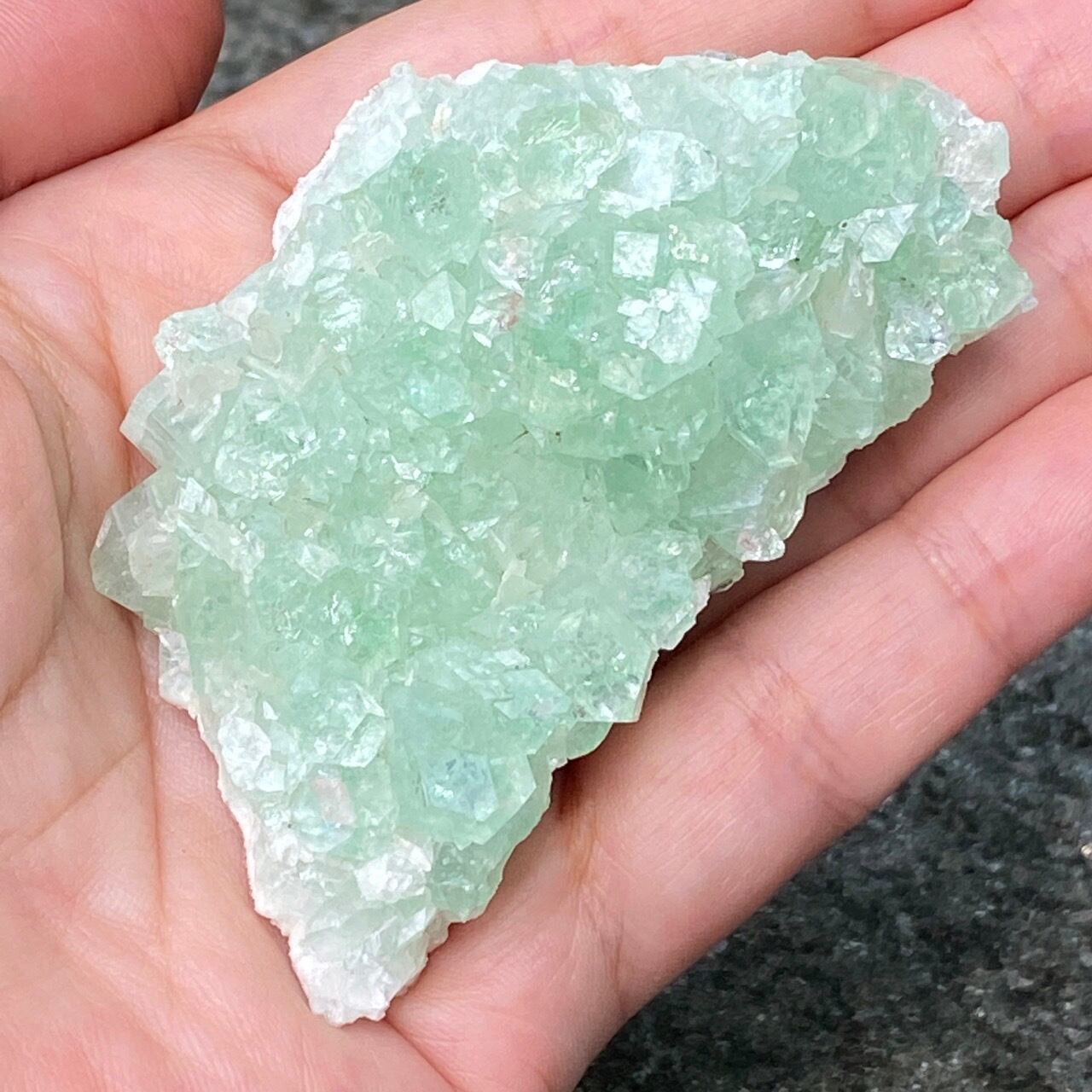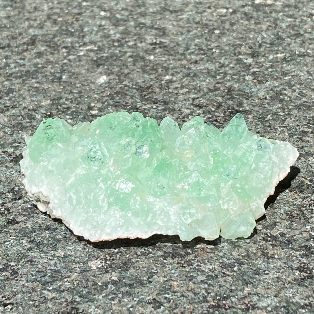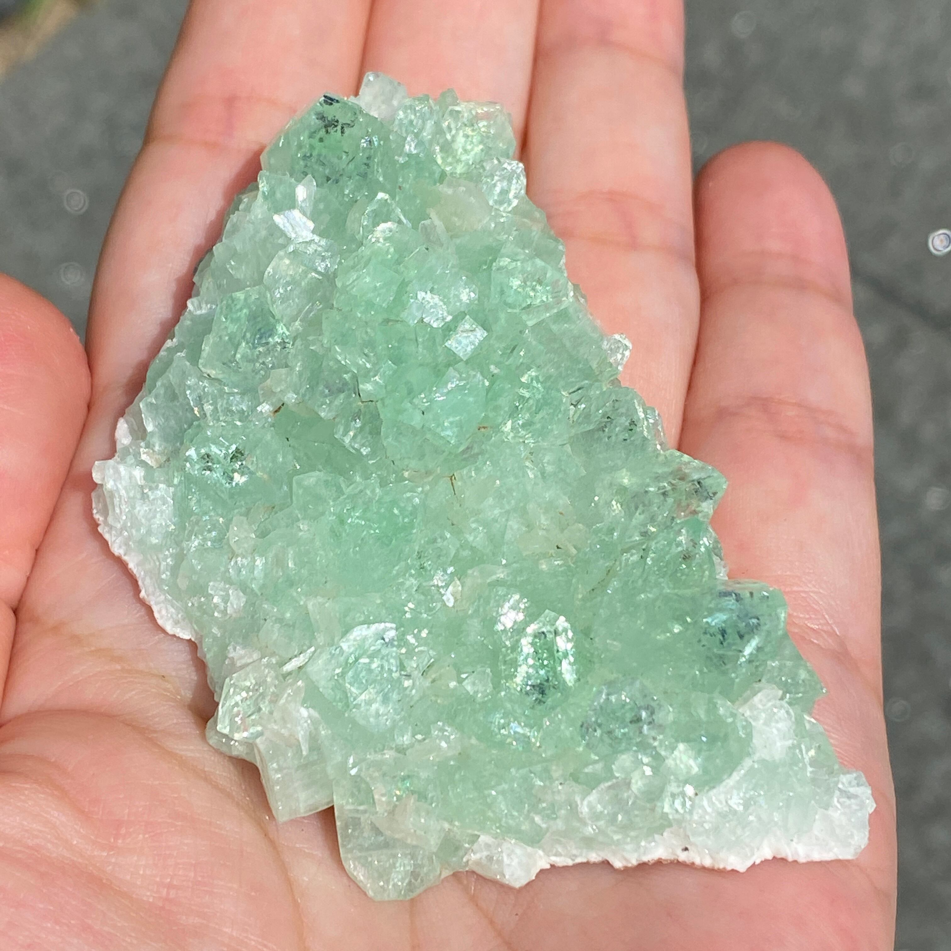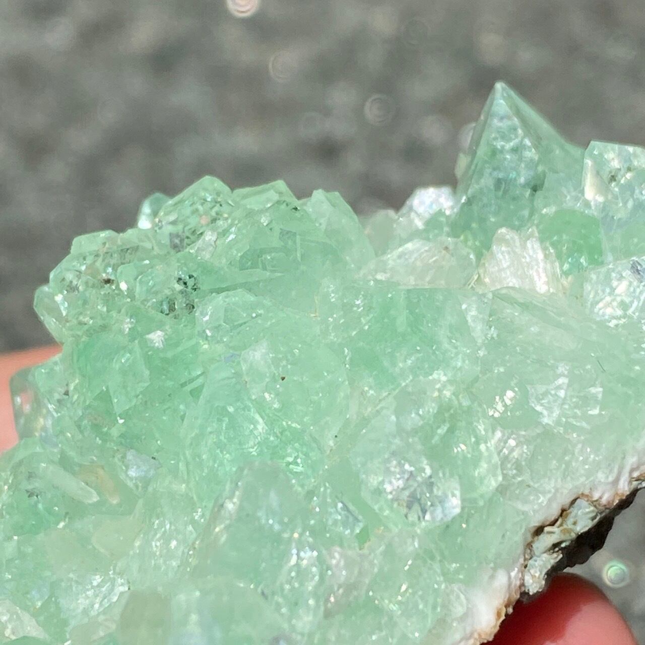 アポフィライトは大好きな石のひとつ。砂糖菓子のようなアポフィライトの独特でシルキーな艶感はダイヤモンドや水晶とまた違って美しく、魅力的です。それも目に優しいグリーンで透明感があります。クラスターなので、色々な方向からファセットの表情や艶感、そして透明感を楽しめます。
