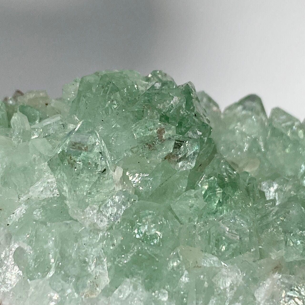 アポフィライトの中でも産出量が少ないため希少性が高い、インド産のグリーンアポフィライトのクラスターです。微量のバナジウムを多く含んでいるほどその緑色が濃くなります。