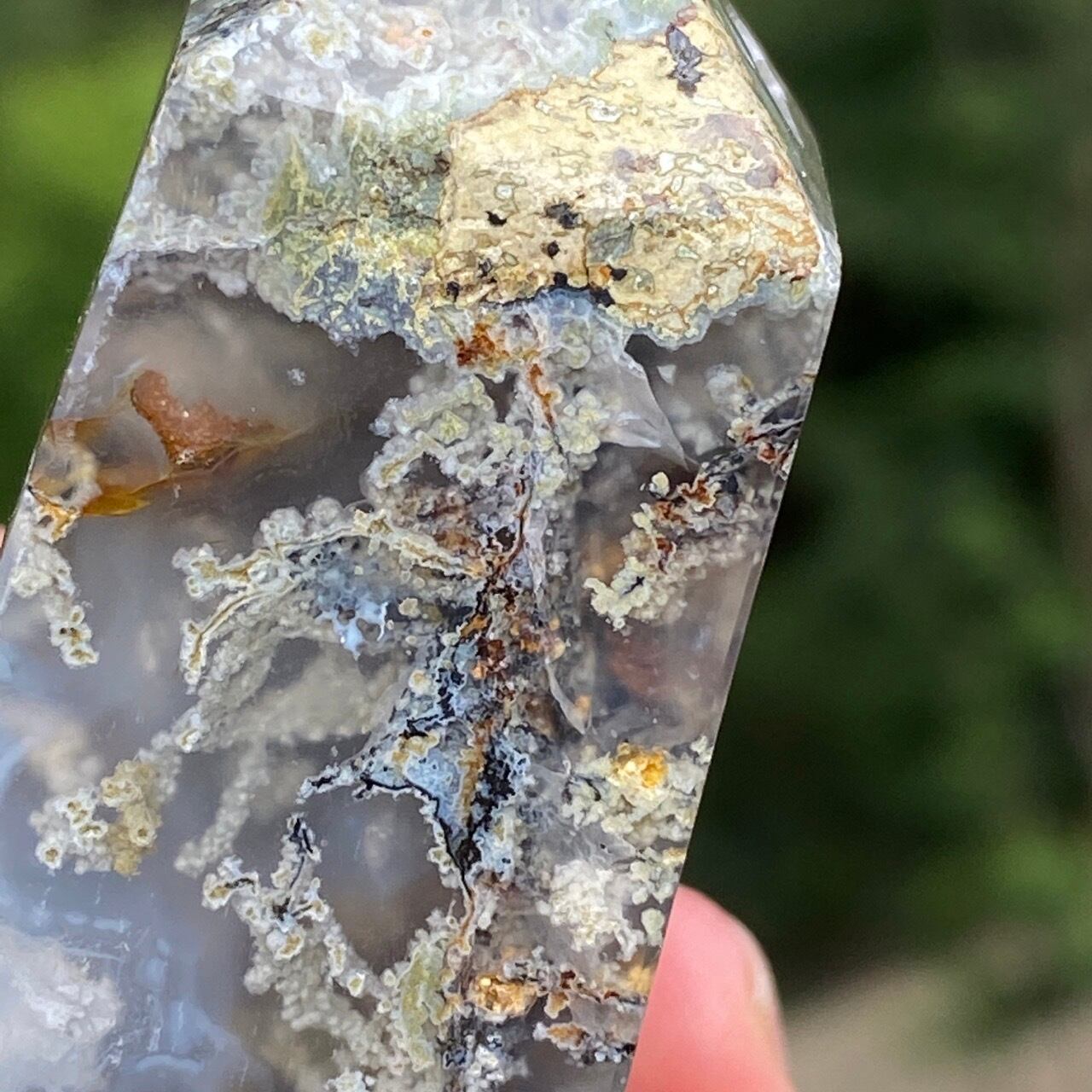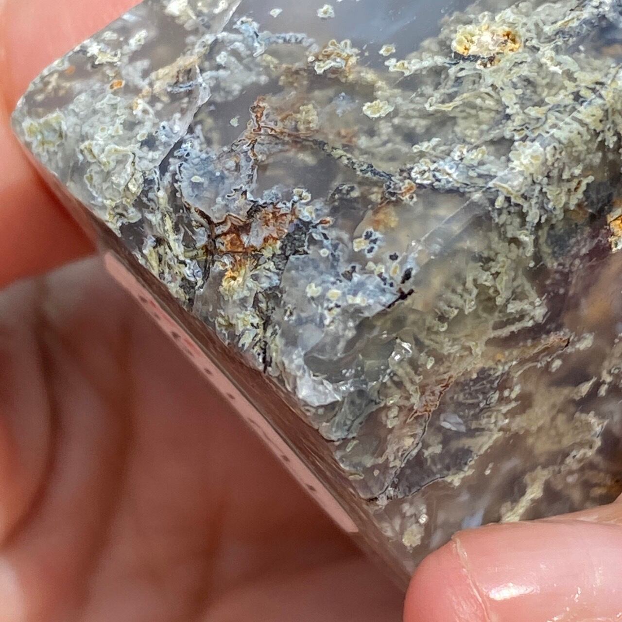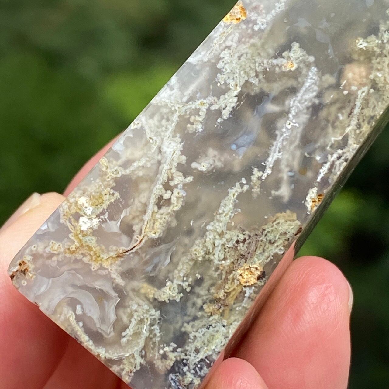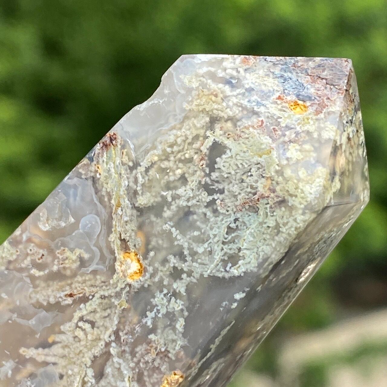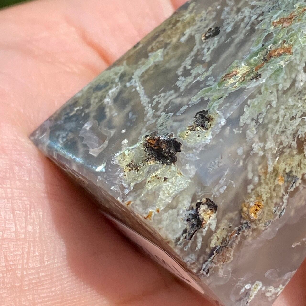 モスアゲートは瑪瑙(メノウ)の中に緑色や赤色、黒色などの内包物が入り、それが苔や樹形(木の枝)のような模様に見えるのが特徴です。