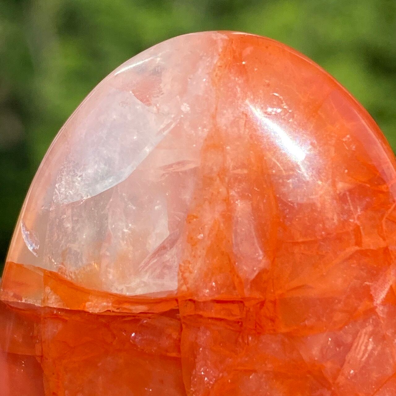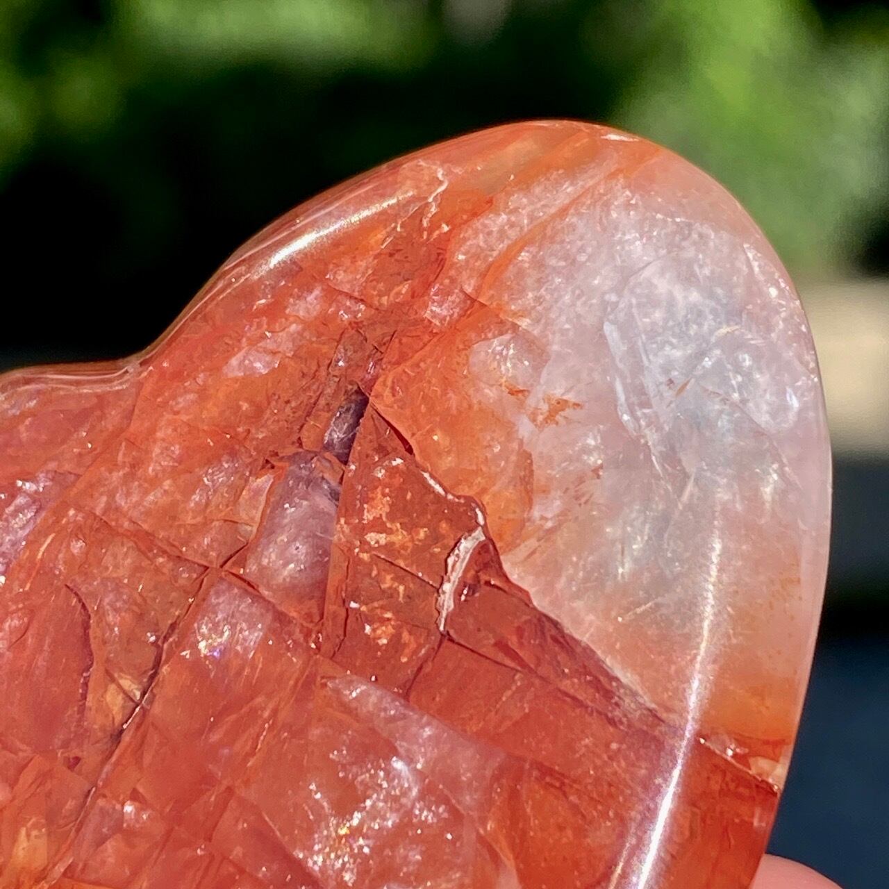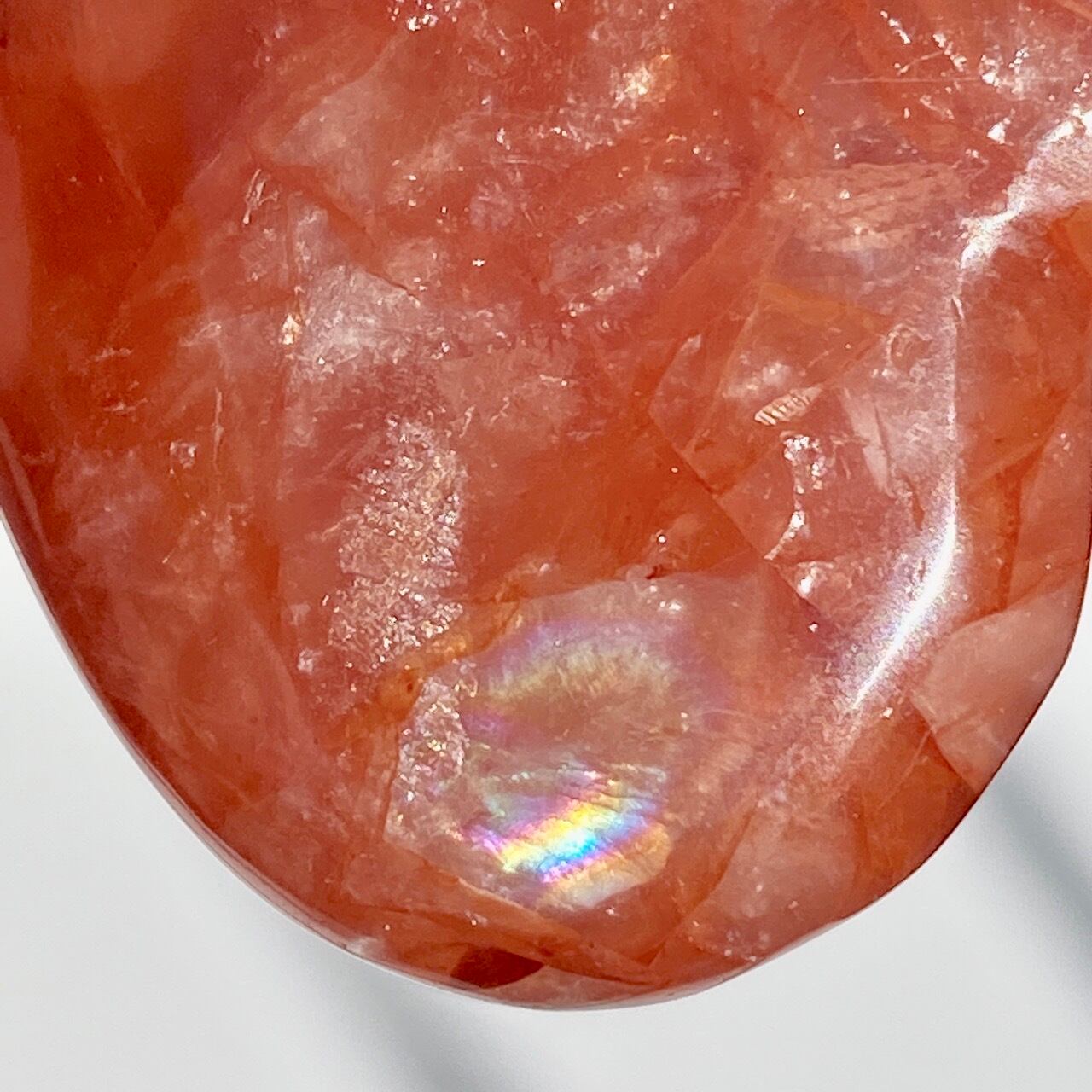 この石の特徴である内部および表面に見られる複雑なクラックとレピドクロサイトのインクルージョンがあいまって、色々な角度から表情を楽しむ事ができます。