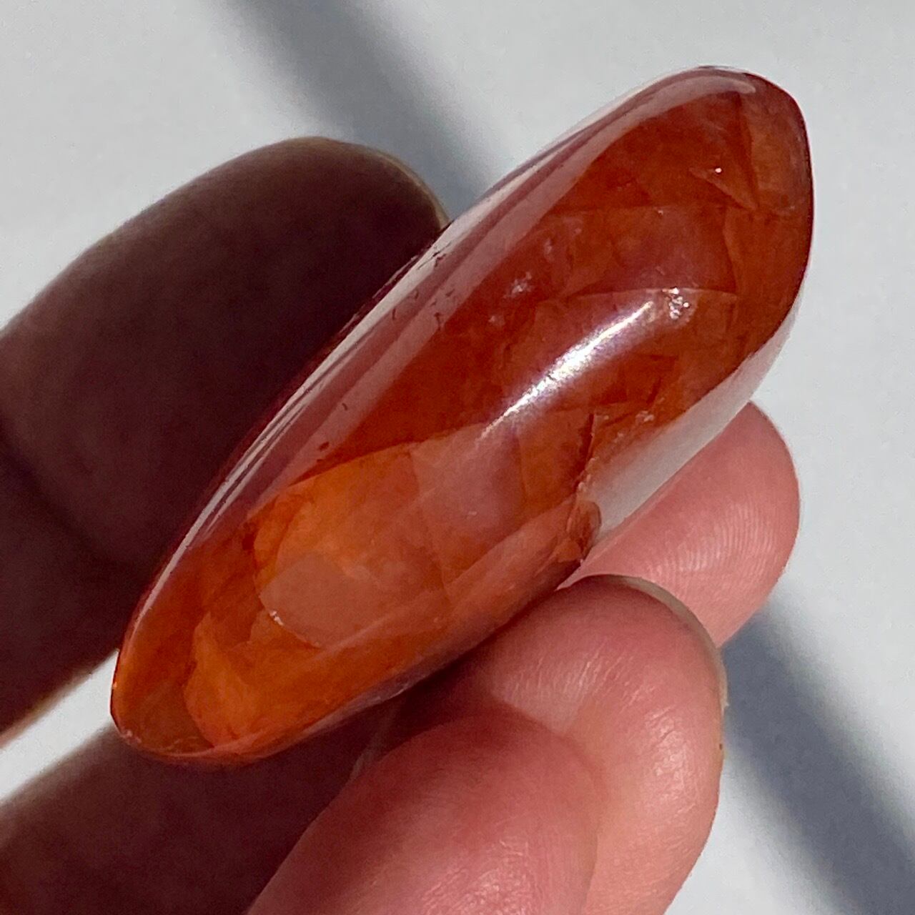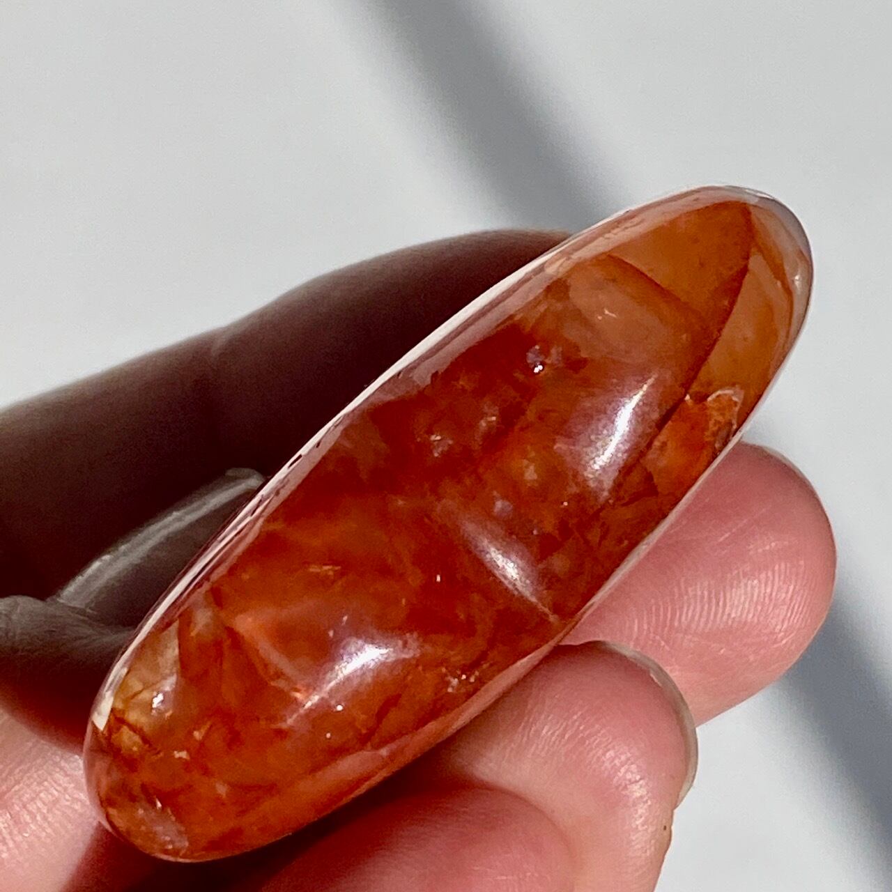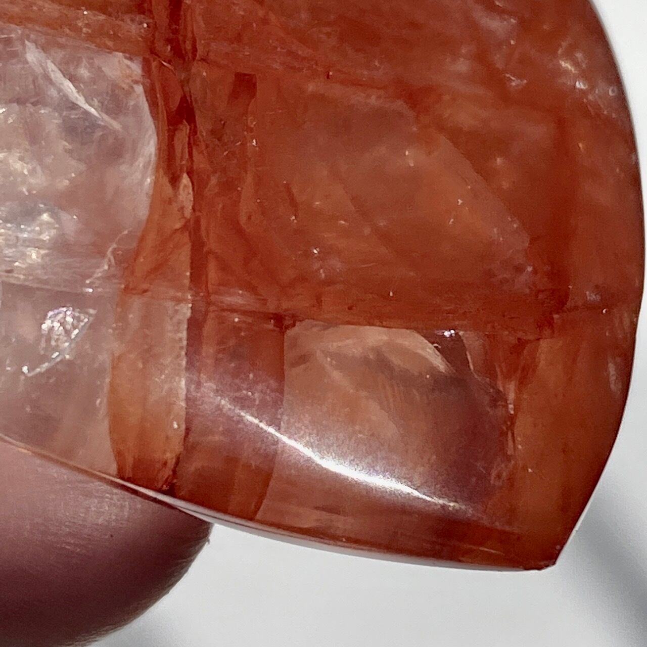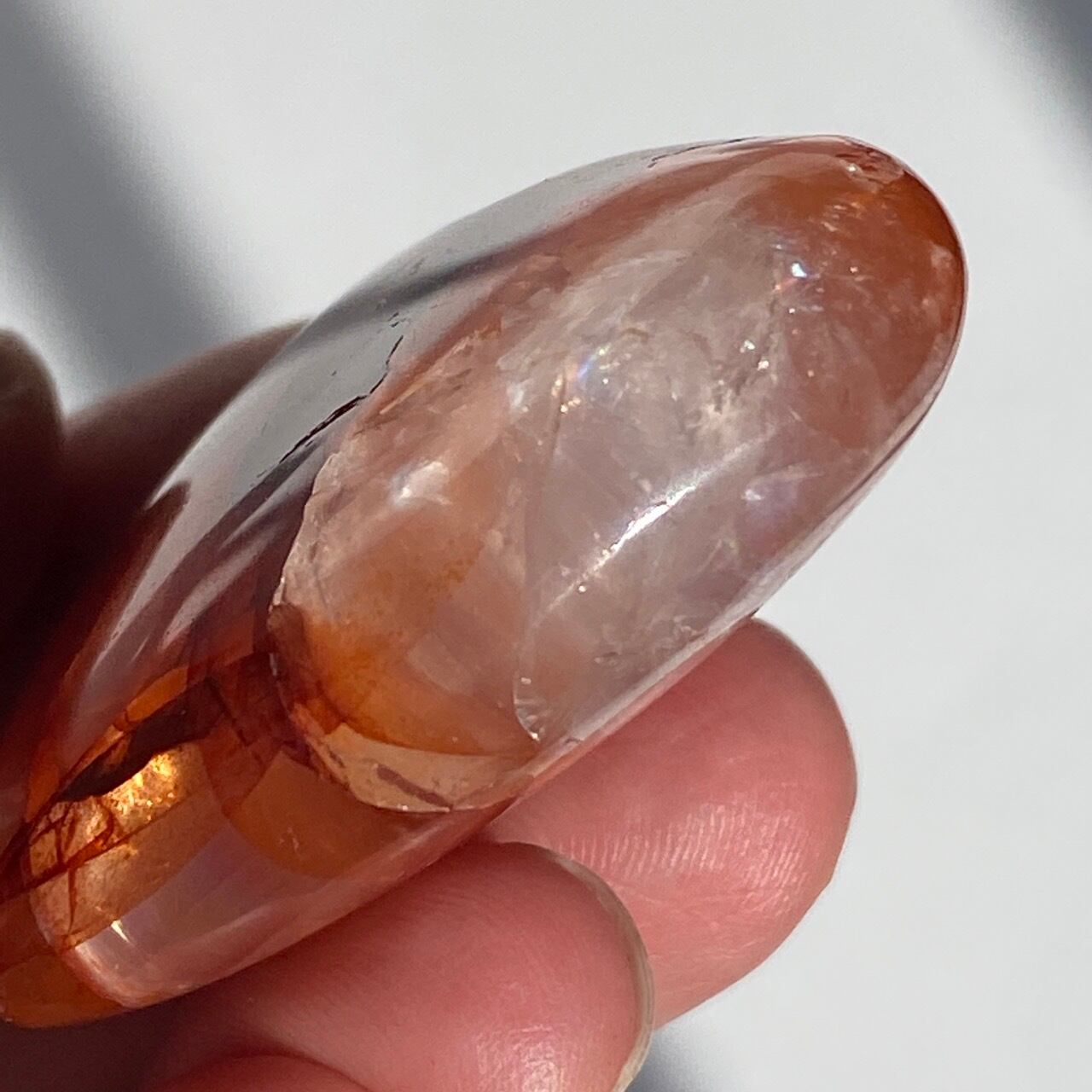この石の特徴である内部および表面に見られる複雑なクラックとレピドクロサイトのインクルージョンがあいまって、色々な角度から表情を楽しむ事ができます。