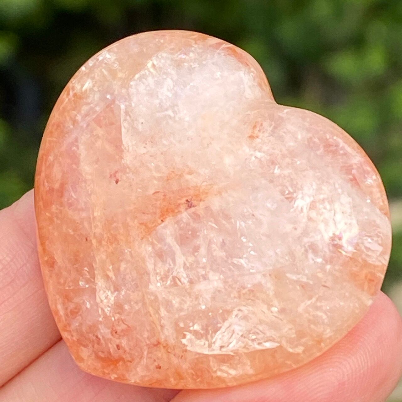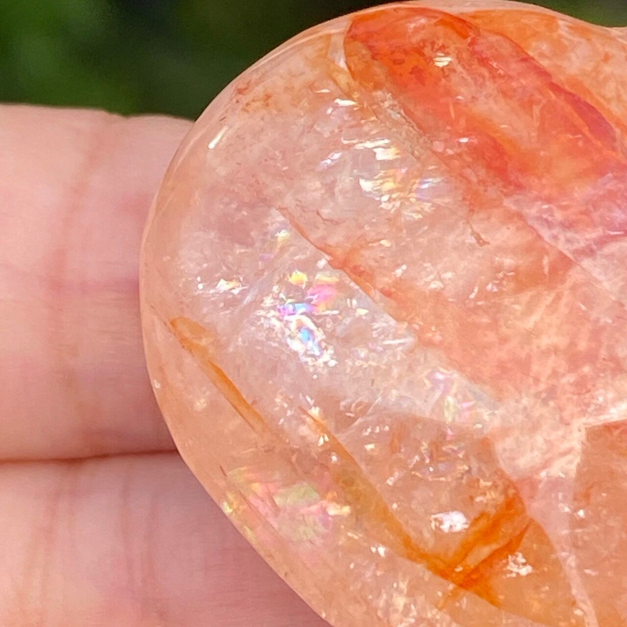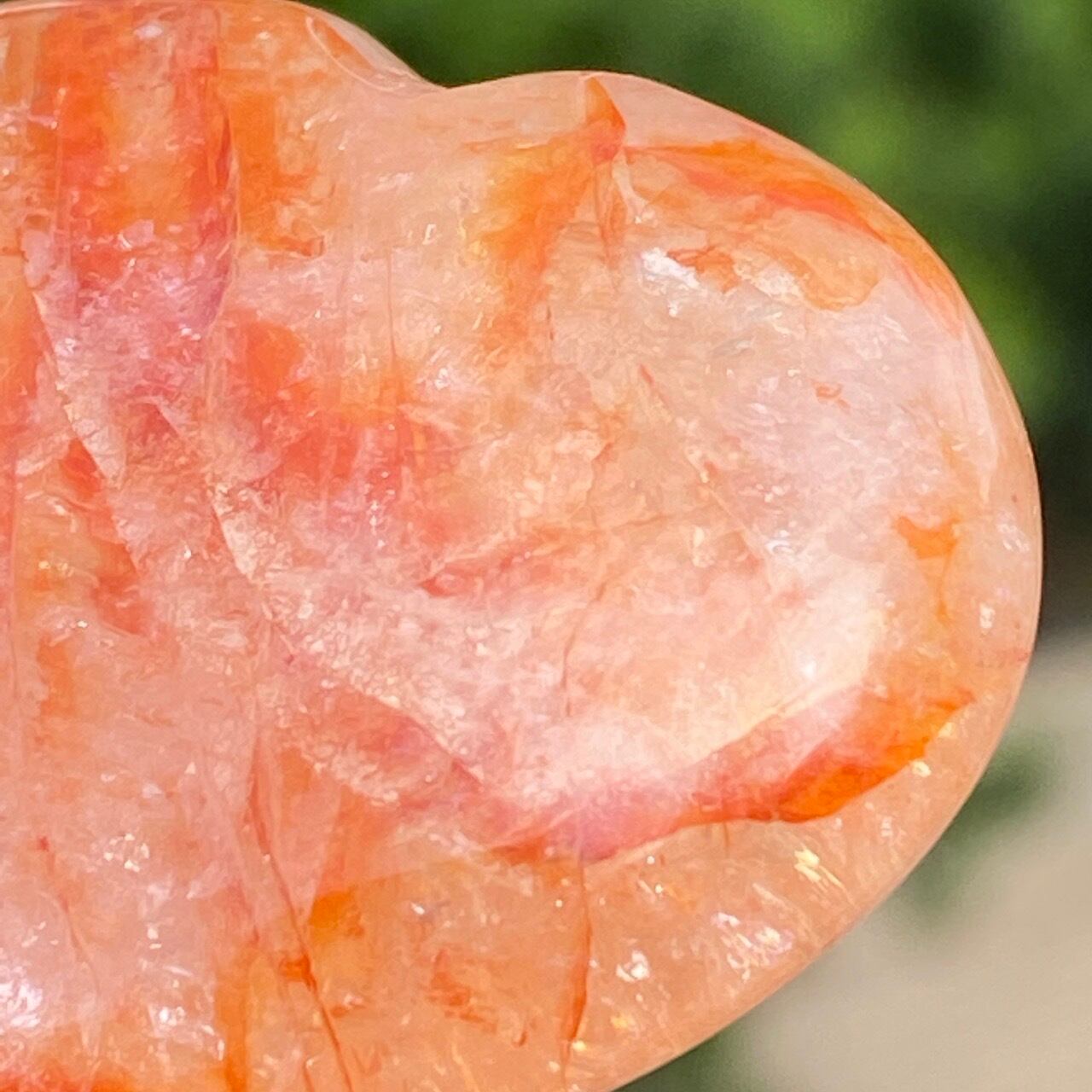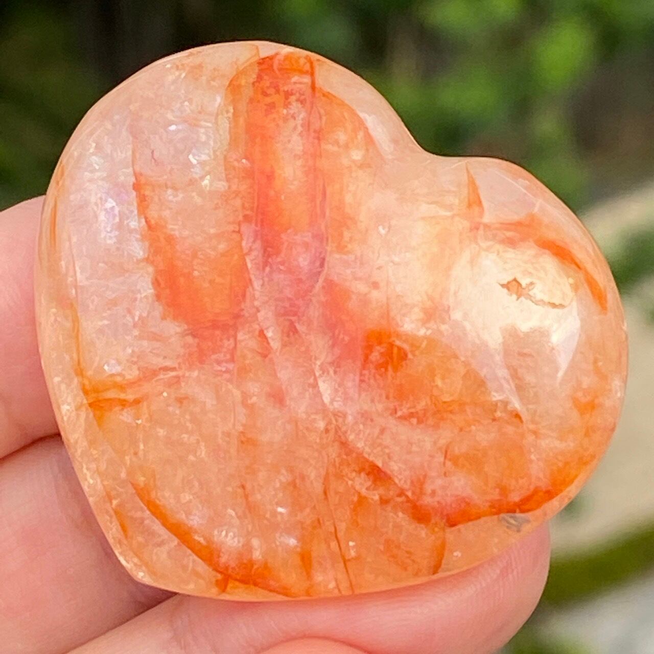 今回のファイアークォーツのハートの中で最も全体的に輝いていてラメ感に富んだ、虹入りの子です。裏側は赤いインクルージョンは少なく、2wayで楽しめます。
